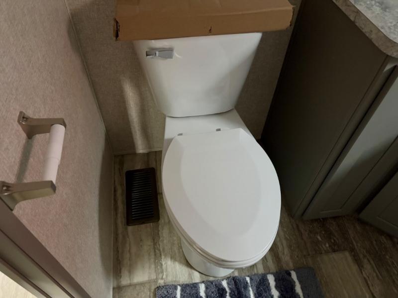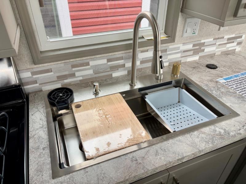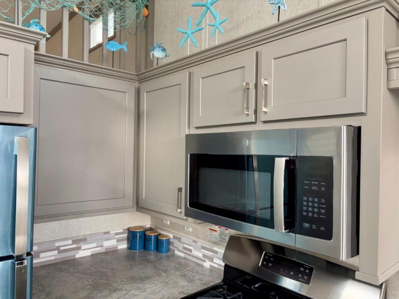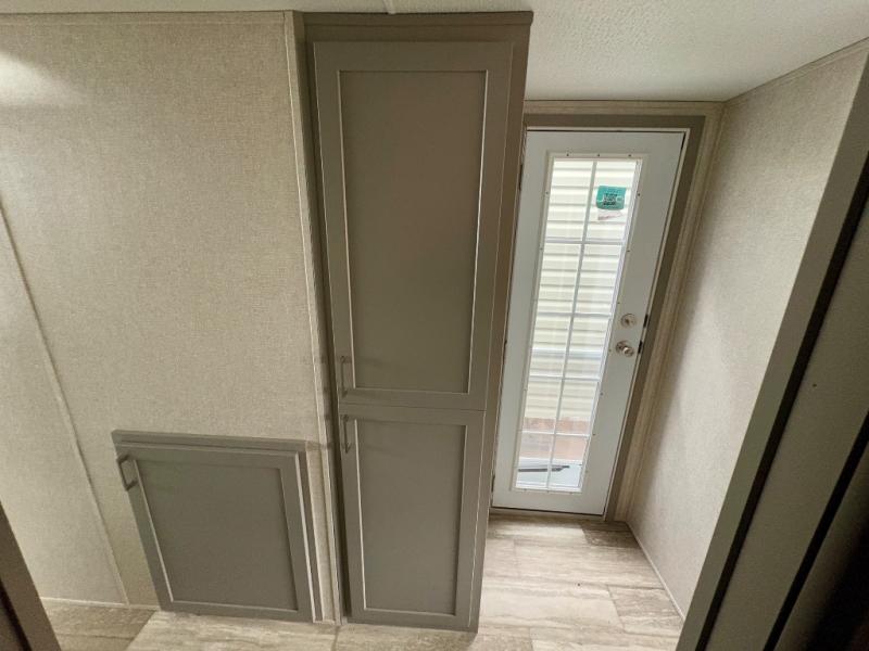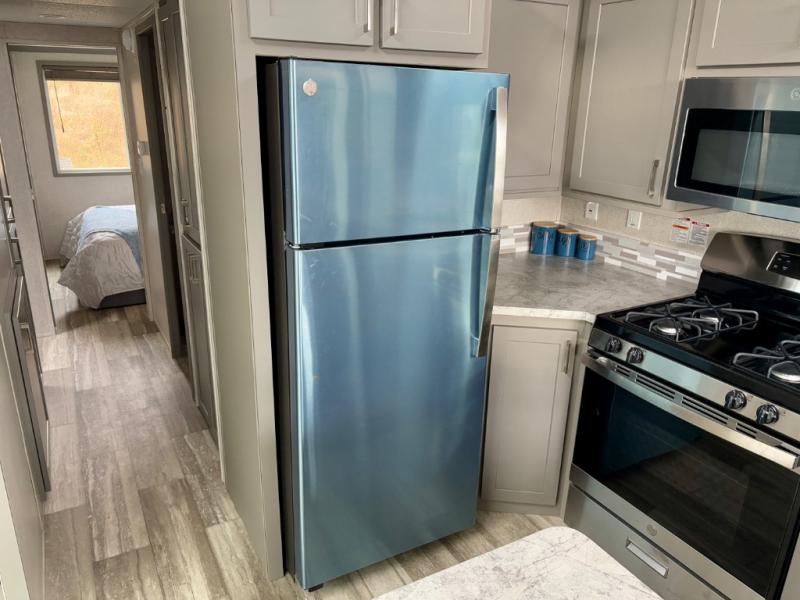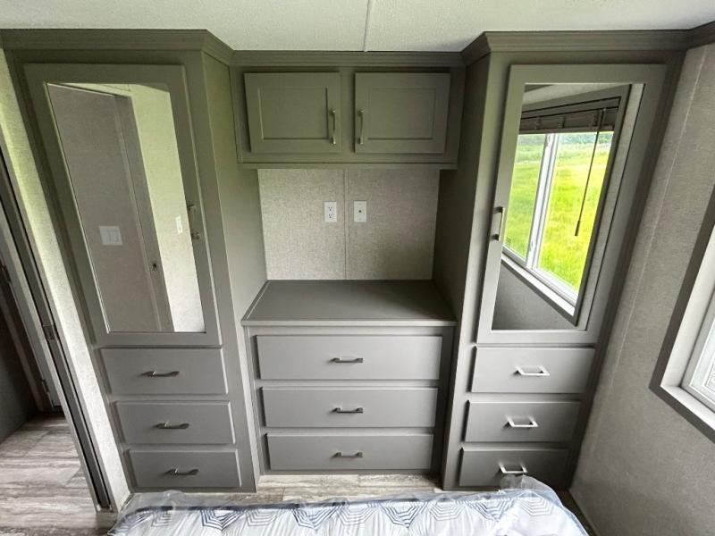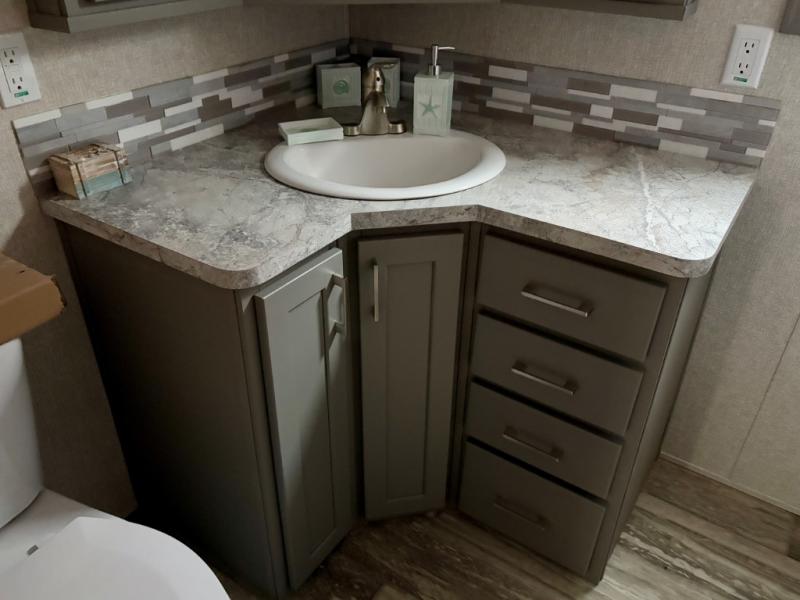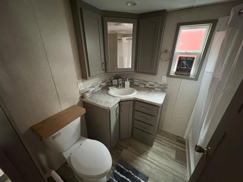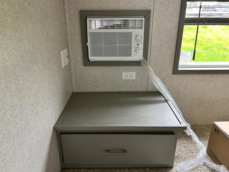 Ready or not the comforts of your own bedding, furniture, kitchen and bath amenities will be waiting for you in this park model at your ranch, lake spot or farm. As you enter the patio doors after a long work week, you can drop off all the food on the raised counter and head back to the rear bedroom to place your clothes and things in the closets with drawers, the chest, and on the nightstands. You might want to take a nap on the Eurotop residential queen bed, yet you will need to put up the cold food in the 17.5 cu. ft. frost free refrigerator first. You will surely love all the kitchen counter space including the raised area to dine at. You might like to replace the hide-a-bed sofa with an L-shaped sofa option in the front living area. And don't worry about the kids, they are probably up stairs in the divided loft placing their sleeping bag and pillow in their spot.