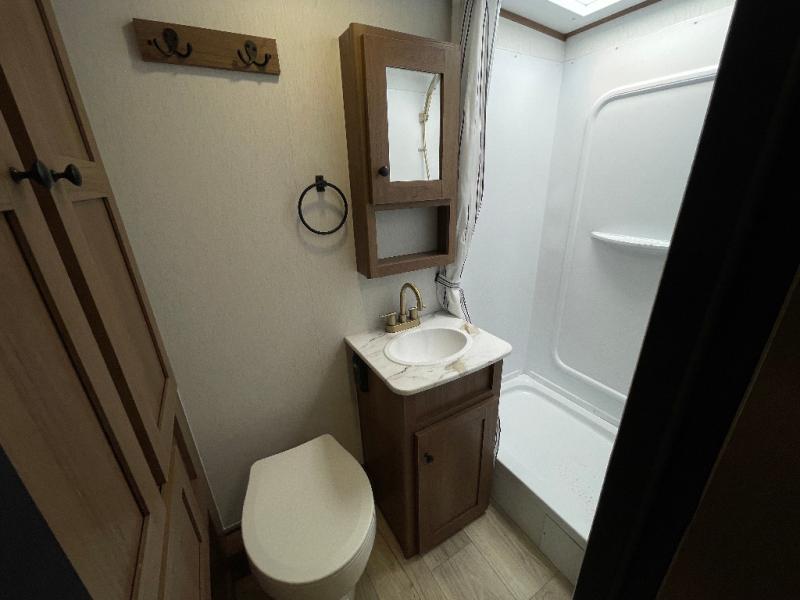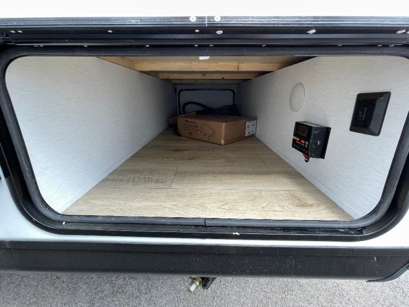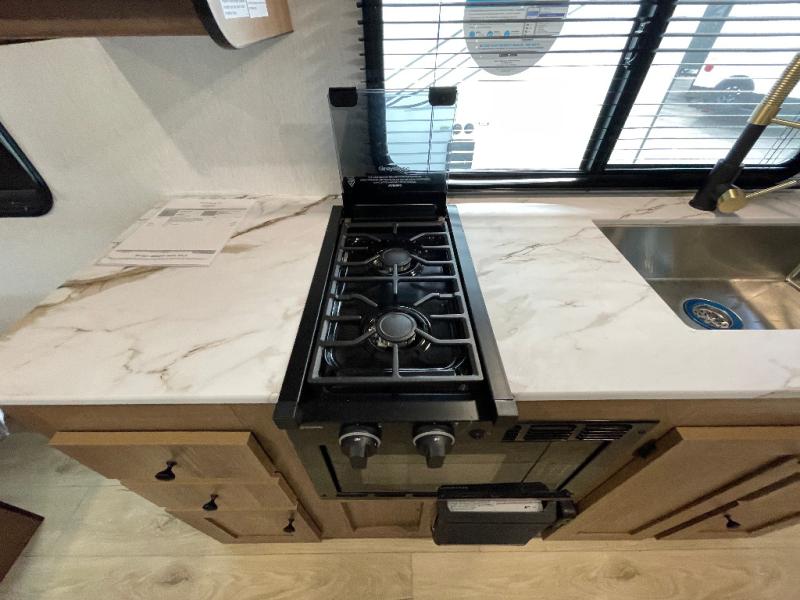 Whether you camp with friends, family or solo, this trailer gives you space for all with a spacious main living and kitchen area thanks to the booth dinette slide! The rear full bath offers a shower, sink, toilet and a wardrobe so you can get ready in privacy. A two-burner cooktop and microwave underneath will let you make meals each day, and the 12V refrigerator will be perfect for perishables. The walk-around queen-size bed provides convenience when getting in and out of bed and there are two wardrobes and overhead cabinets to keep your belongings up and away. The power awning protects you from the elements when relaxing outside, and the exterior pass-through storage gives you a place to stow the outdoor equipment like camping chairs, tables, fishing poles and charcoal.