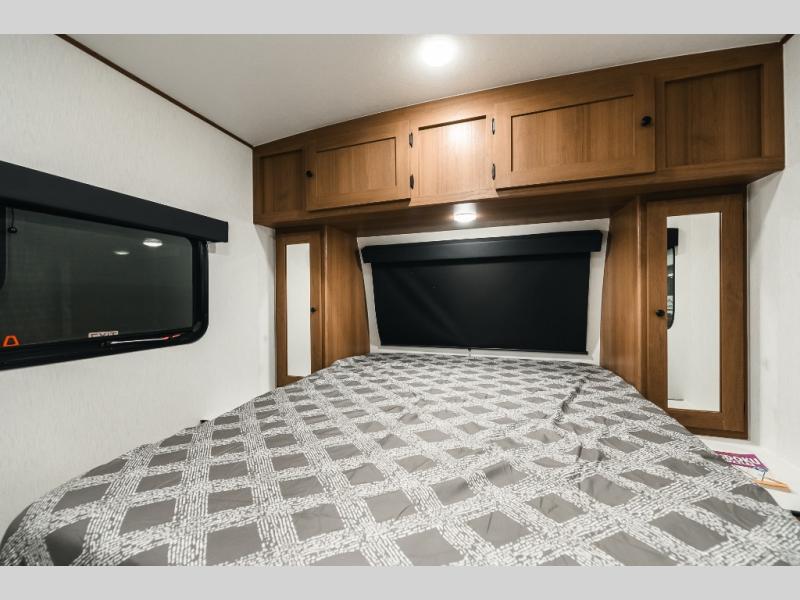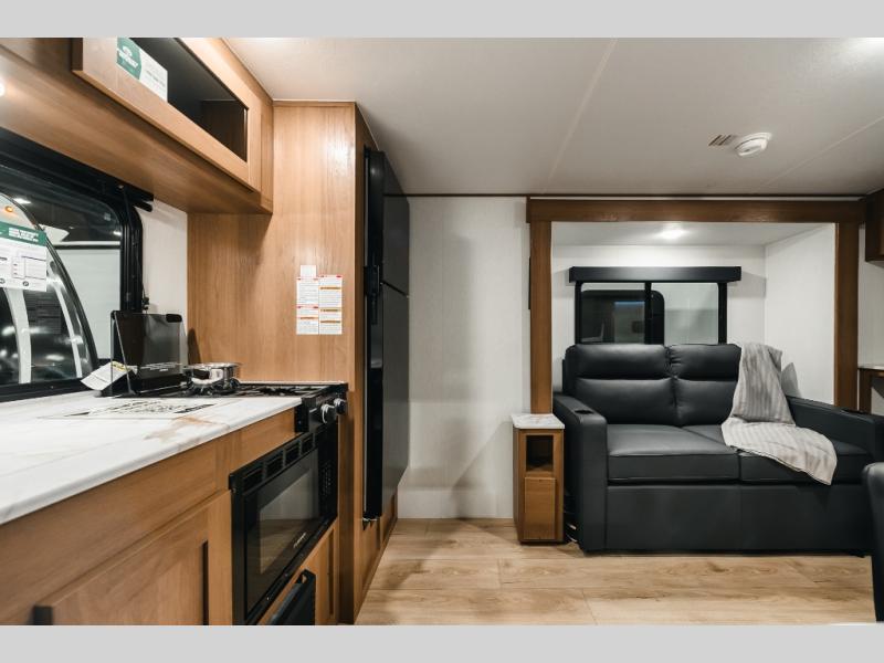 As you step inside, you’re welcomed by a spacious rear kitchen that spans the full width of the trailer, making meal prep both convenient and enjoyable. The kitchen is equipped with a stainless-steel sink featuring a flush mount cover for added counter space, a 2-burner cooktop, an air fryer microwave, and a 10 cu. ft. refrigerator, perfect for storing all your groceries. A pantry adds even more storage for dry goods and kitchen essentials. Just in front of the kitchen, a Bar-V counter with chairs offers a great spot to dine, work, or relax with company. Across from the counter, a comfortable sofa slide provides a cozy lounging area and can also convert into an extra sleeping space when needed. Moving forward, the walk-through bathroom features a shower, a skylight for natural light, and a foot flush toilet for added convenience. At the front of the trailer, the private bedroom includes a queen bed flanked by wardrobes on each side, offering both comfort and practical storage for all your essentials.