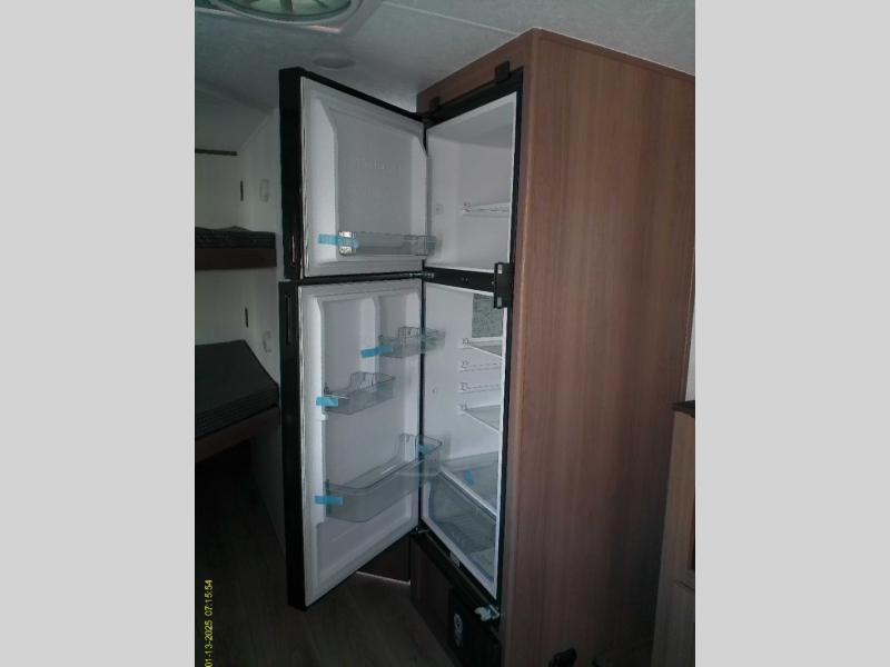As you step into this trailer, you're welcomed by a private front bedroom featuring a comfortable queen bed, perfect for a restful night's sleep, in between dual wardrobes to neatly store your clothes and essentials. Moving to the center of the space, the dinette nestled in the slide-out offers a cozy spot to dine, gather, or convert into an extra-sleeping area if needed. Just beside it, the 10-cu. ft. refrigerator provides ample space to keep your groceries fresh. Opposite the dinette, the fully equipped kitchen makes cooking on the road a breeze, complete with a stainless-steel sink with a flush-mount cover, an air fryer microwave, and a two-burner cooktop. Toward the rear, you’ll find 48" x 74" double bed bunks, with the lower bunk able to flip up for added flexibility, perfect for accommodating the whole crew. Adjacent to the bunks, a full bathroom adds extra convenience, eliminating the need to rely on campground facilities.