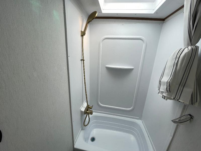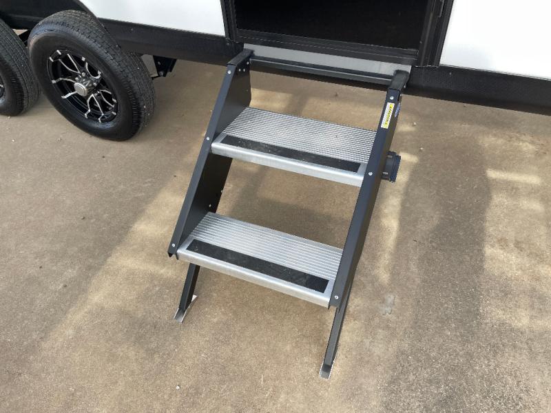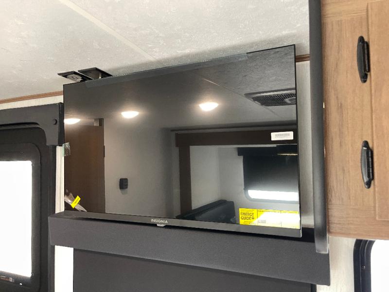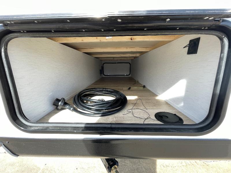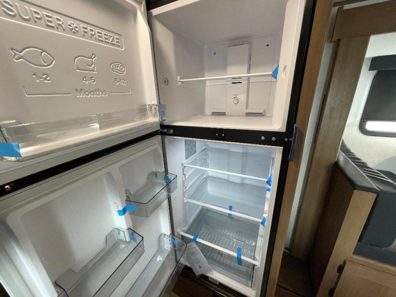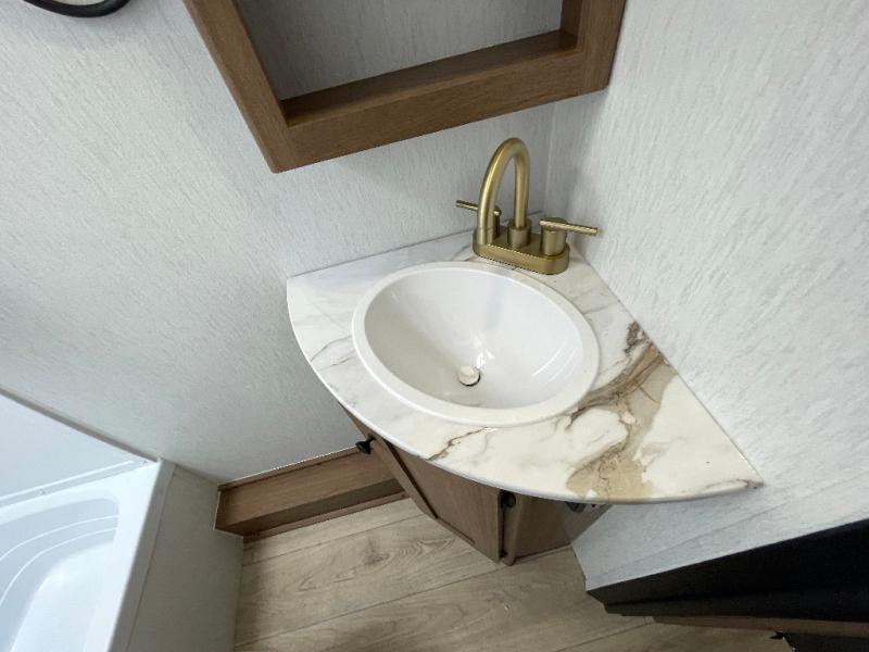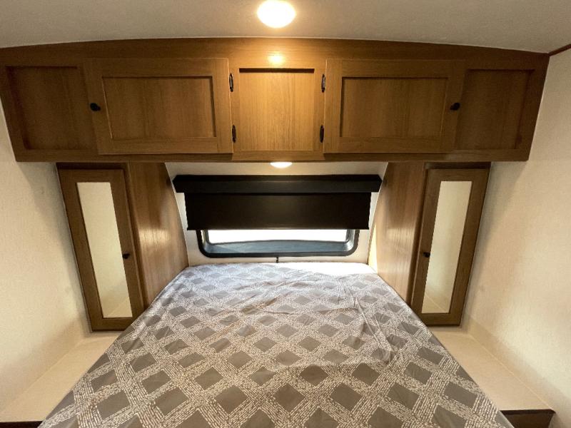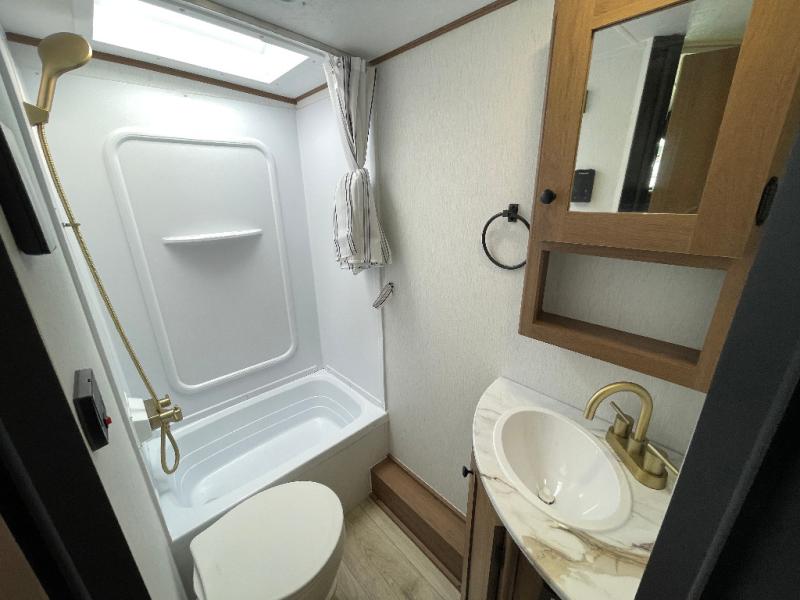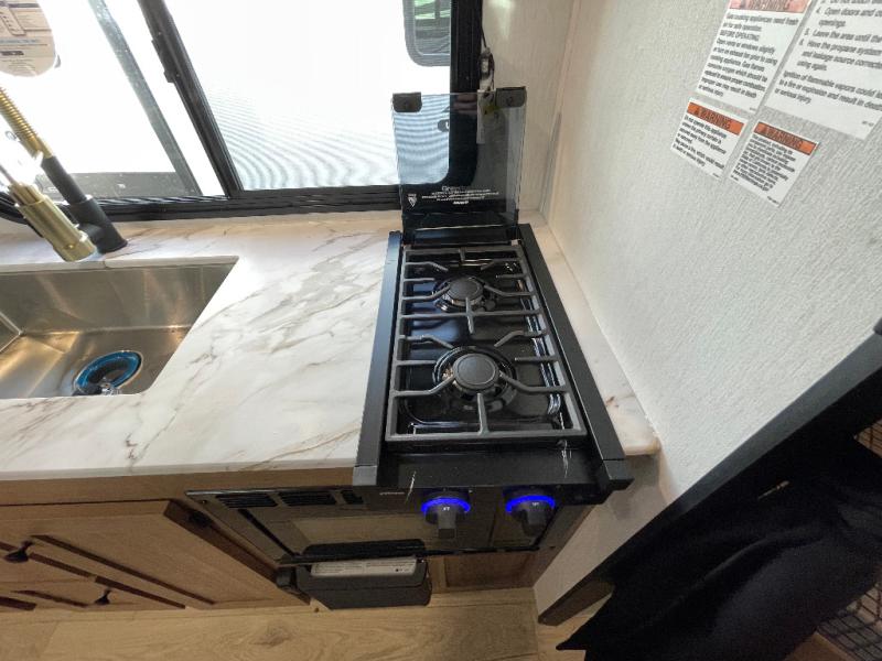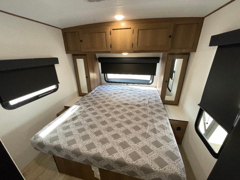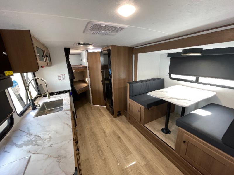 As you step into this trailer, you're welcomed by a private front bedroom featuring a comfortable queen bed, perfect for a restful night's sleep, in between dual wardrobes to neatly store your clothes and essentials. Moving to the center of the space, the dinette nestled in the slide-out offers a cozy spot to dine, gather, or convert into an extra-sleeping area if needed. Just beside it, the 10-cu. ft. refrigerator provides ample space to keep your groceries fresh. Opposite the dinette, the fully equipped kitchen makes cooking on the road a breeze, complete with a stainless-steel sink with a flush-mount cover, an air fryer microwave, and a two-burner cooktop. Toward the rear, you’ll find 48" x 74" double bed bunks, with the lower bunk able to flip up for added flexibility, perfect for accommodating the whole crew. Adjacent to the bunks, a full bathroom adds extra convenience, eliminating the need to rely on campground facilities.