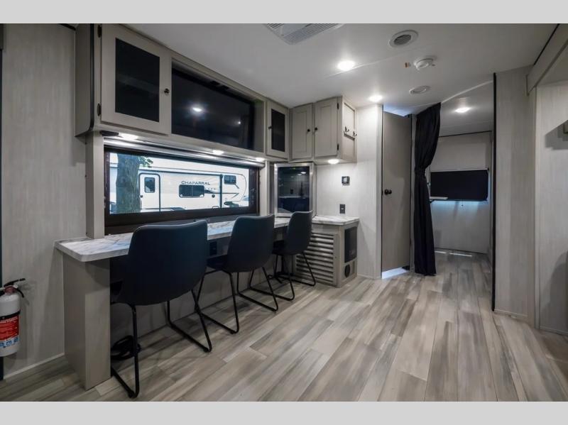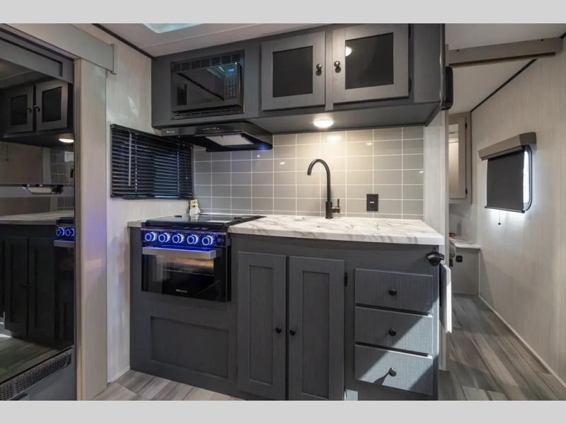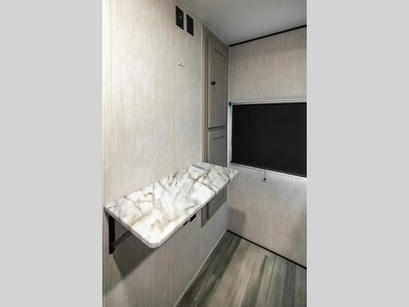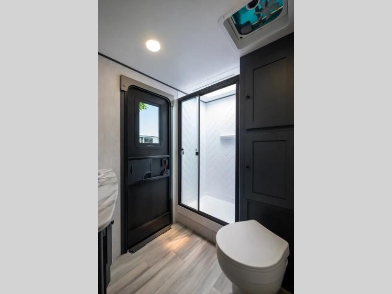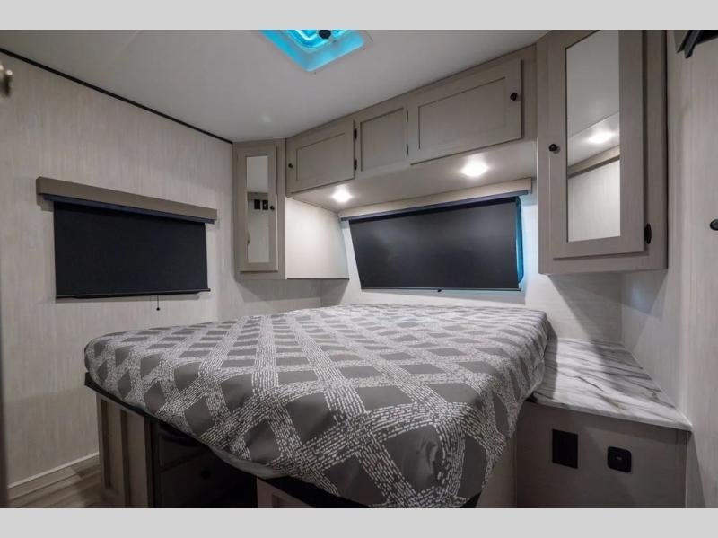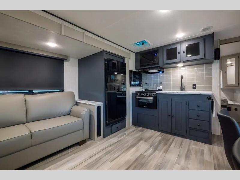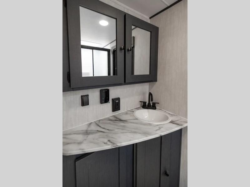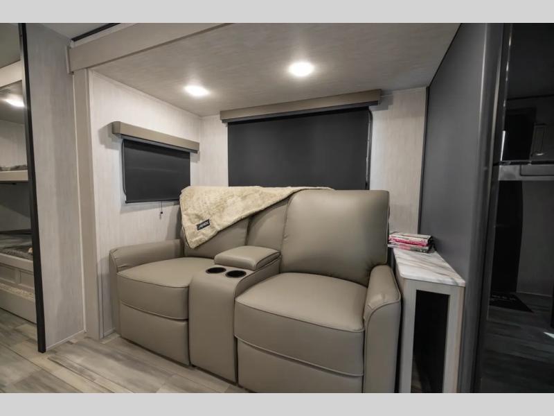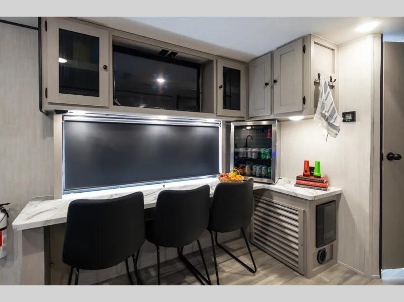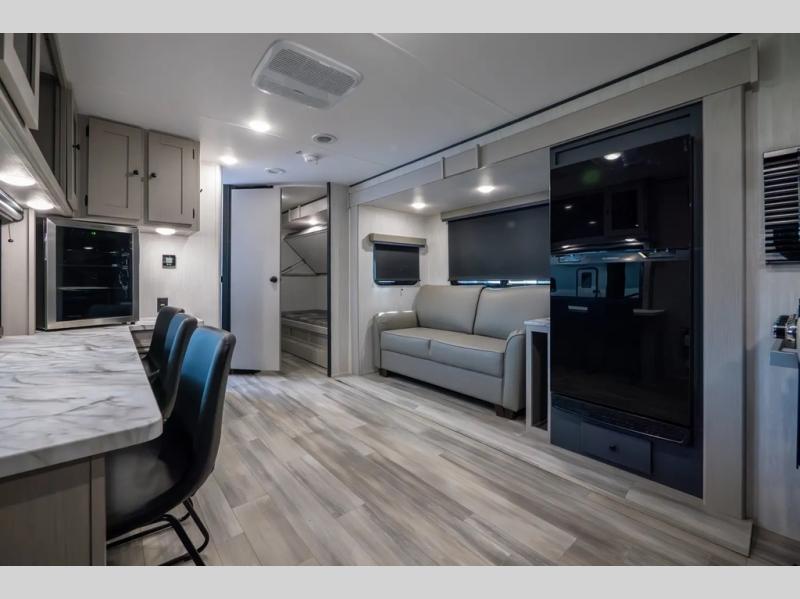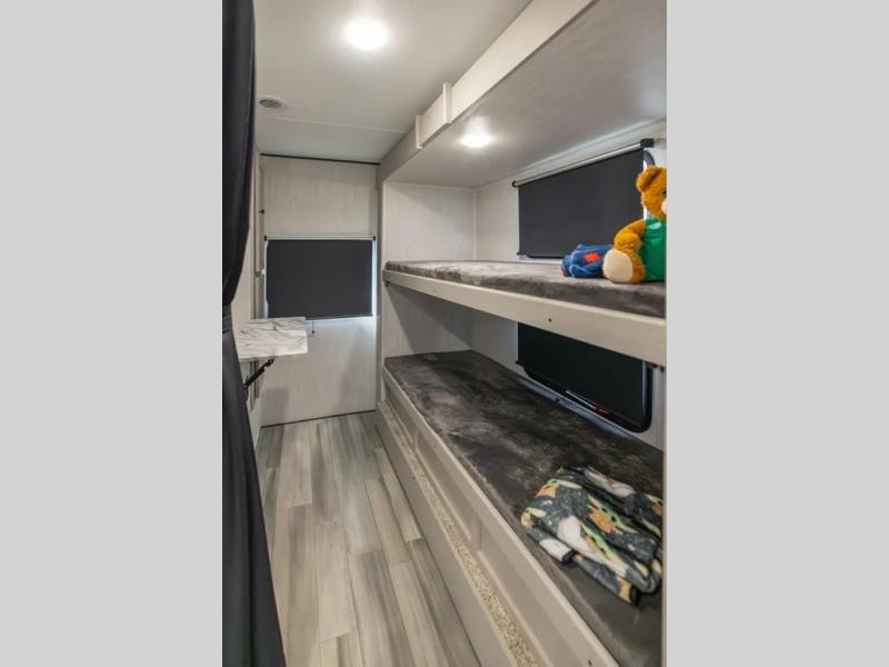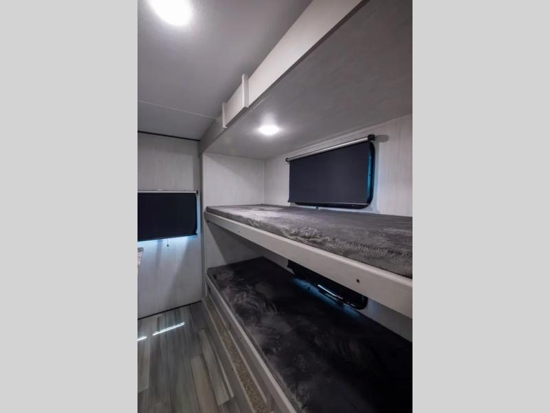This travel trailer resembles the layout of 242BARV, but you'll enjoy the added semi-private bunkhouse in this unit. There is a 30" x 74" bottom bunk with storage and a 30" x 74" tilt-up bunk above, plus a wardrobe and flip-up TV prep in the wall. The owners will enjoy the front private bedroom with a 60 x 80 queen bed with super storage, dual wardrobes beside the bed and a overhead cabinet. In the kitchen area you will find a 12V refrigerator, pantry, three burner cooktop and a bar countertop with chairs. There is also a tri-fold sofa slide for more seating and sleeping space. This unit also includes a spacious full bath with one of the dual entry doors to the unit for added convenience!