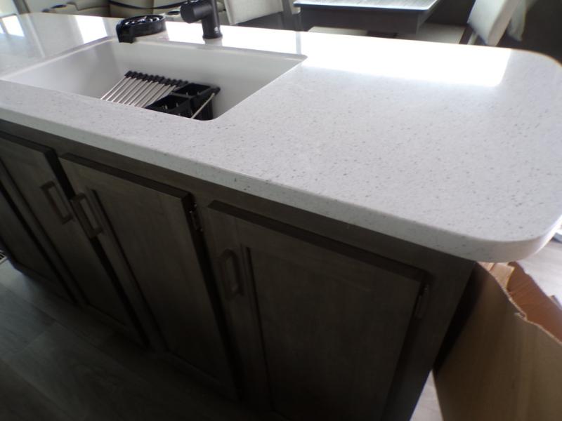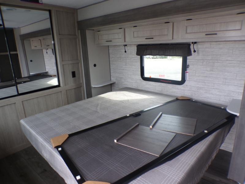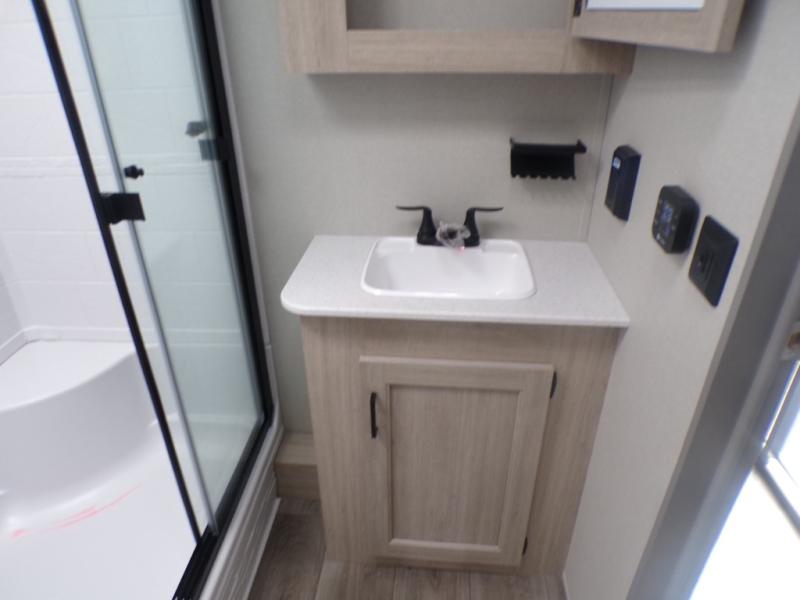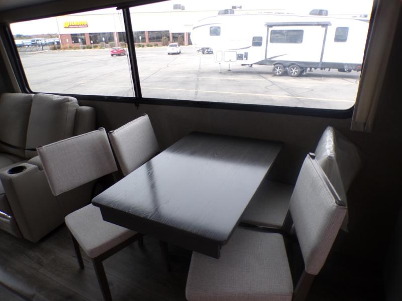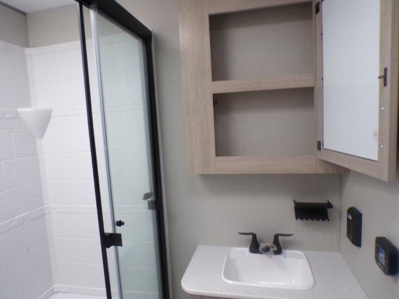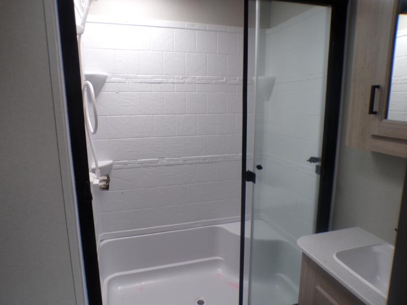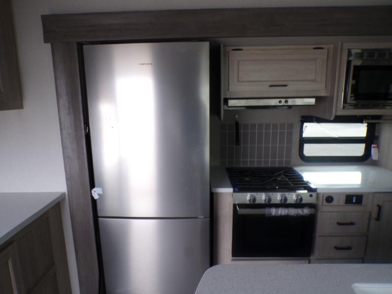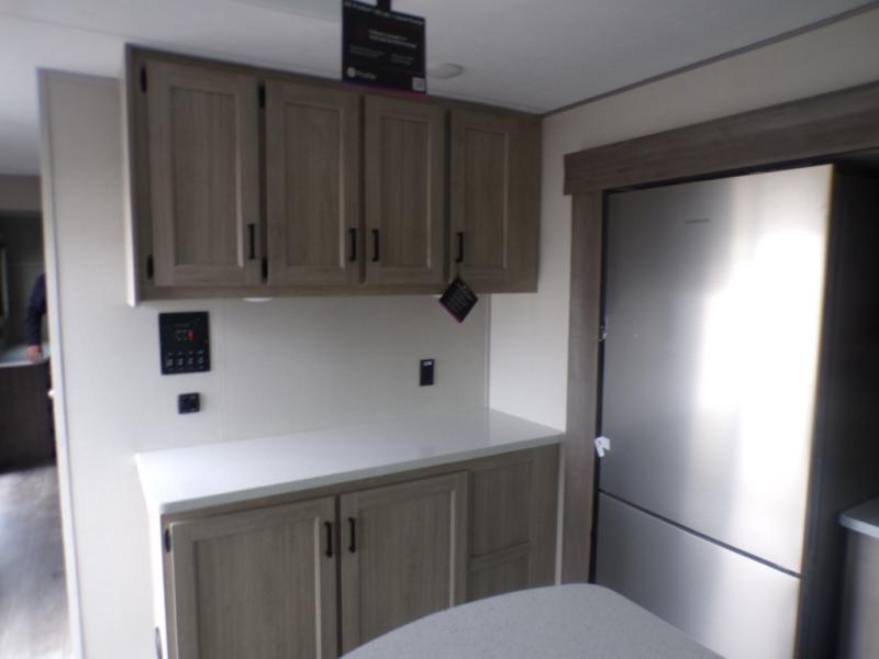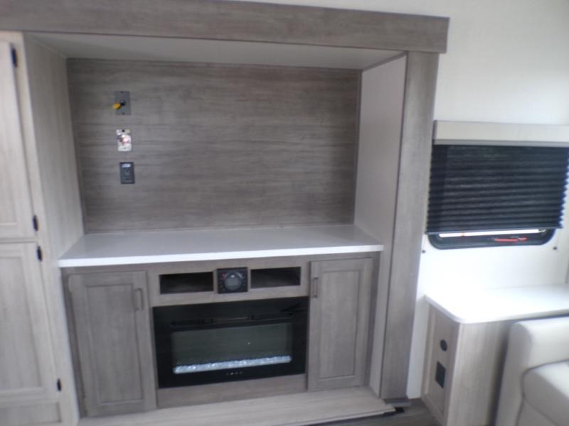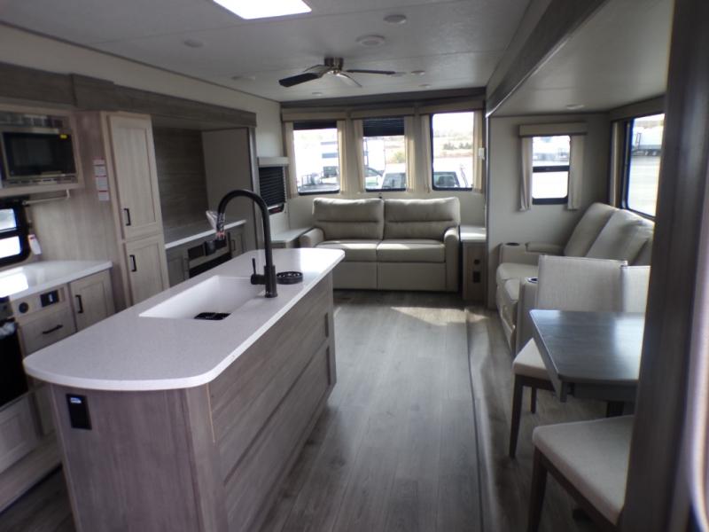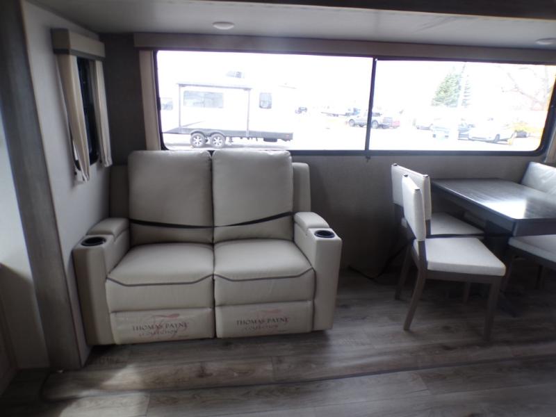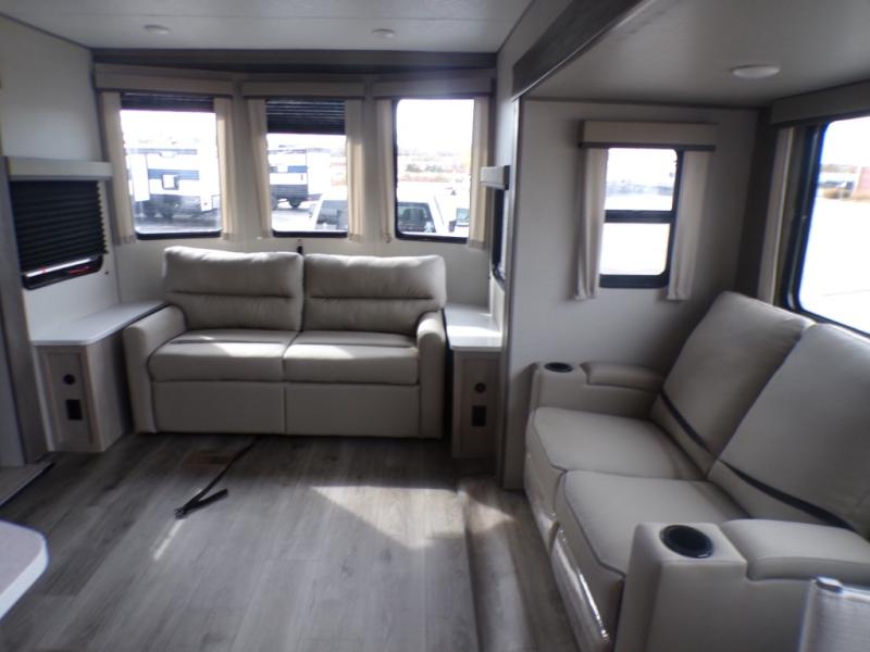 You'll feel right at home in this spacious destination trailer with triple slides. The front entertainment center and front living room includes a tri-fold sofa, booth dinette for ample seating space, and there is optional theater seating. The cook will love the spacious kitchen with an island, a residential refrigerator, a pantry and an extra countertop space. The full bathroom offers a shower with a seat and linen storage with washer/dryer prep for added convivence. Head to the rear bedroom for a great night's rest on the king bed slide out, and you can store all your clothes in the dresser with drawers or rear wardrobe with interior storage shelves!