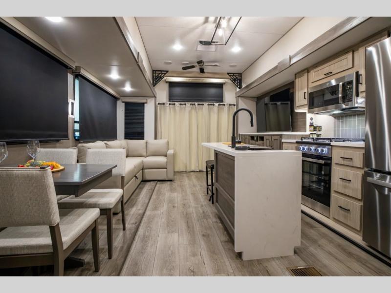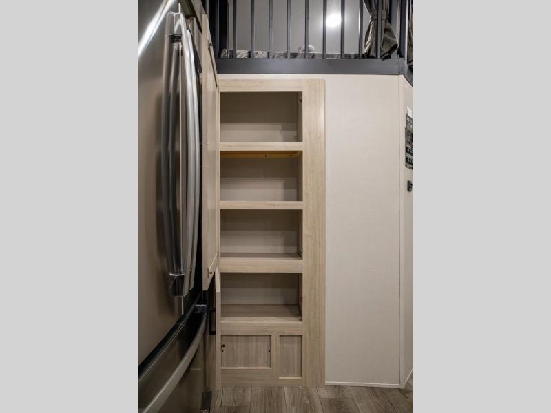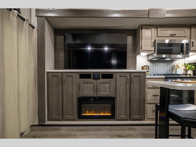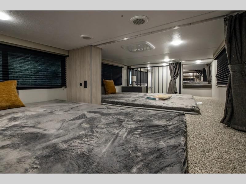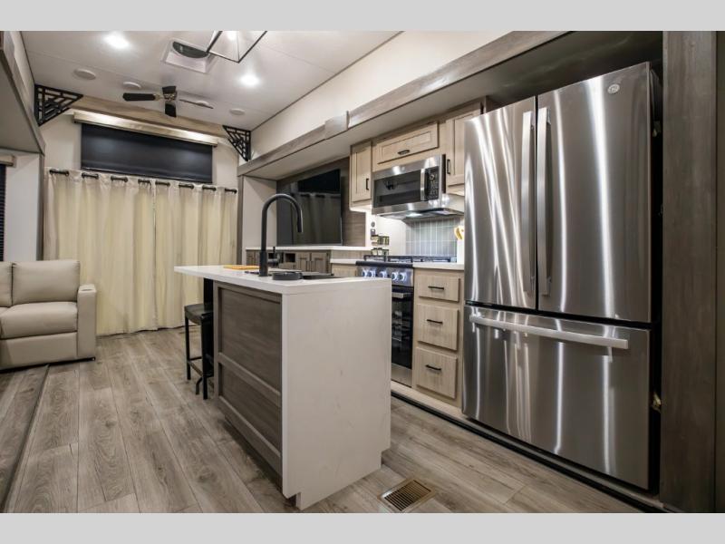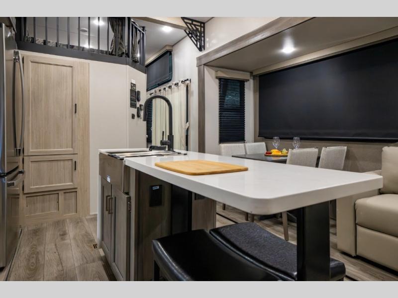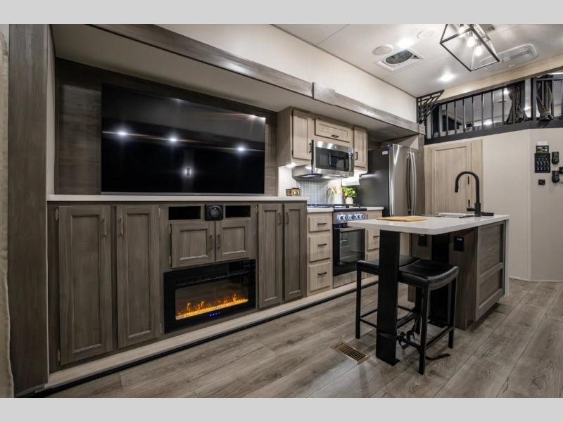 There is much to love about this destination trailer! Starting with the loft that has two queen beds, a wardrobe/storage, and a custom 58" x 71" bed. Downstairs there's a private bedroom with a king bed slide, a fireplace, and its very own private full bathroom complete with a dual sink vanity. The main living area has a huge bi-fold sleeper sectional sofa so you can fit even more guests, or just relax and watch the TV on the power lift in the entertainment center. The kitchen is well-equipped with a french door refrigerator, microwave, and pantry. The centerpiece here is a kitchen island with a deep basin farm-style sink and bar stool seating so your group can gather together and make new memories. The second full bath has a roomy 36" x 30" shower with glass door, and just around the corner find the stackable washer and dryer!