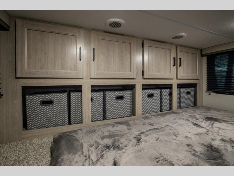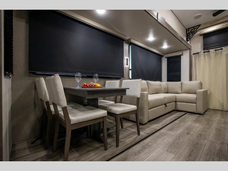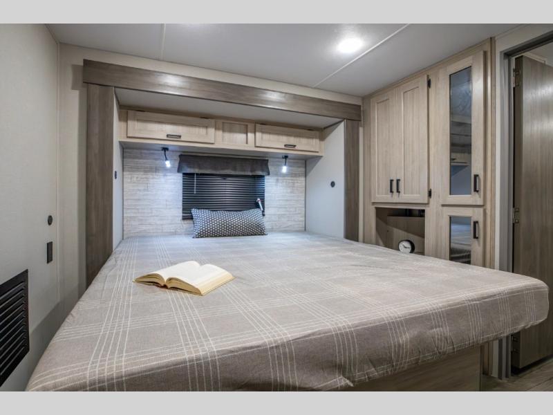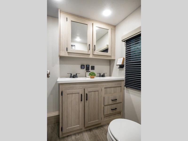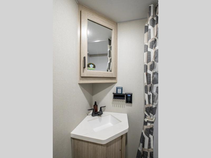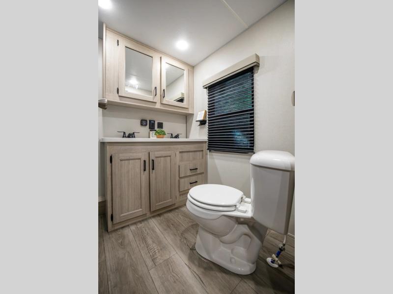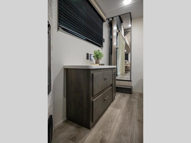 There is much to love about this destination trailer! Starting with the loft that has two queen beds, a wardrobe/storage, and a custom 58" x 71" bed. Downstairs there's a private bedroom with a king bed slide, a fireplace, and its very own private full bathroom complete with a dual sink vanity. The main living area has a huge bi-fold sleeper sectional sofa so you can fit even more guests, or just relax and watch the TV on the power lift in the entertainment center. The kitchen is well-equipped with a french door refrigerator, microwave, and pantry. The centerpiece here is a kitchen island with a deep basin farm-style sink and bar stool seating so your group can gather together and make new memories. The second full bath has a roomy 36" x 30" shower with glass door, and just around the corner find the stackable washer and dryer!