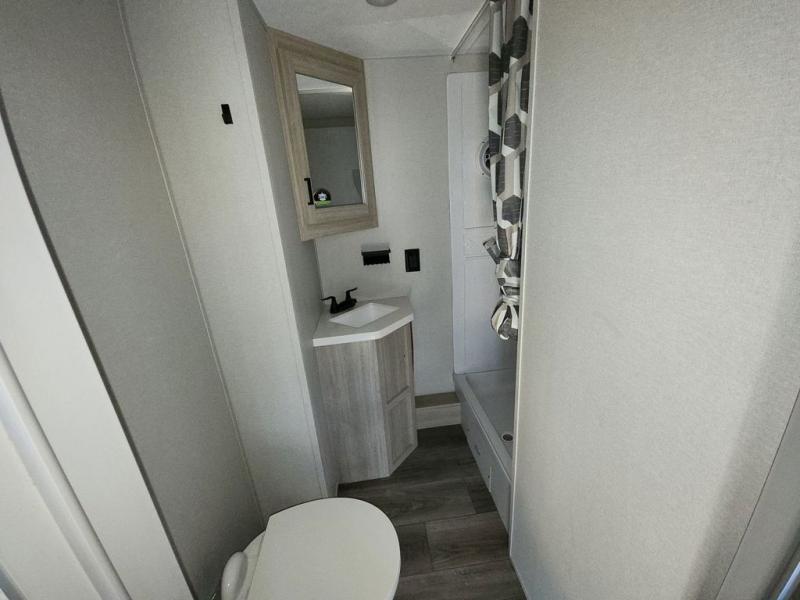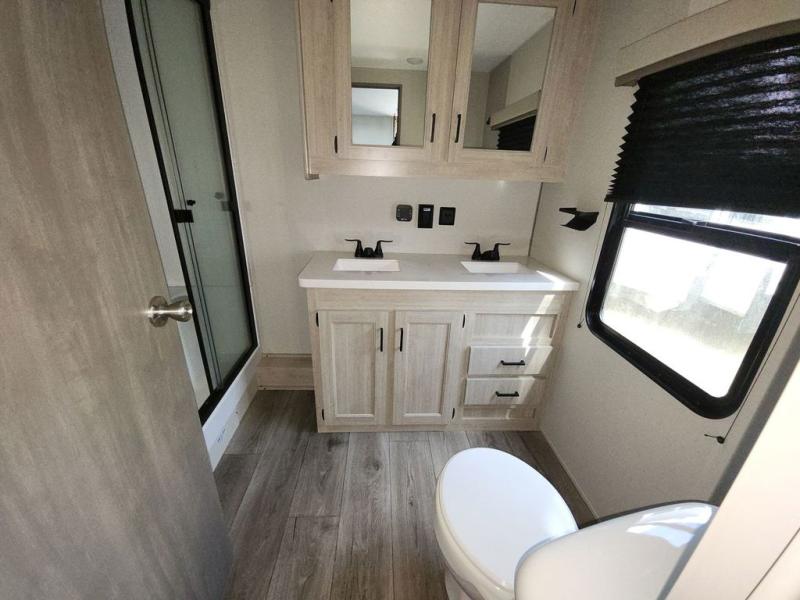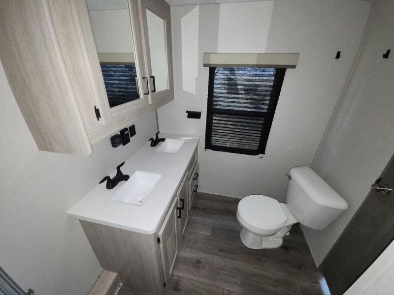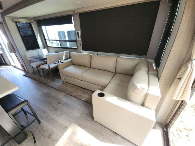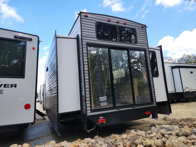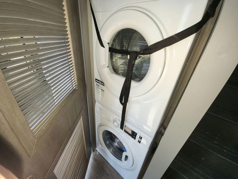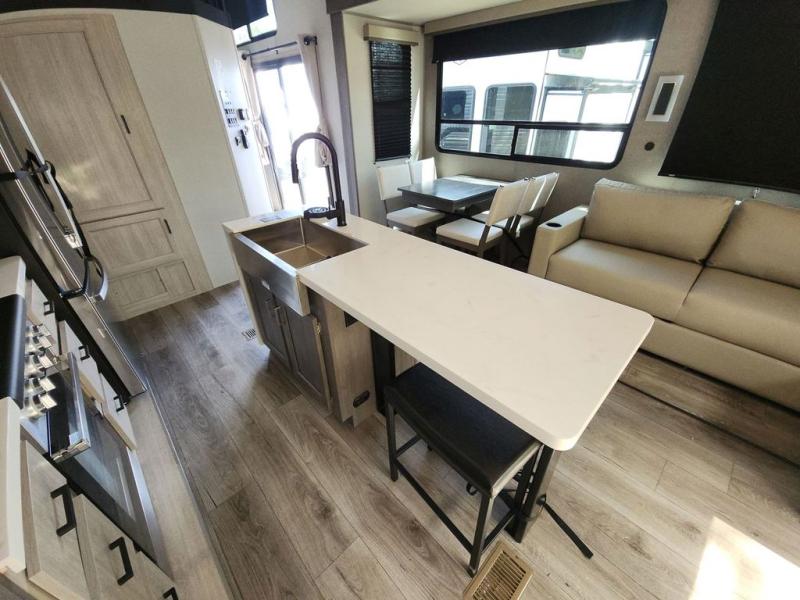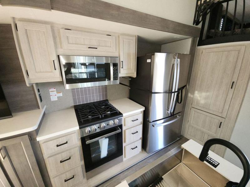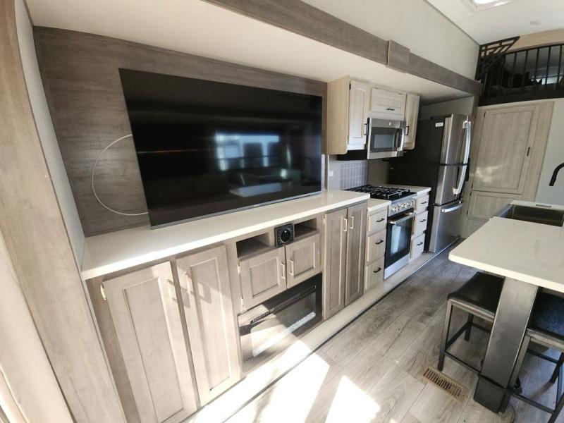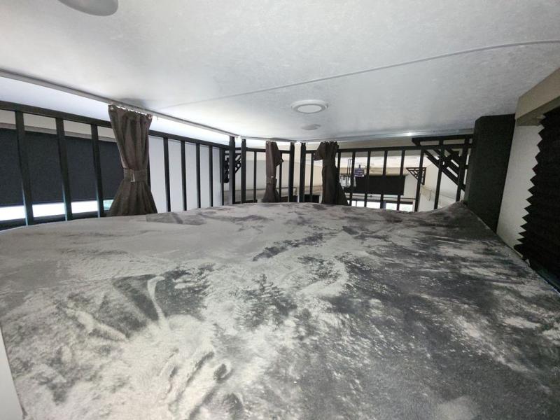 There is much to love about this destination trailer! Starting with the loft that has two queen beds, a wardrobe/storage, and a custom 58" x 71" bed. Downstairs there's a private bedroom with a king bed slide, a fireplace, and its very own private full bathroom complete with a dual sink vanity. The main living area has a huge bi-fold sleeper sectional sofa so you can fit even more guests, or just relax and watch the TV on the power lift in the entertainment center. The kitchen is well-equipped with a french door refrigerator, microwave, and pantry. The centerpiece here is a kitchen island with a deep basin farm-style sink and bar stool seating so your group can gather together and make new memories. The second full bath has a roomy 36" x 30" shower with glass door, and just around the corner find the stackable washer and dryer!