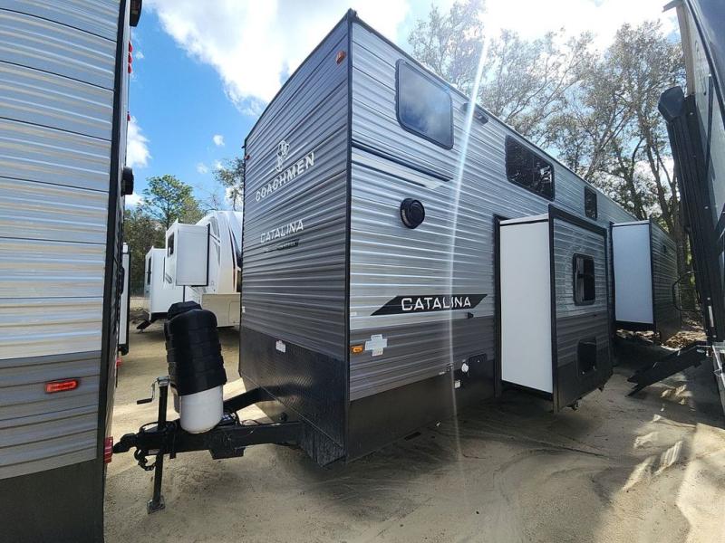 With any Catalina Destination trailer by Coachmen, you will enjoy comfortable extended stays wherever you decide to set up camp! The full length frame outriggers add strength to each unit, along with a seamless Alpha Roof membrane and Norco electromagnetic, powder coated chassis. You will love the open views provided by the residential-style sliding glass patio door, plus there are GE appliances, woodplank linoleum flooring, and hard valance window treatments to make your space feel more like home. Head outside to find a convenient "Leash Link" quick hookup D-ring for your furry friends, premium JBL exterior speakers, flush mount baggage doors for your gear, and the list of amenities goes on!