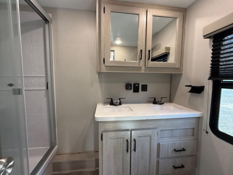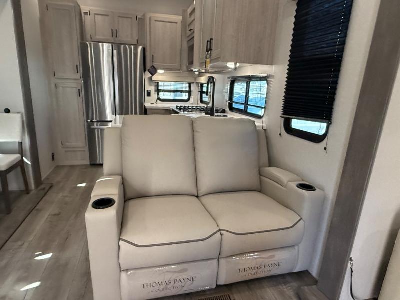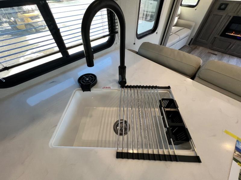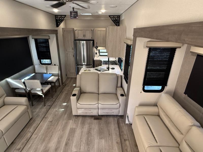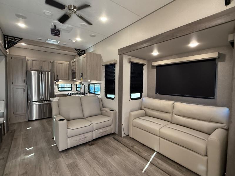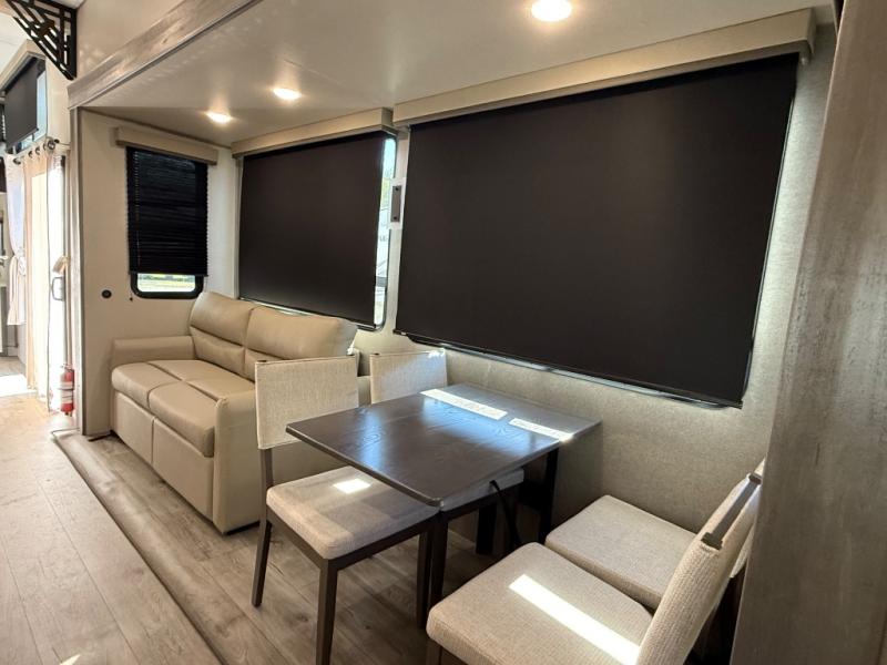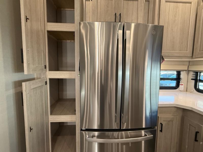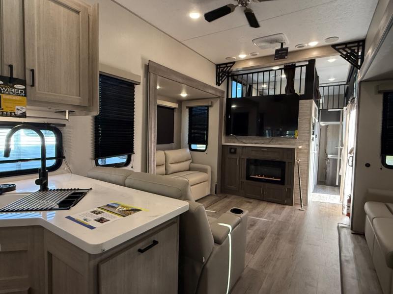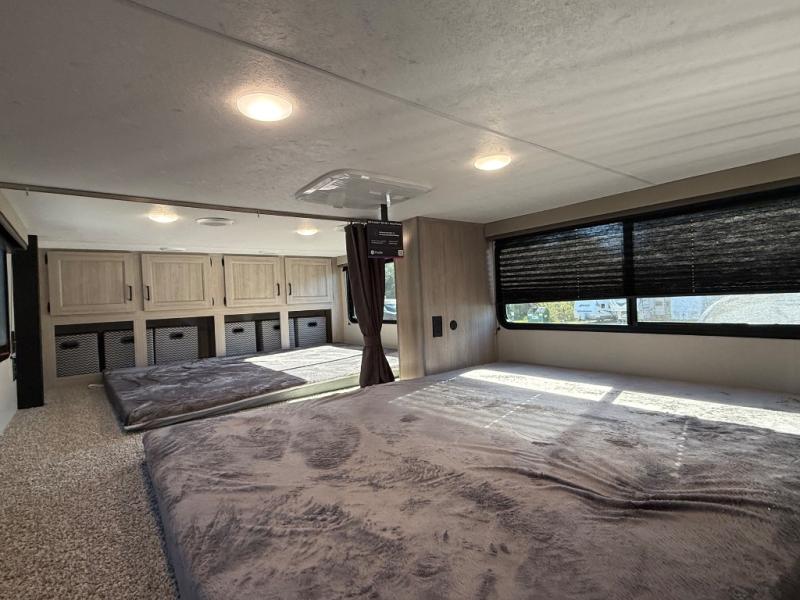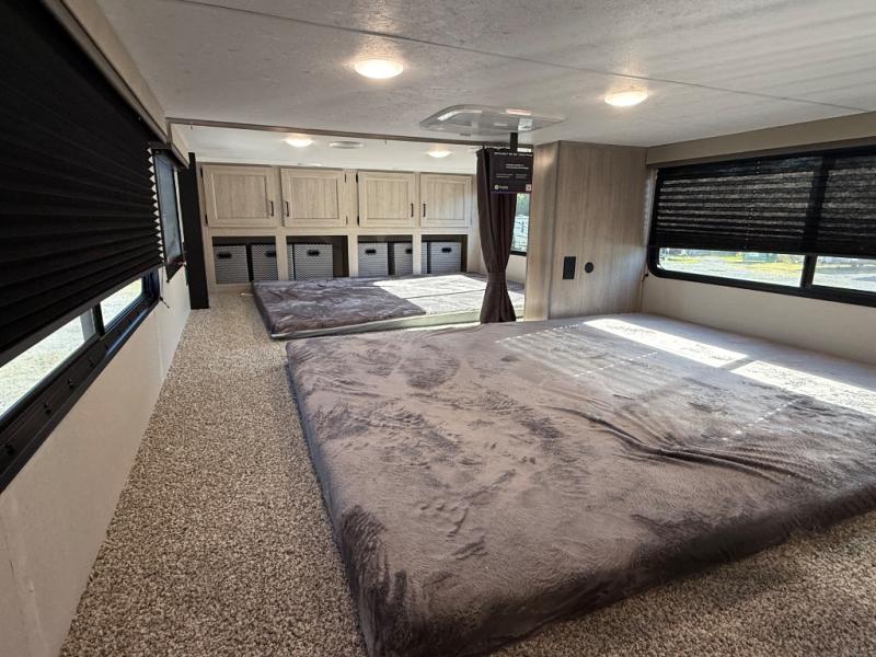 If you want to get out of the house without missing the comfort, you will love this destination trailer! Feel at home the moment you step in through the patio door and head to the open living area with opposing slide-outs making room for tons of seating areas to enjoy quality time by the fireplace with your guests. You will fall in love with the residential style kitchen featuring a 4 burner range, French door refrigerator, pantry, and much more to make your favorite recipes on the go. There is no such thing as too many guests when you have a loft that has two queen beds and a 28 x 64 bunk matt to rest. In the main floor you will have a master bedroom all to yourself that has its own private bath offering comfort and convenience at only a few steps away from your king bed.