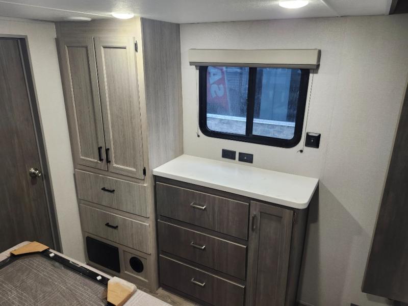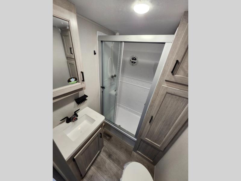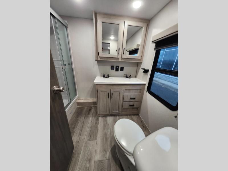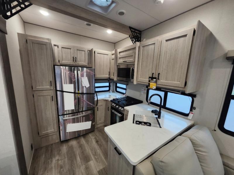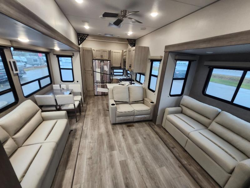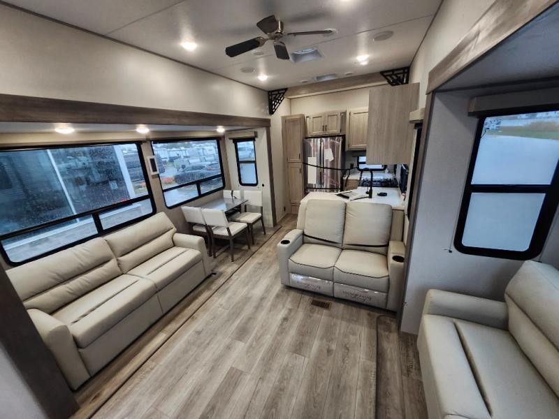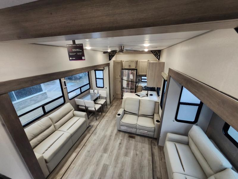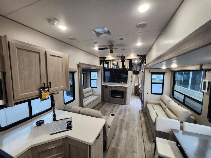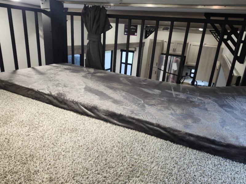 If you want to get out of the house without missing the comfort, you will love this destination trailer! Feel at home the moment you step in through the patio door and head to the open living area with double slide-outs making room for tons of seating areas to enjoy quality time by the fireplace with your guests. You will fall in love with the residential style kitchen featuring a 4 burner range, french door refrigerator, pantry, and much more to make your favorite recipes on the go. There is no such thing as too many guests when you have a loft that has two queen beds and a 28 x 64 bunk matt to rest. In the main floor you will have a master bedroom all to yourself that has its own private bath offering comfort and convenience at only a few steps away from your king bed.