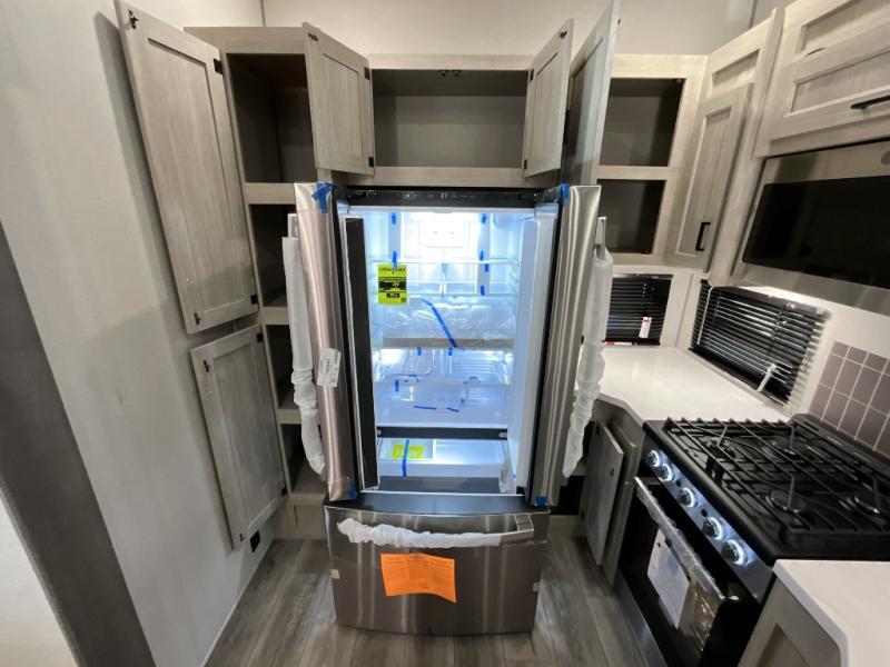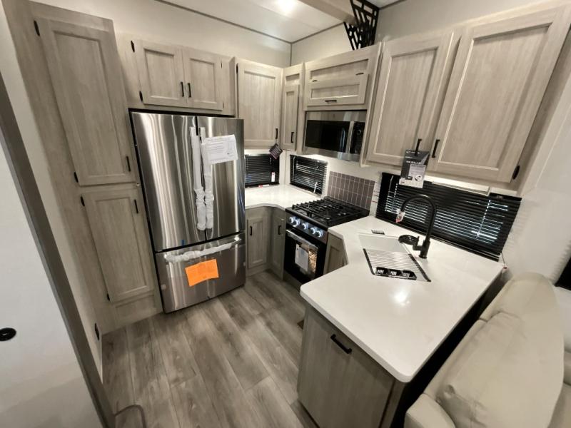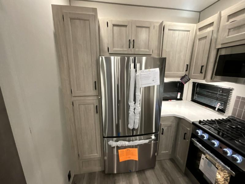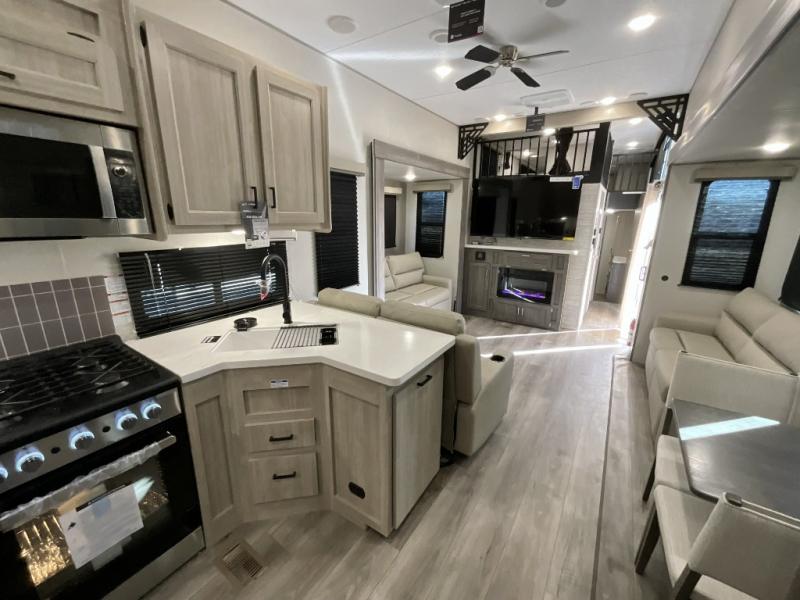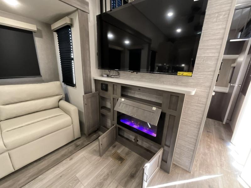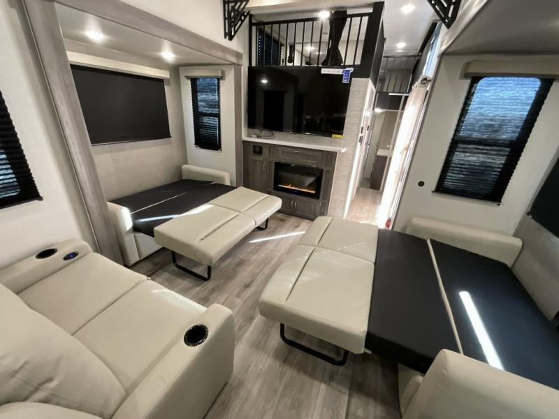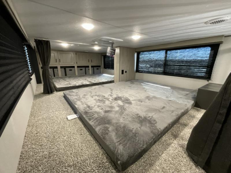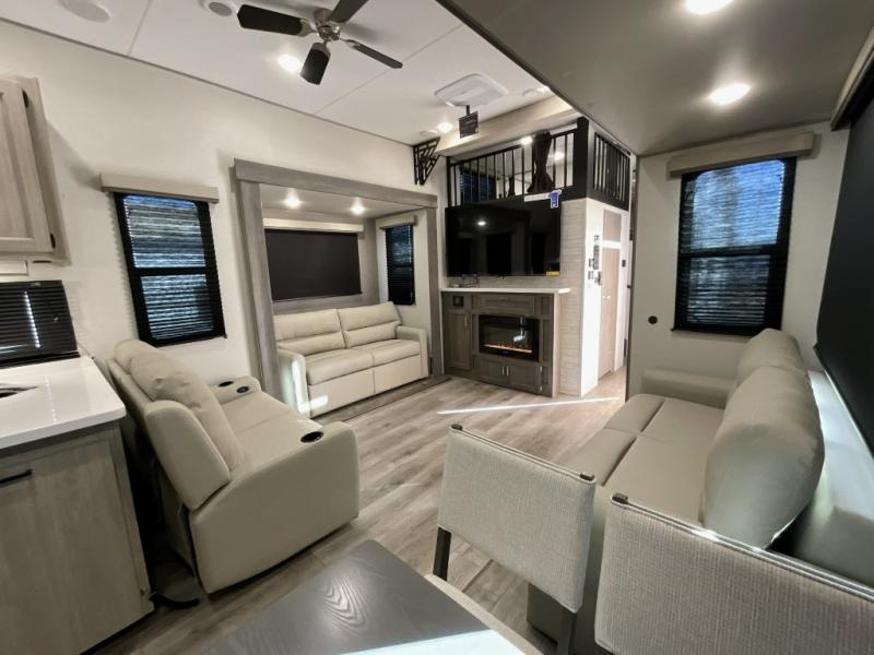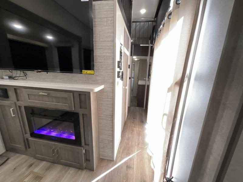 If you want to get out of the house without missing the comfort, you will love this destination trailer! Feel at home the moment you step in through the patio door and head to the open living area with double slide-outs making room for tons of seating areas to enjoy quality time by the fireplace with your guests. You will fall in love with the residential style kitchen featuring a 4 burner range, french door refrigerator, pantry, and much more to make your favorite recipes on the go. There is no such thing as too many guests when you have a loft that has two queen beds and a 28 x 64 bunk matt to rest. In the main floor you will have a master bedroom all to yourself that has its own private bath offering comfort and convenience at only a few steps away from your king bed.