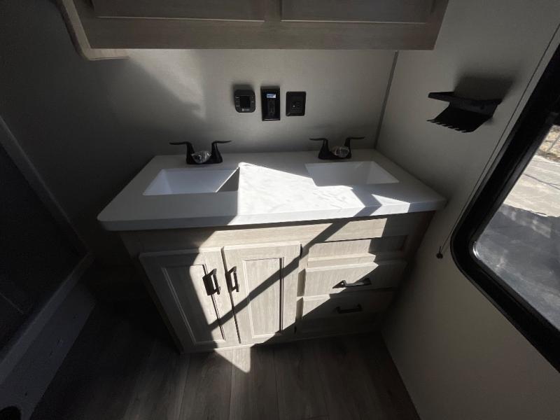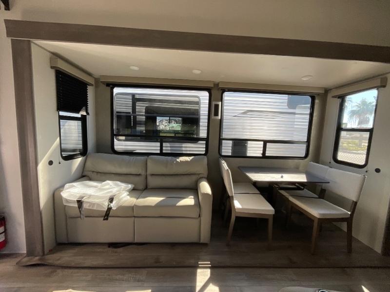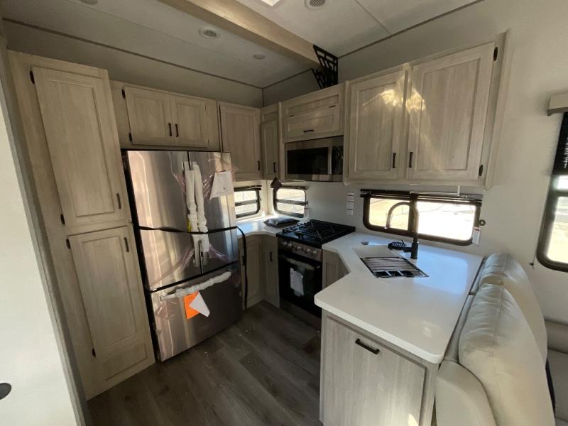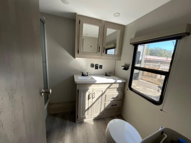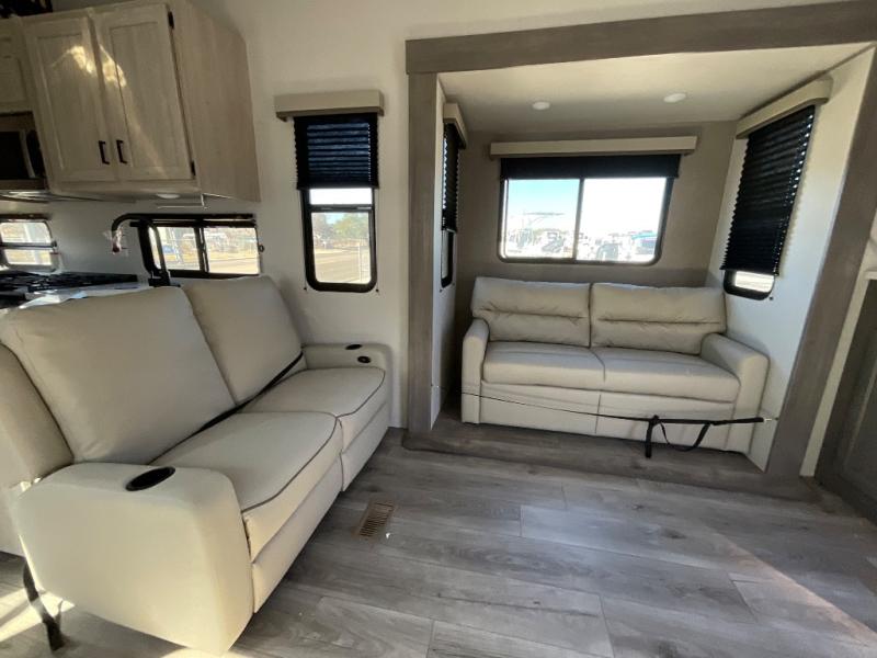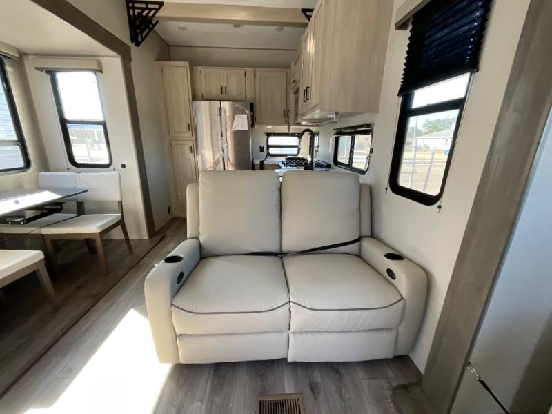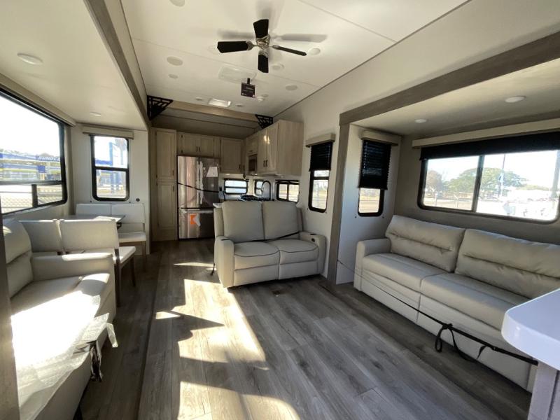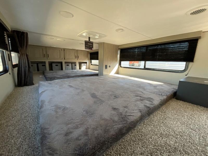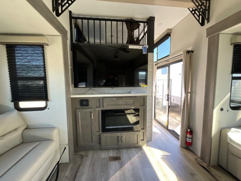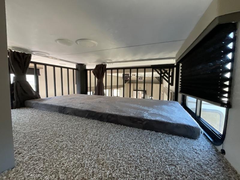If you want to get out of the house without missing the comfort, you will love this destination trailer! Feel at home the moment you step in through the patio door and head to the open living area with double slide-outs making room for tons of seating areas to enjoy quality time by the fireplace with your guests. You will fall in love with the residential style kitchen featuring a 4 burner range, french door refrigerator, pantry, and much more to make your favorite recipes on the go. There is no such thing as too many guests when you have a loft that has two queen beds and a 28 x 64 bunk matt to rest. In the main floor you will have a master bedroom all to yourself that has its own private bath offering comfort and convenience at only a few steps away from your king bed.