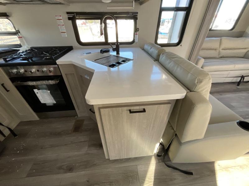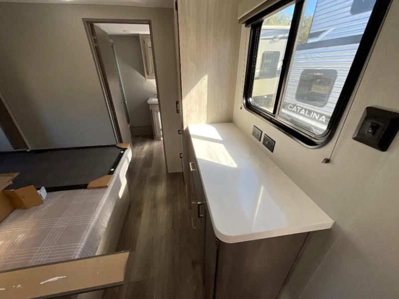 With any Catalina Destination trailer by Coachmen, you will enjoy comfortable extended stays wherever you decide to set up camp! The full length frame outriggers add strength to each unit, along with a seamless Alpha Roof membrane and Norco electromagnetic, powder coated chassis. You will love the open views provided by the residential-style sliding glass patio door, plus there are GE appliances, woodplank linoleum flooring, and hard valance window treatments to make your space feel more like home. Head outside to find a convenient "Leash Link" quick hookup D-ring for your furry friends, premium JBL exterior speakers, flush mount baggage doors for your gear, and the list of amenities goes on!