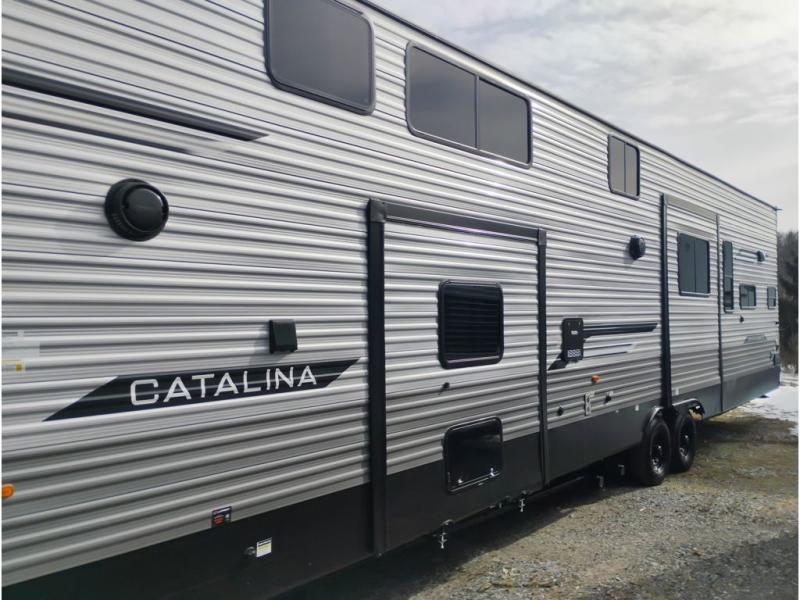 With any Catalina Destination trailer by Coachmen, you will enjoy comfortable extended stays wherever you decide to set up camp! The full length frame outriggers add strength to each unit, along with a seamless Alpha Roof membrane and Norco electromagnetic, powder coated chassis. You will love the open views provided by the residential-style sliding glass patio door, plus there are GE appliances, woodplank linoleum flooring, and hard valance window treatments to make your space feel more like home. Head outside to find a convenient "Leash Link" quick hookup D-ring for your furry friends, premium JBL exterior speakers, flush mount baggage doors for your gear, and the list of amenities goes on!