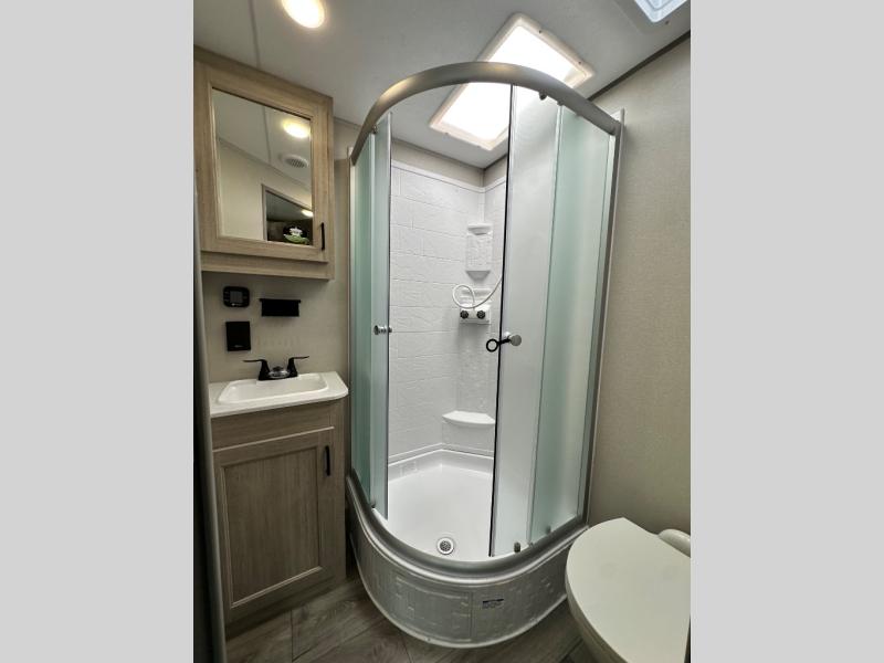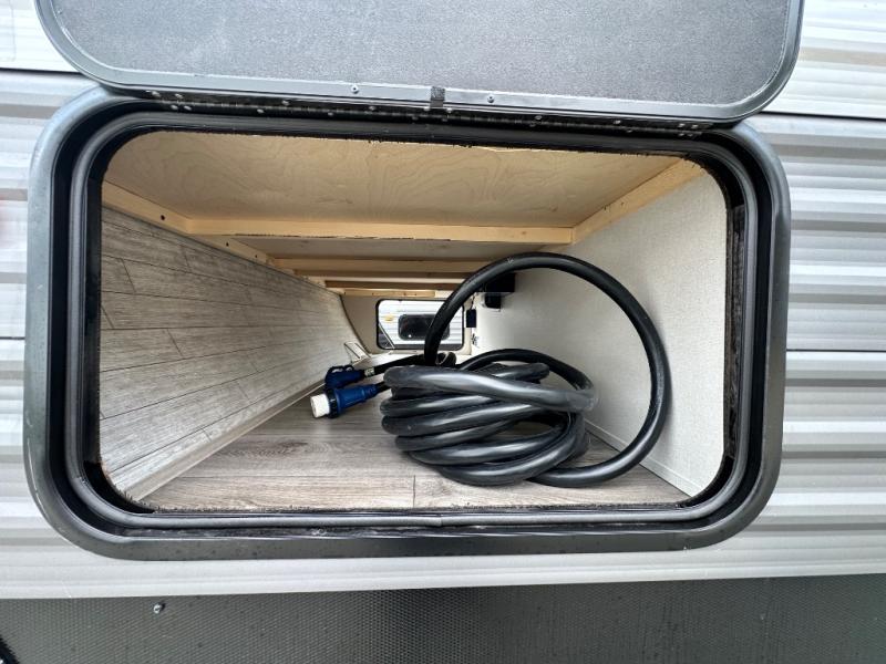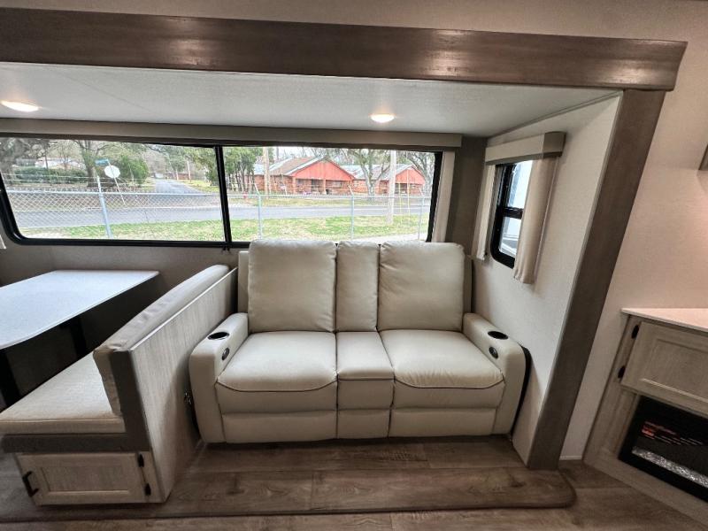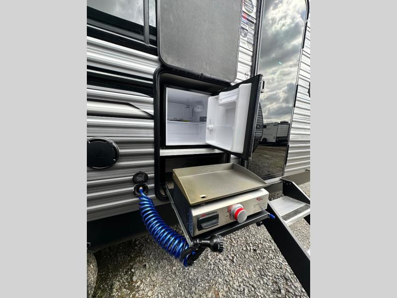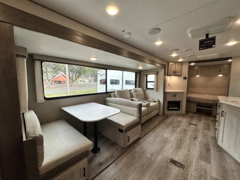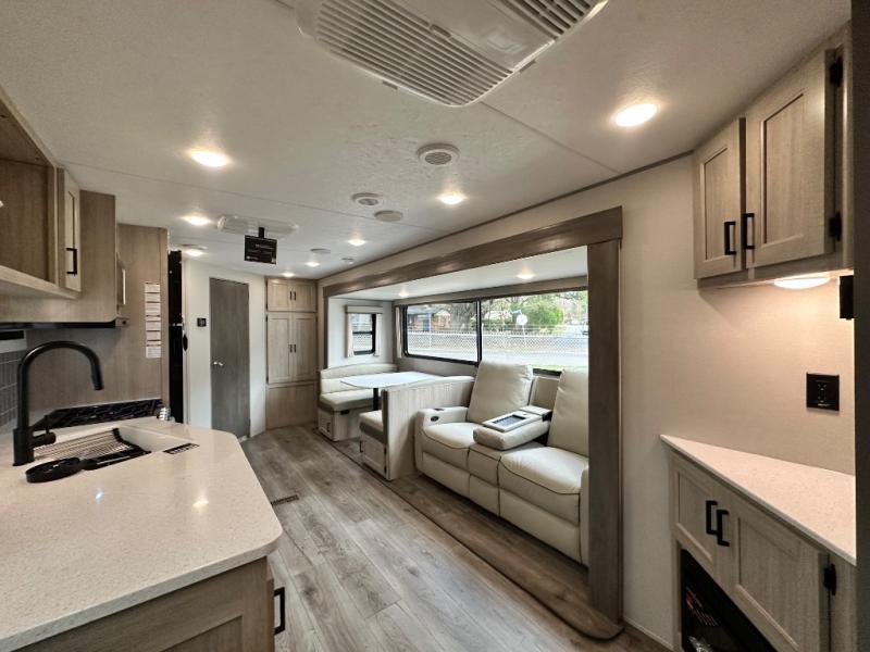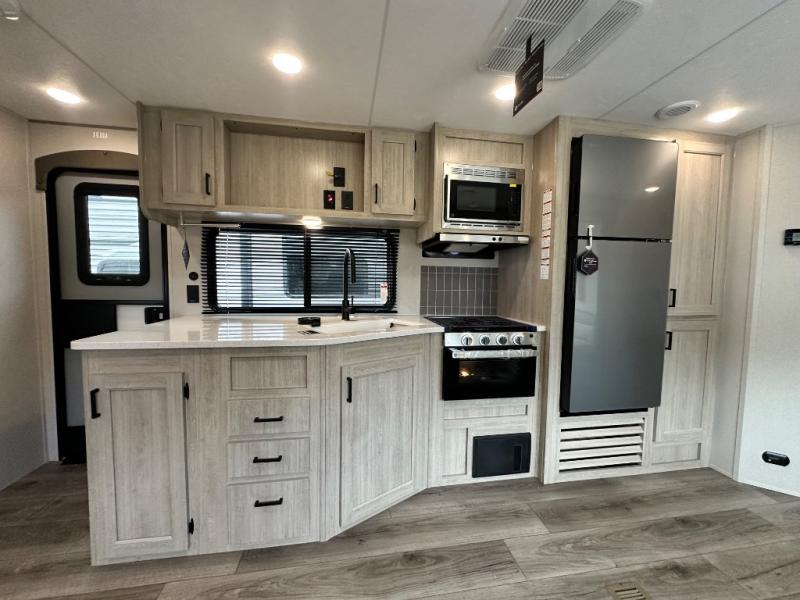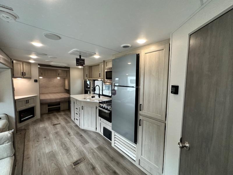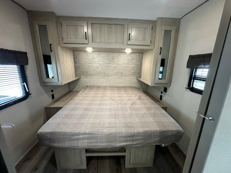 This half-ton friendly trailer is easy to pull and park and is spacious thanks to the large slide out in the main living and kitchen area! You can dine at the booth dinette or choose the free-standing dinette option, and the trundle sofa offers drink holders for your drink when you're relaxing. The rear corner offers a full bathroom and a large wardrobe/pantry for the storage you need. The galley kitchen offers full amenities plus a breakfast bar where you can set out fresh fruit and cereal. And the 15' awning provides protection from the elements plus has the choice of multiple LED colors with the use of the remote.