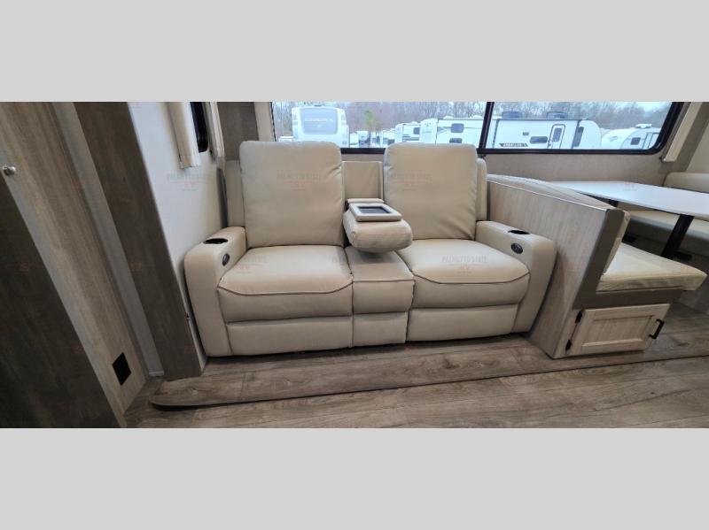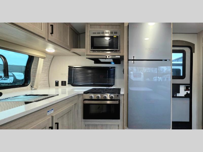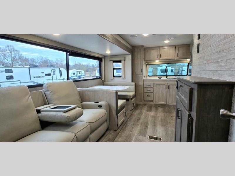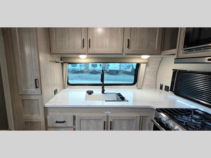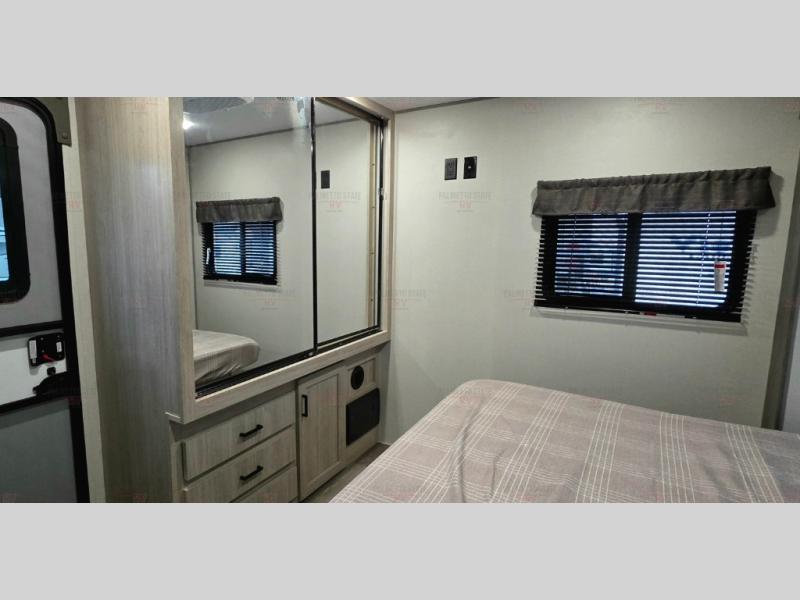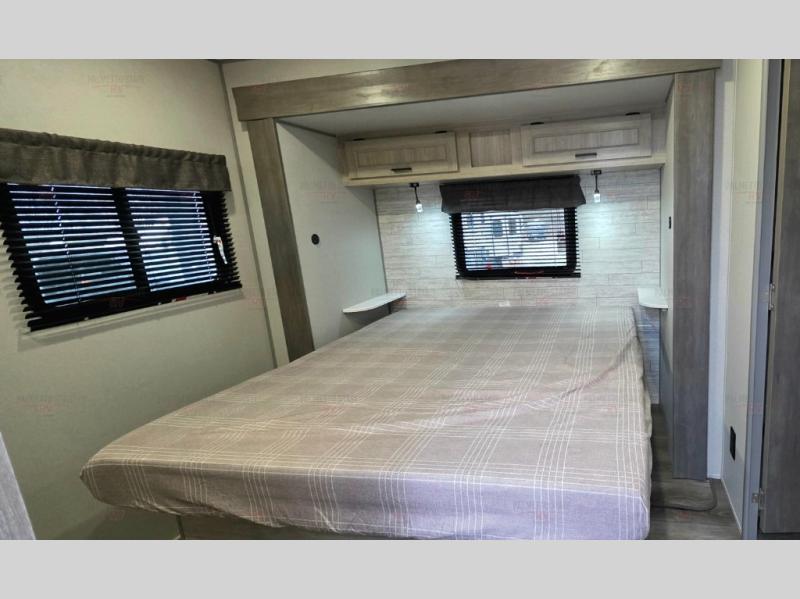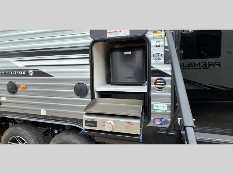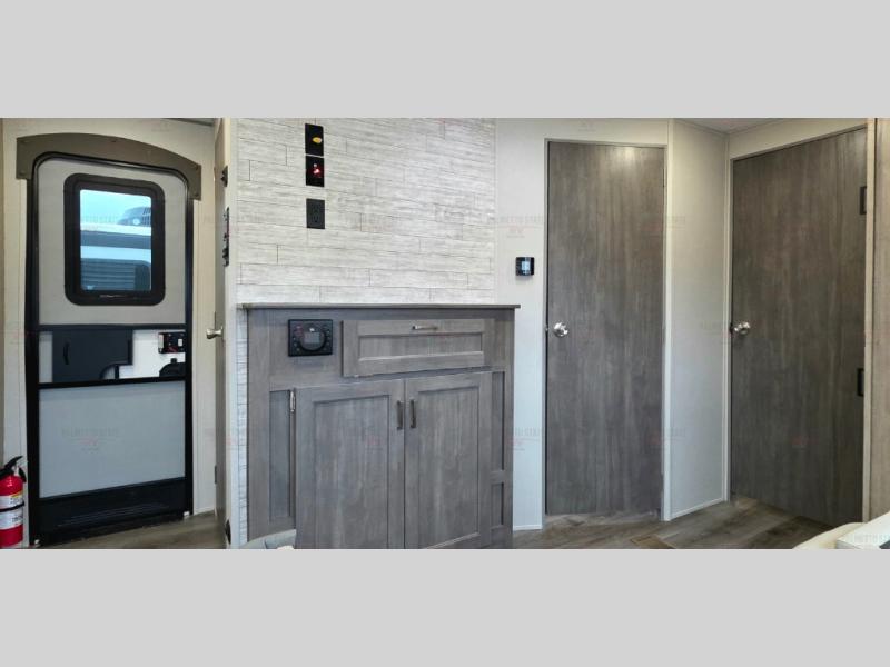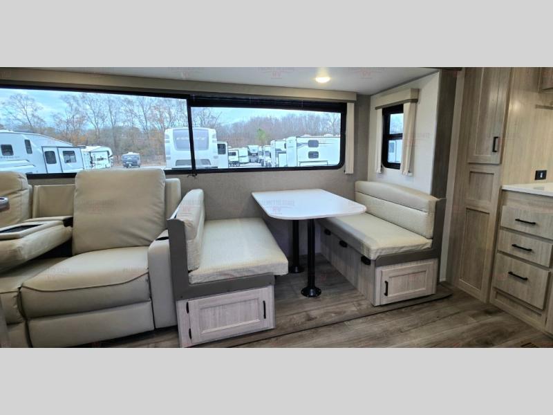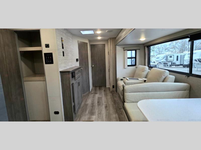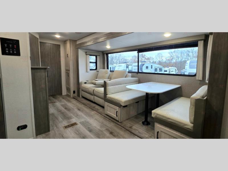 Step into comfort with this front kitchen travel trailer! You will love the amount of counter space you have to prep and cook meals. There is also an outdoor camper kitchen with a griddle and mini refrigerator for breakfast outdoors. There is plenty of storage space for all your belongings, including two kitchen pantries, overhead cabinets, a closet and a wardrobe, plus a pass-through storage. Your crew can get comfortable on the 68" trundle sofa and booth dinette within the large slide out, and there is an entertainment center if you plan to bring your own TV. And don't overlook the rear master bedroom with an RV queen bed slide out, a wardrobe, plus its own exterior entry door!