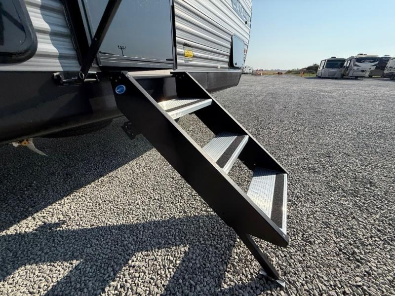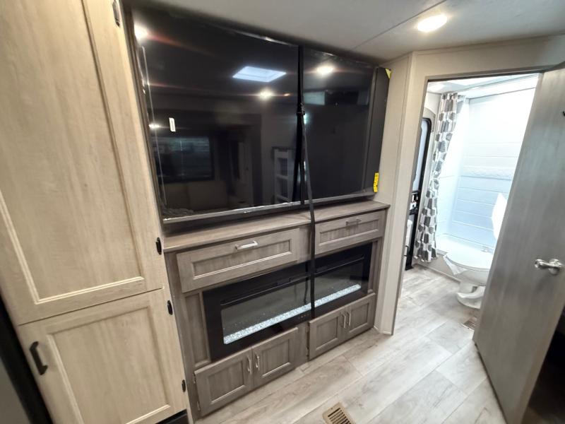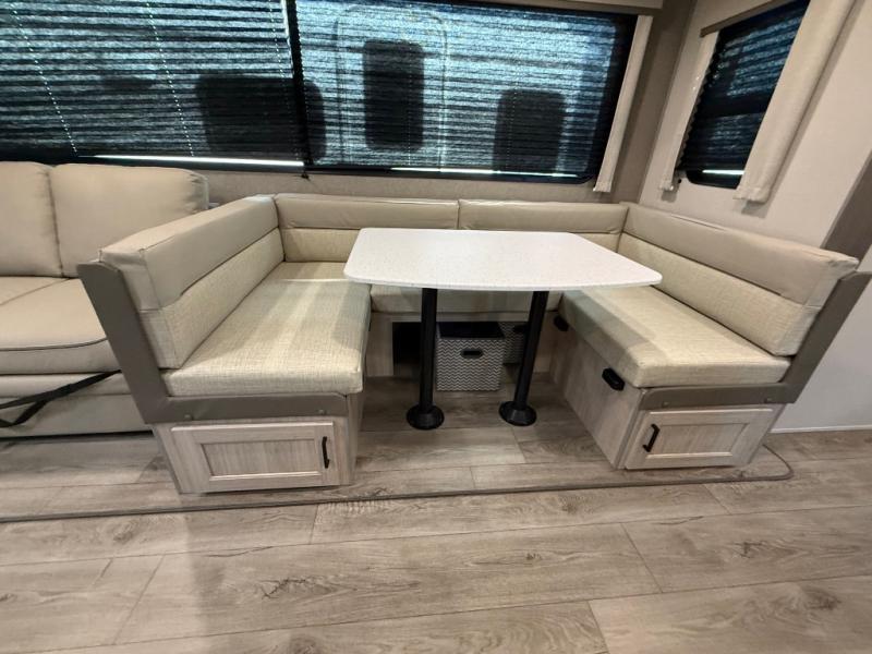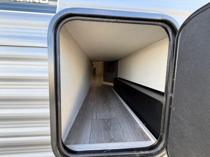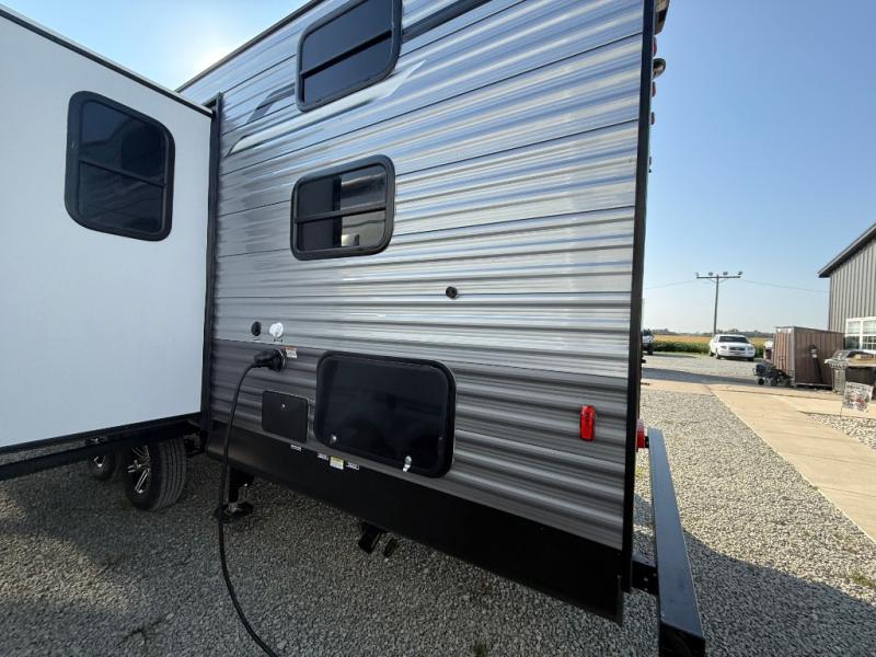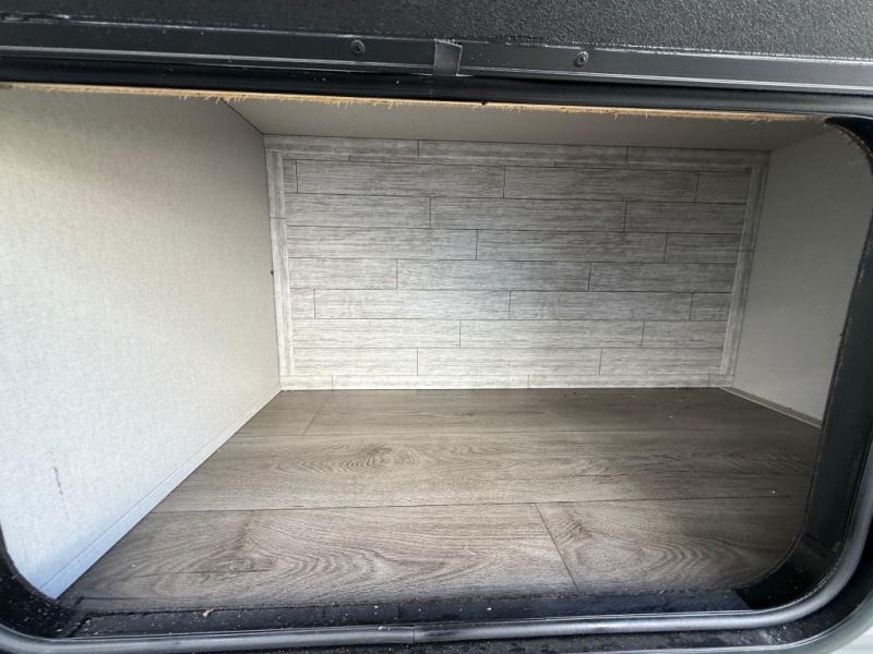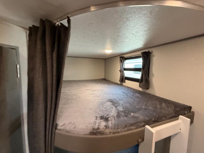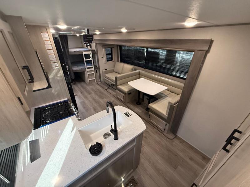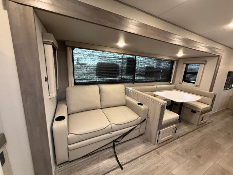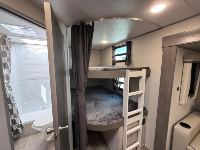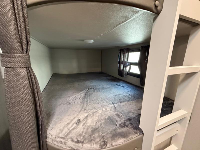 This travel trailer is perfect for your whole crew! Once you arrive at the campground, you can put out the 21' electric awning and start lunch on the exterior camper kitchen with a griddle and mini fridge. There is also a pass-thru storage plus additional exterior storage with a fold-down table and a TV hookup for added convenience. And since there are dual entry doors found on this unit, you can enter in through the full bath in the back, or the main living area towards the front! A large slide provides ample space to move about, and you'll find a trundle sofa and U-shaped dinette here for cozy seating and sleeping space. Speaking of sleeping, there is a front RV queen bed in the bedroom plus double-size bunks in the back for guests!