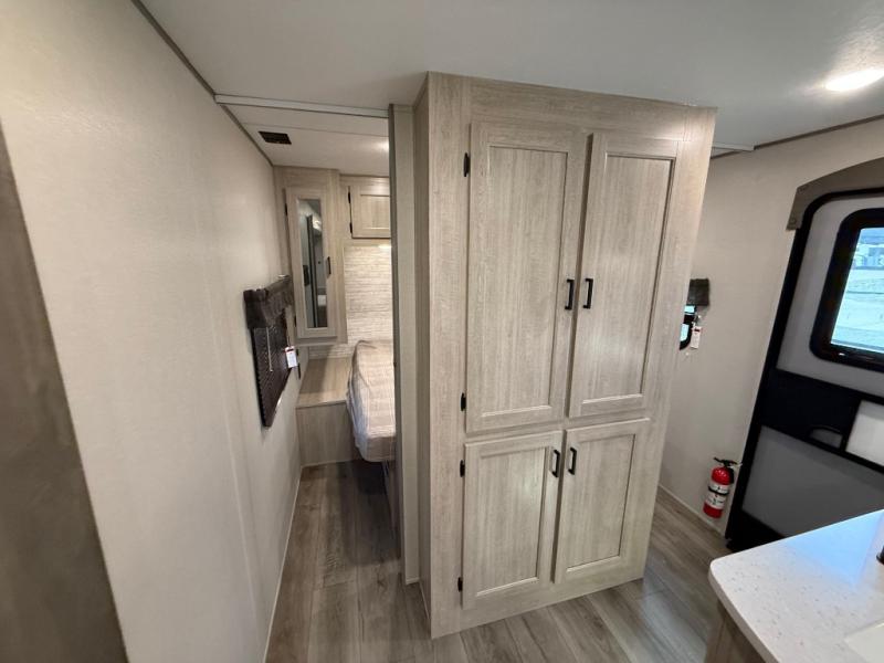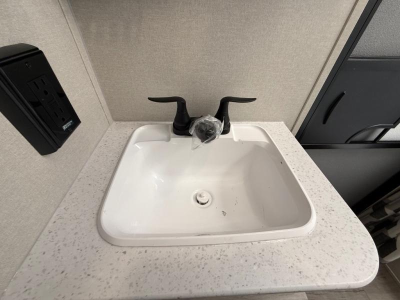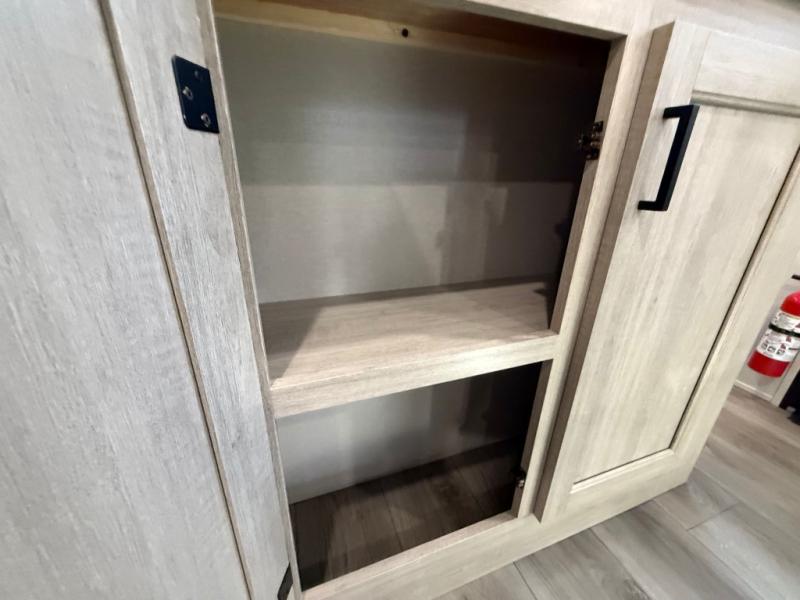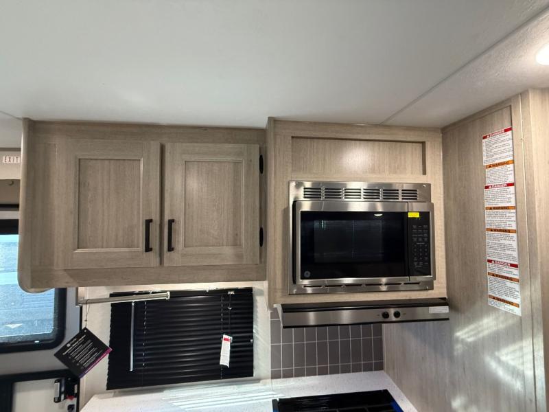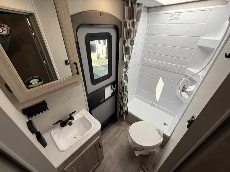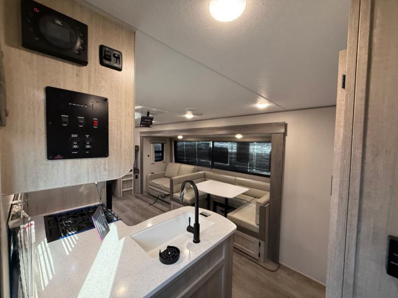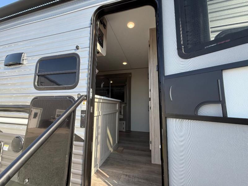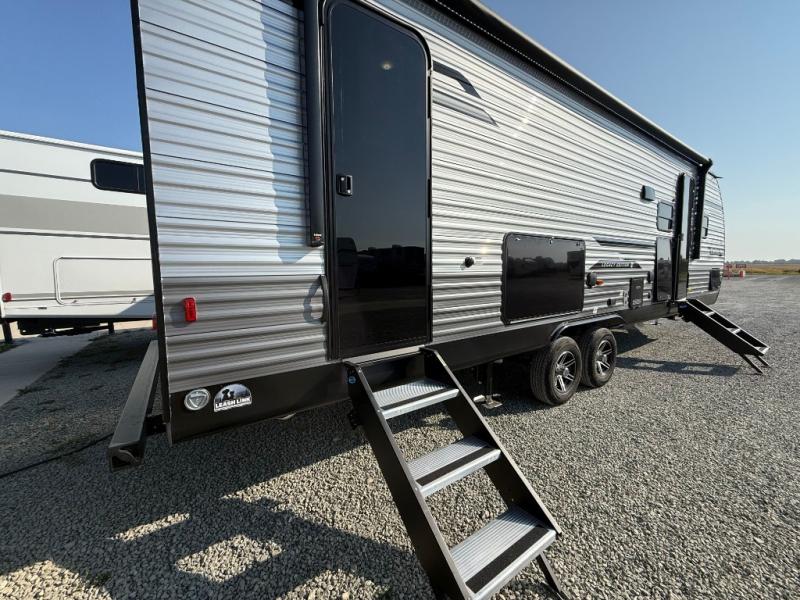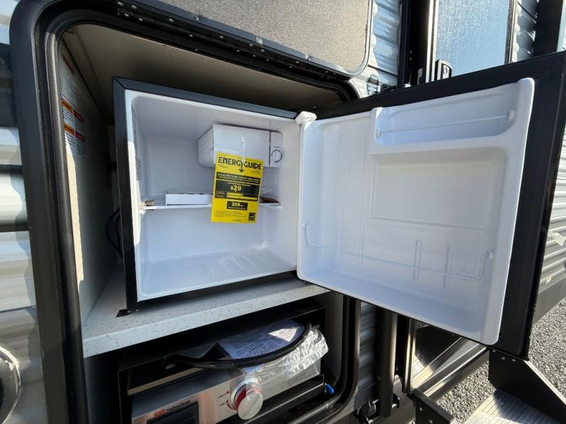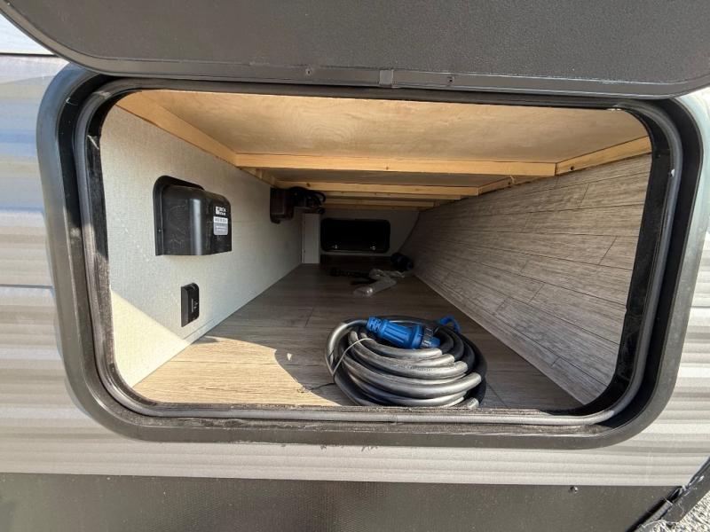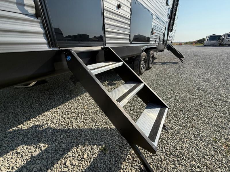 This travel trailer is perfect for your whole crew! Once you arrive at the campground, you can put out the 21' electric awning and start lunch on the exterior camper kitchen with a griddle and mini fridge. There is also a pass-thru storage plus additional exterior storage with a fold-down table and a TV hookup for added convenience. And since there are dual entry doors found on this unit, you can enter in through the full bath in the back, or the main living area towards the front! A large slide provides ample space to move about, and you'll find a trundle sofa and U-shaped dinette here for cozy seating and sleeping space. Speaking of sleeping, there is a front RV queen bed in the bedroom plus double-size bunks in the back for guests!