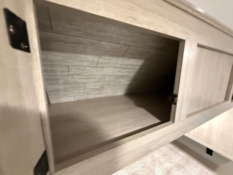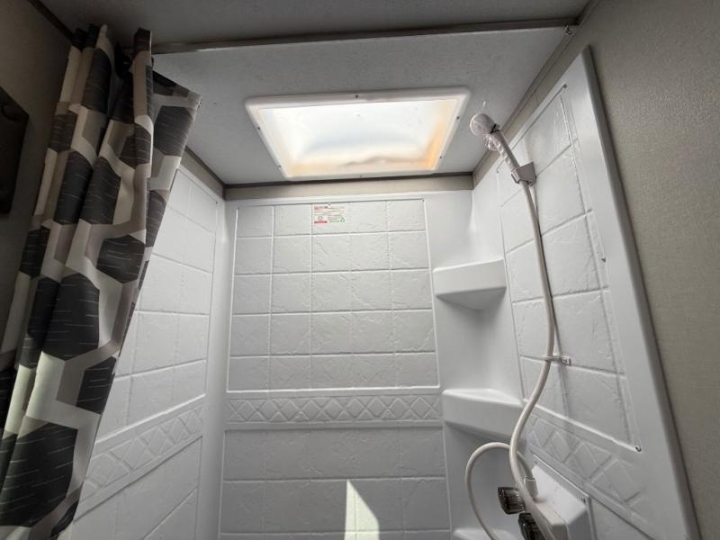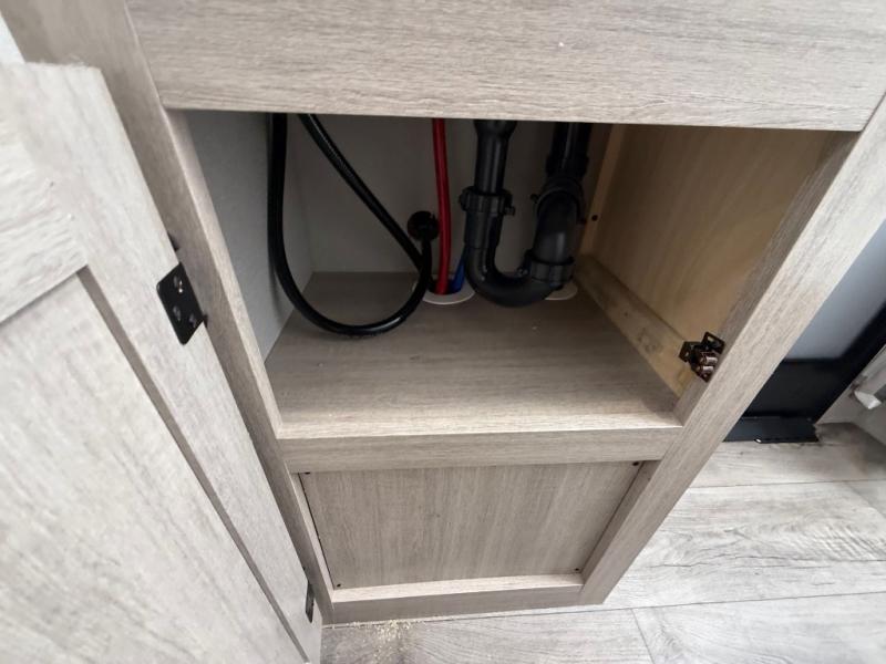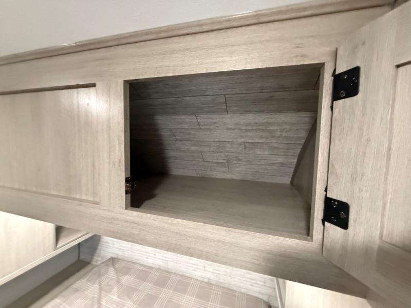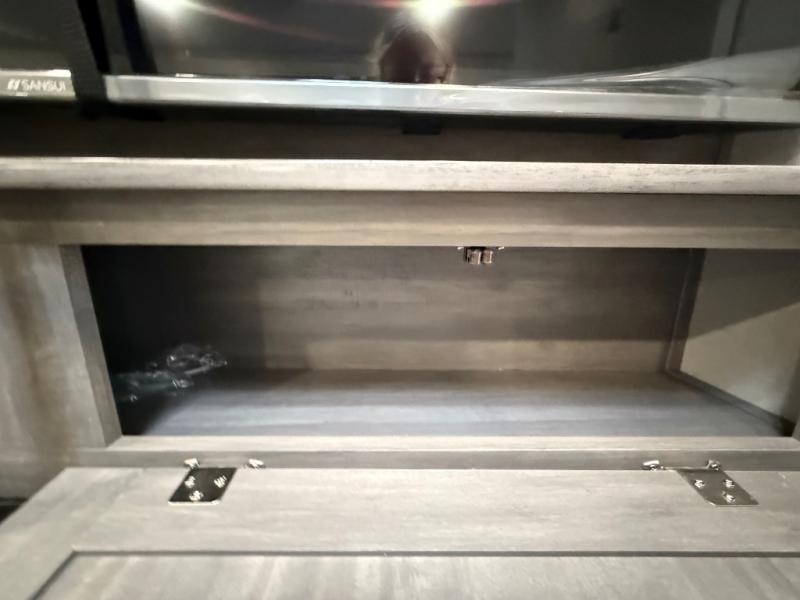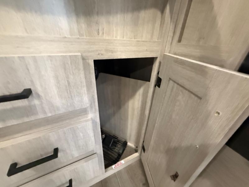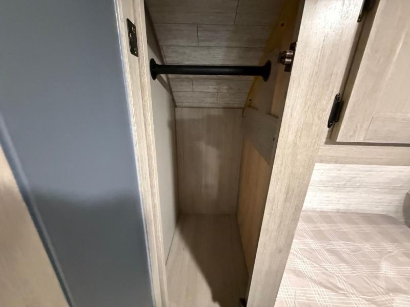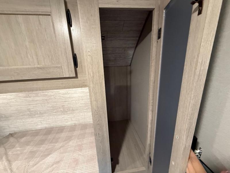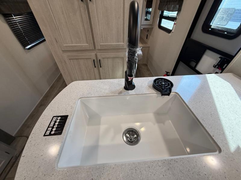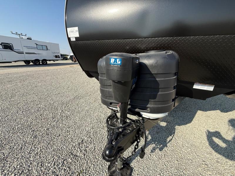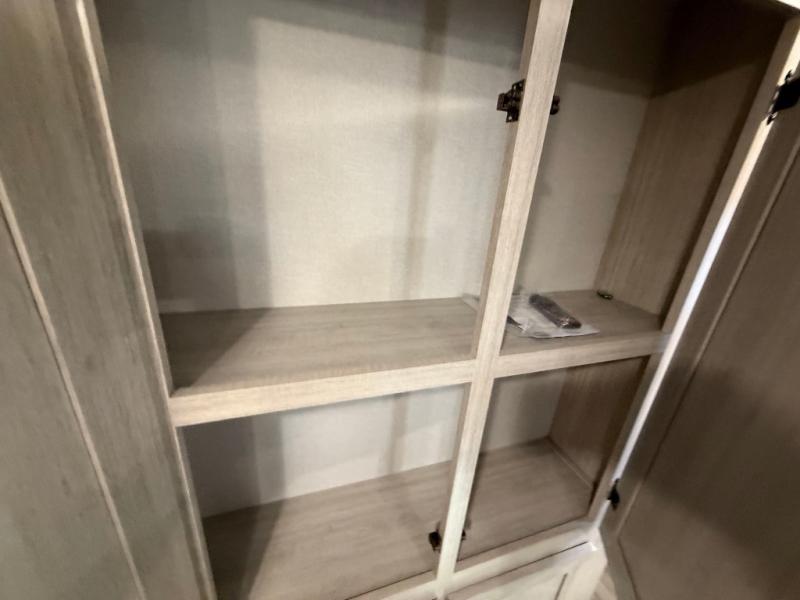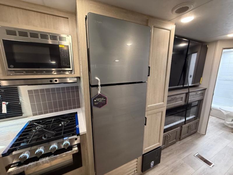 This travel trailer is perfect for your whole crew! Once you arrive at the campground, you can put out the 21' electric awning and start lunch on the exterior camper kitchen with a griddle and mini fridge. There is also a pass-thru storage plus additional exterior storage with a fold-down table and a TV hookup for added convenience. And since there are dual entry doors found on this unit, you can enter in through the full bath in the back, or the main living area towards the front! A large slide provides ample space to move about, and you'll find a trundle sofa and U-shaped dinette here for cozy seating and sleeping space. Speaking of sleeping, there is a front RV queen bed in the bedroom plus double-size bunks in the back for guests!