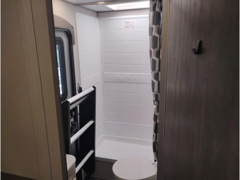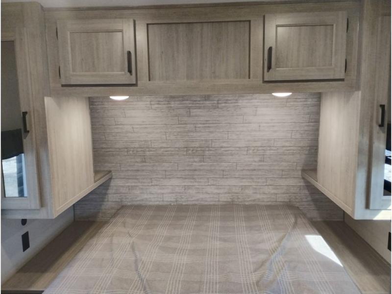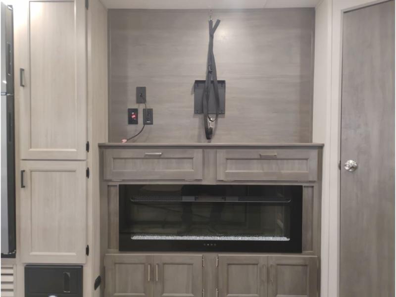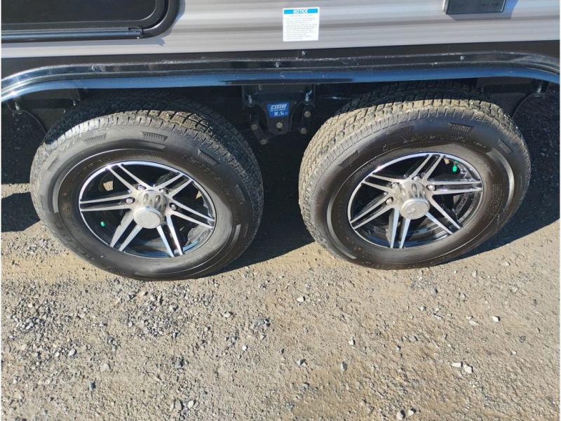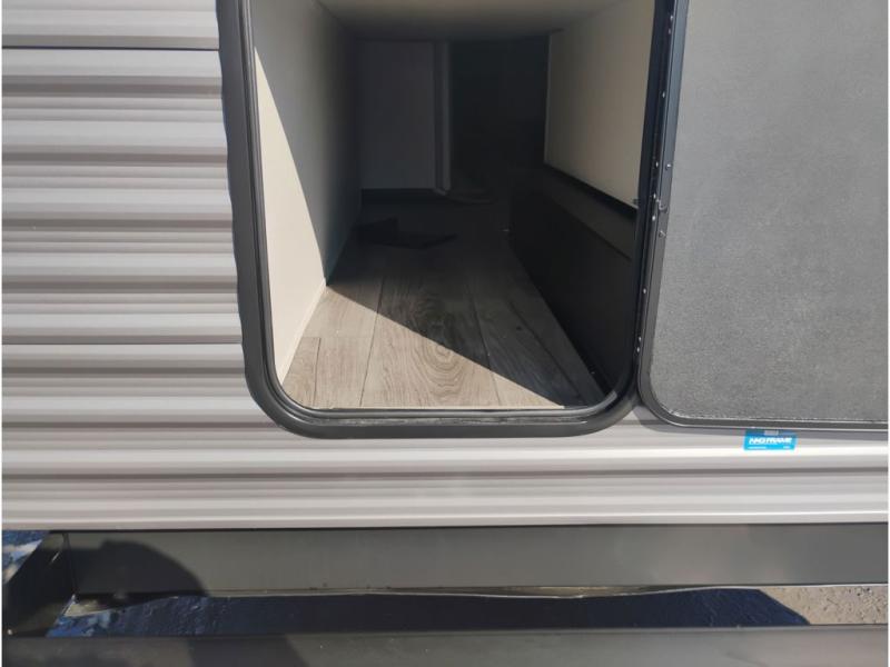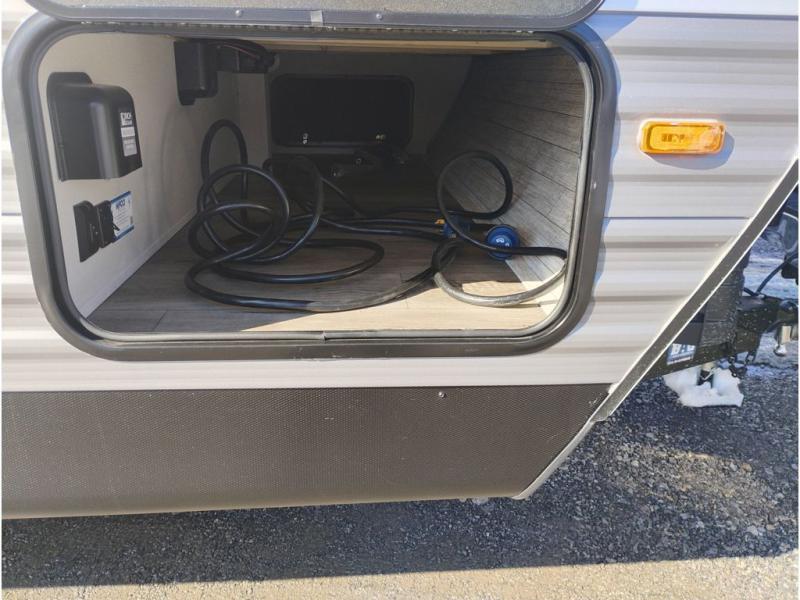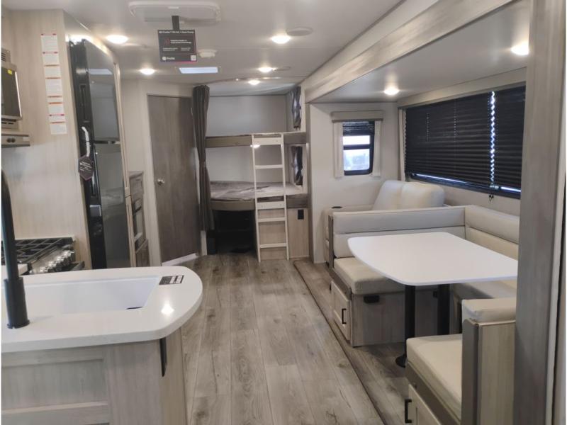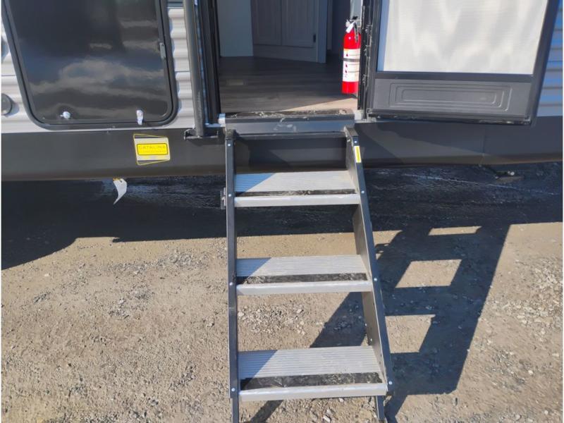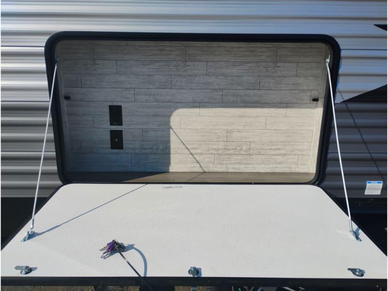 This travel trailer is perfect for your whole crew! Once you arrive at the campground, you can put out the 21' electric awning and start lunch on the exterior camper kitchen with a griddle and mini fridge. There is also a pass-thru storage plus additional exterior storage with a fold-down table and a TV hookup for added convenience. And since there are dual entry doors found on this unit, you can enter in through the full bath in the back, or the main living area towards the front! A large slide provides ample space to move about, and you'll find a trundle sofa and U-shaped dinette here for cozy seating and sleeping space. Speaking of sleeping, there is a front RV queen bed in the bedroom plus double-size bunks in the back for guests!