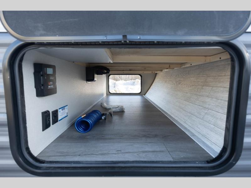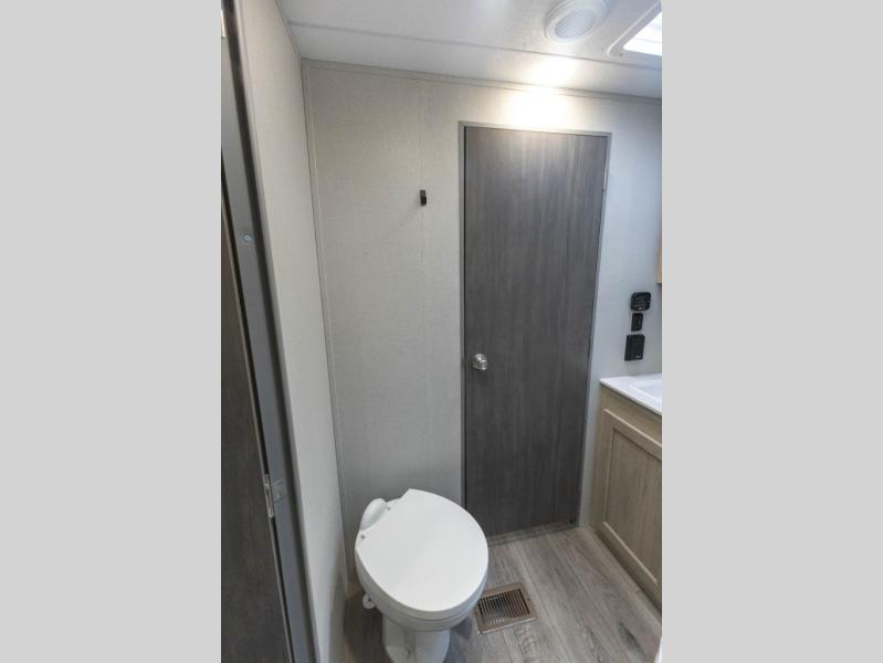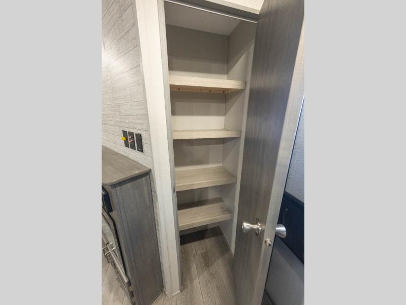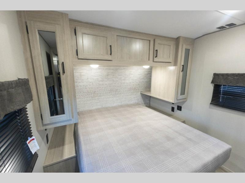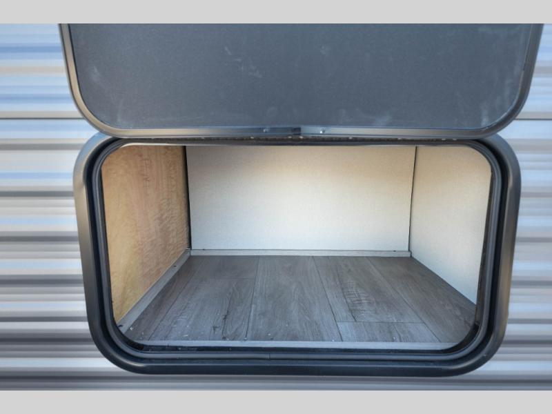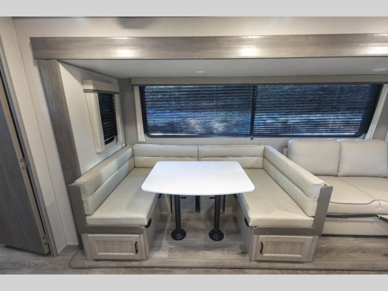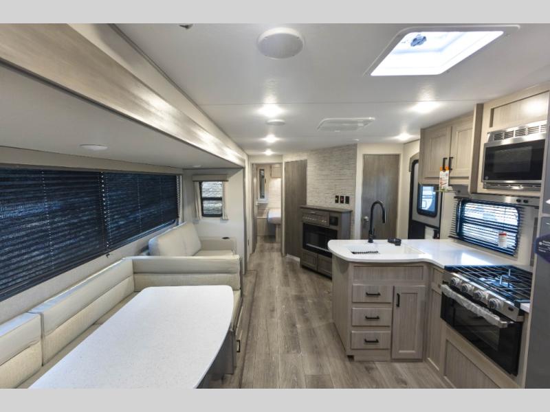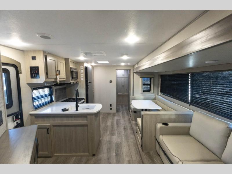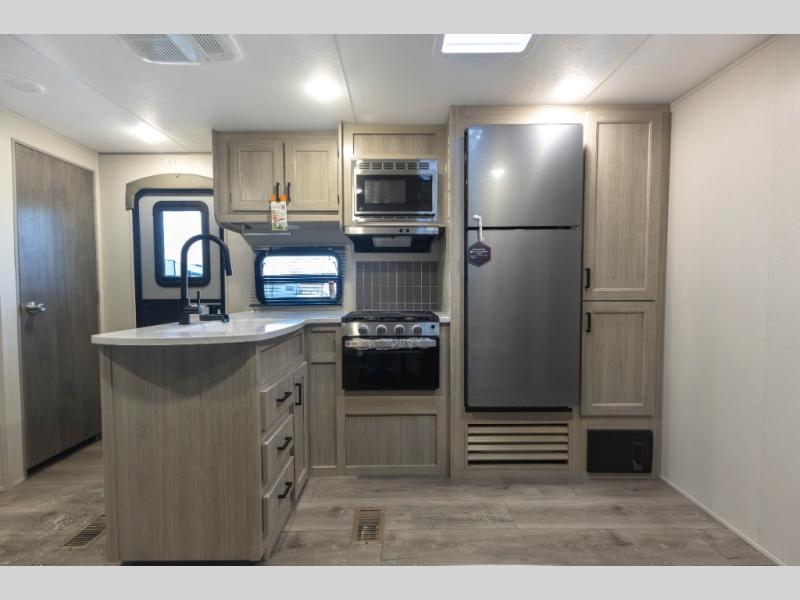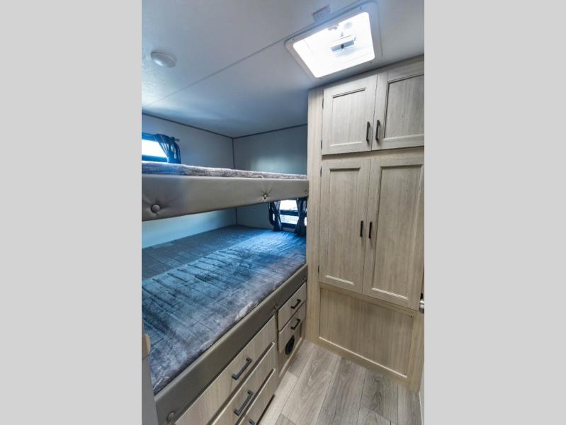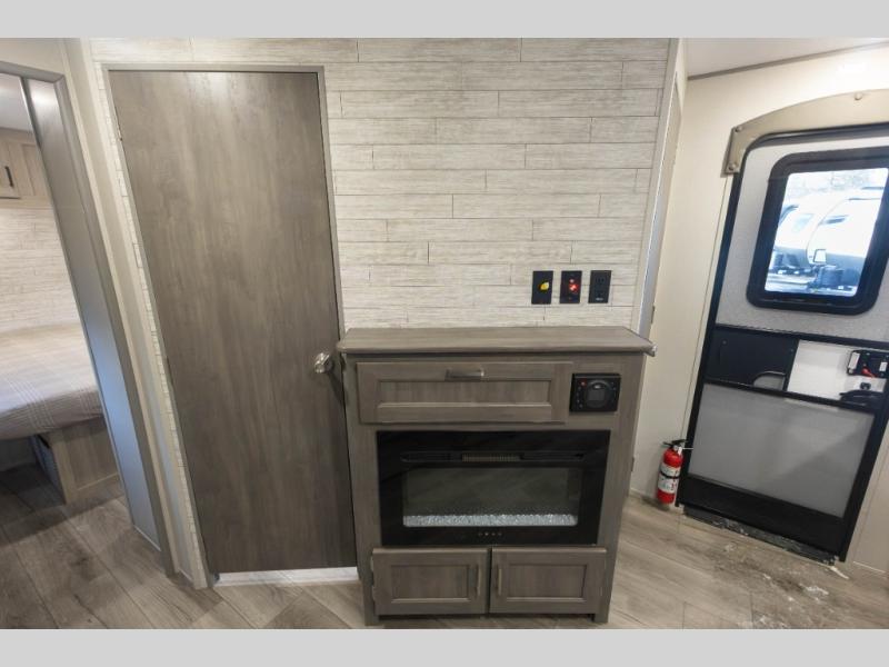 Not only will you be comfortable in this trailer, your friends will have comfort and privacy thanks to having their own bunkhouse with queen-size bunk beds, underbed storage, and a linen closet for clean clothes! The front master bedroom includes a walk-around queen bed, dual wardrobes, plus quick access to the dual entry bath! The combined living and kitchen is spacious thanks to the slide out U-shaped dinette and sofa with drink holders. You can even add the fireplace option if you want that feature. The cook will have full amenities to whip up meals including overhead cabinets for dishes and snacks, plus an outdoor camper kitchen with a pull-out griddle, a cabinet, and a refrigerator!
