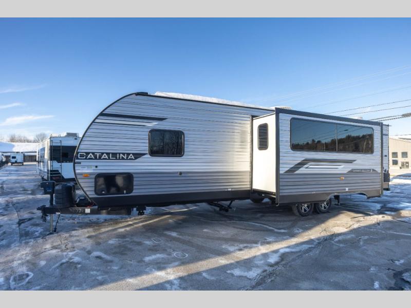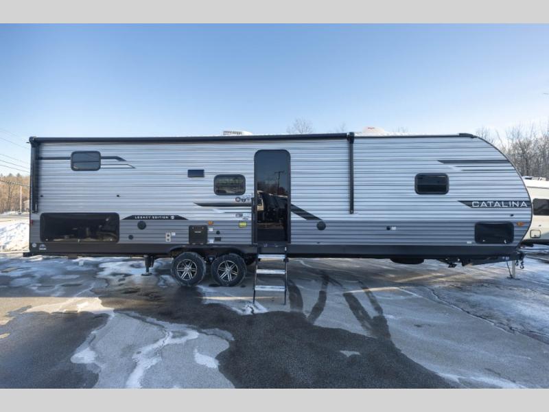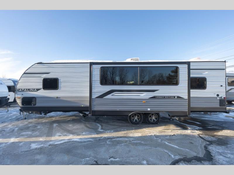 Each Catalina Legacy travel trailer by Coachmen is constructed with a cambered structural steel I-beam frame for added strength and support, plus an enclosed and fully sealed corrugated underbelly to extend your camping season. There is also a seamless Alpha roof membrane, R-7 insulation throughout, full length frame outriggers, plus many more durable construction materials. You will love the 6' 9" interior height, along with Congoleum woodplank linoleum flooring, solid surface kitchen countertops, and hard valance window treatments. Choose a Catalina Legacy today!