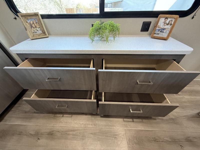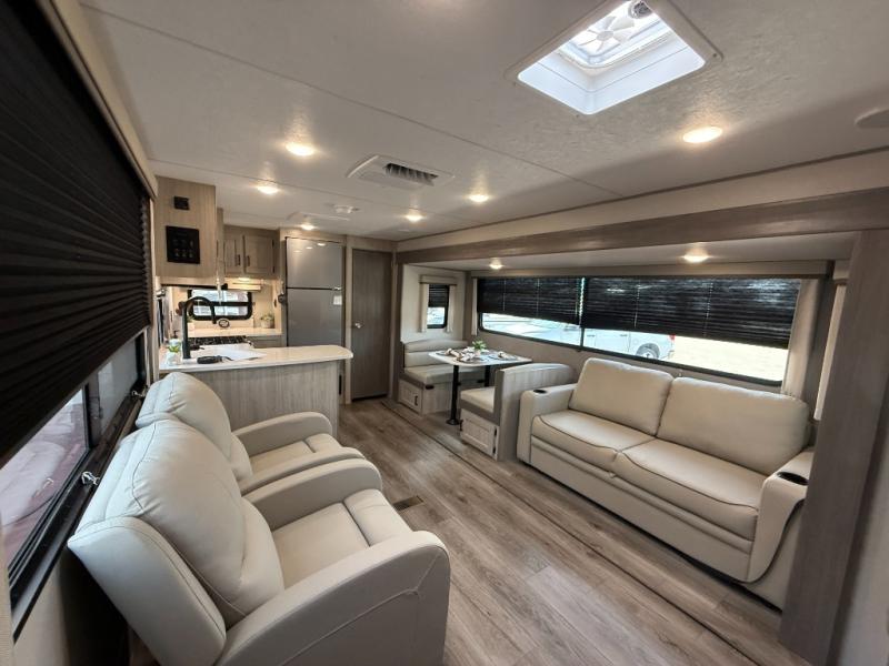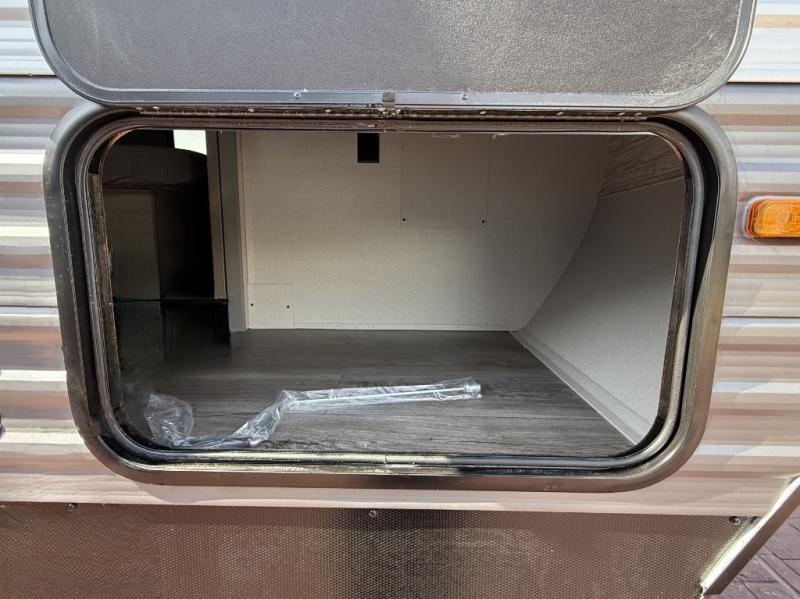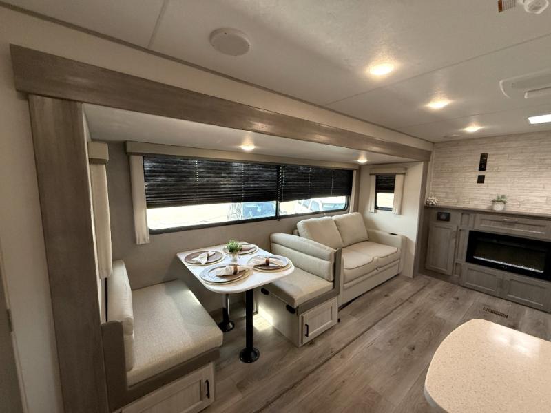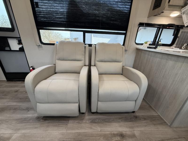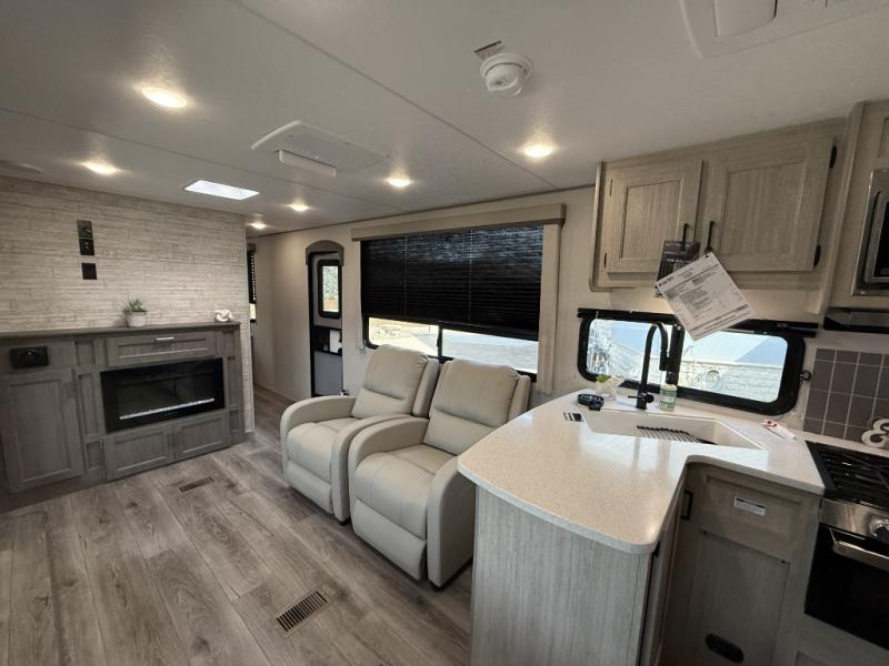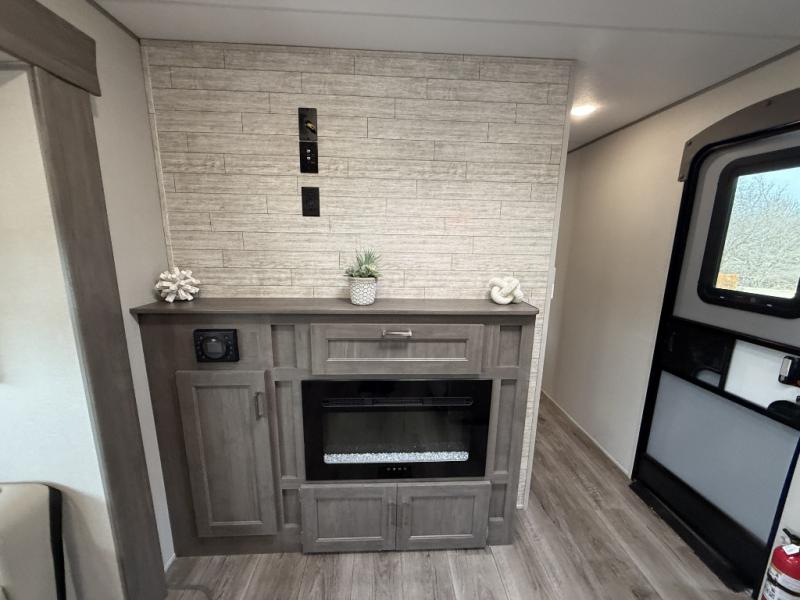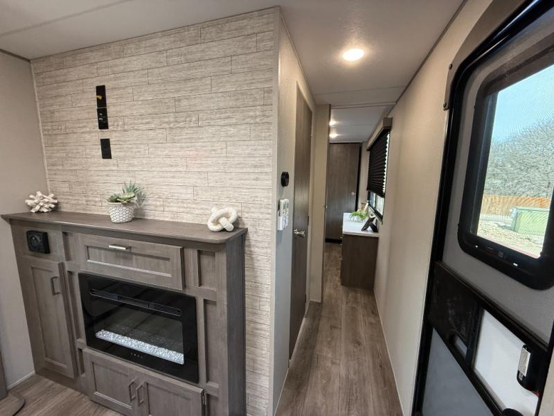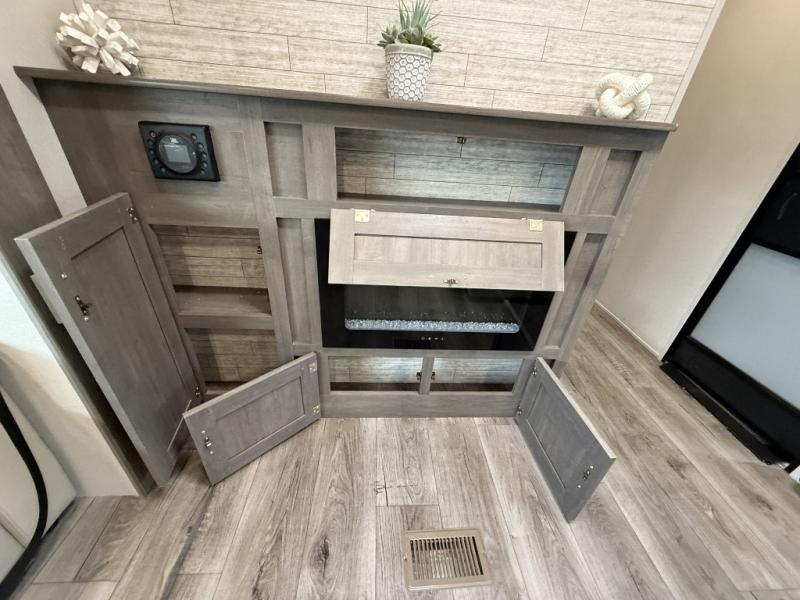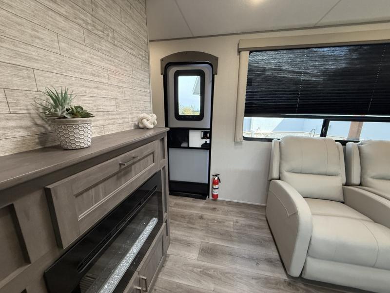 Enjoy relaxing under the 21' electric awning during the daytime for some protection from the sun, and at night with multicolor LED lights to set the mood for the evening. You can store beverages in the exterior mini fridge for convenience, and there is exterior storage for outdoor games and such. The interior is spacious with a large slide out booth dinette and trundle sofa with drink holders, yet you might like to choose the free-standing dinette option in place of the booth dinette. There is also a fireplace option under the entertainment center for a cozier feel. The two recliner lounges are sure to be a favorite spot, and the cook will love the rear kitchen including the U-shaped counter when preparing meals and drying the dishes. The front bedroom features a queen bed slide, a large closet and a dresser, plus second closet with washer and dryer prep.