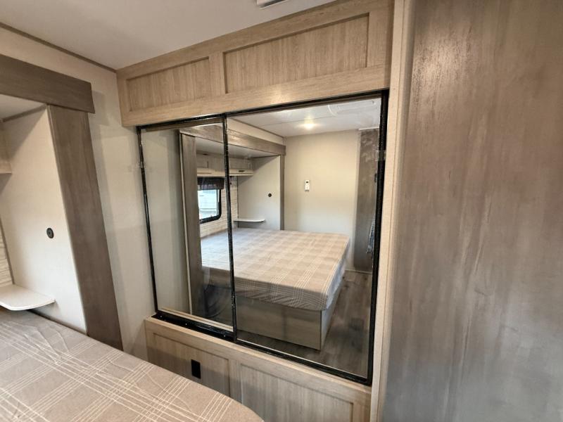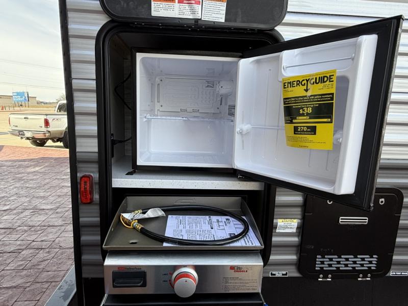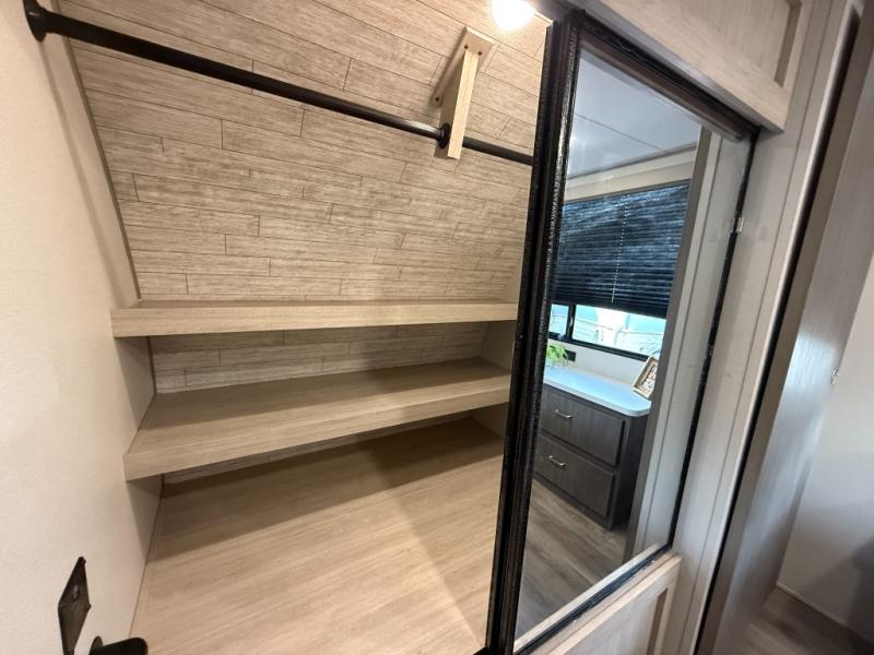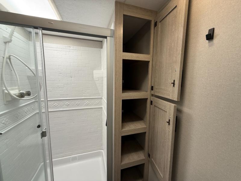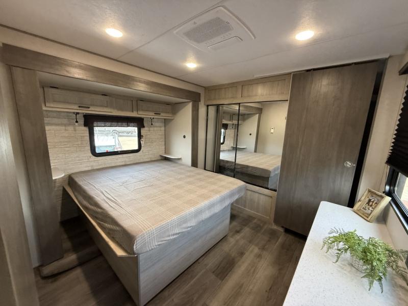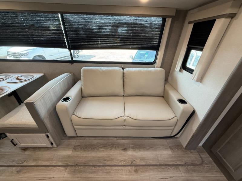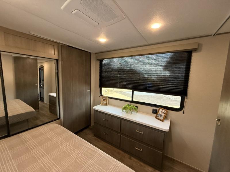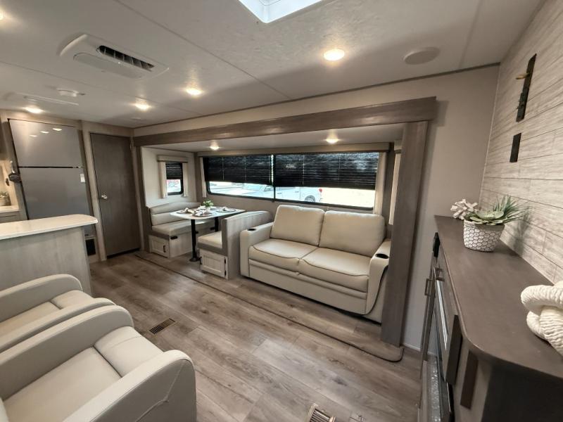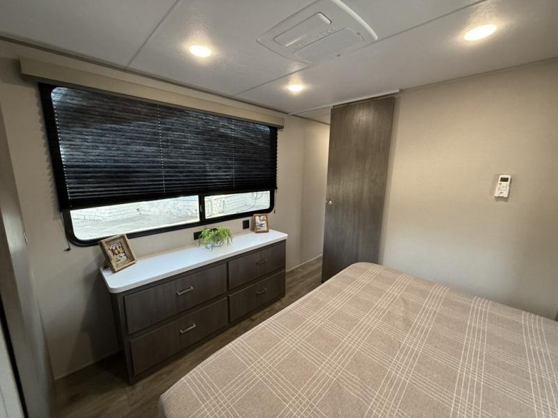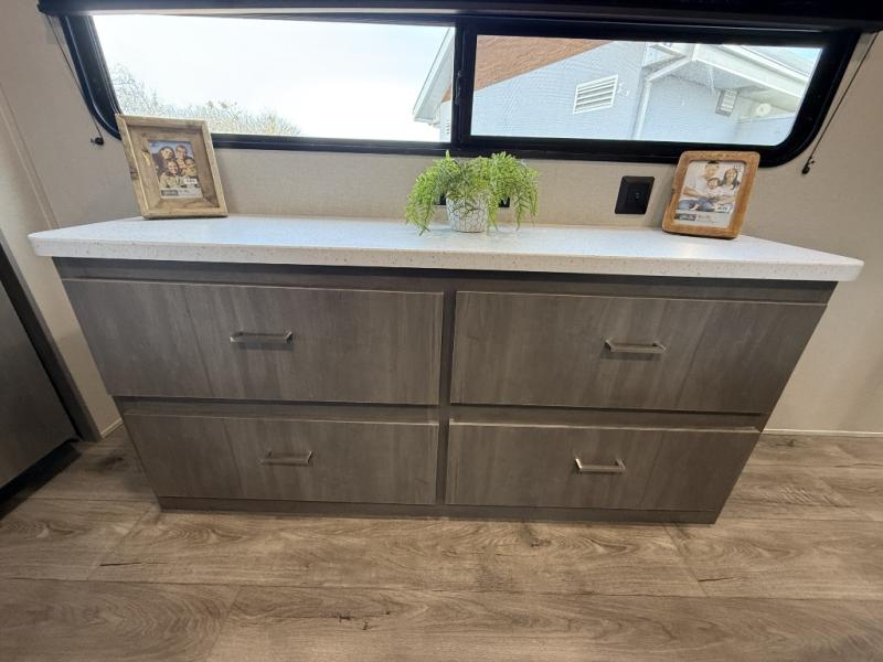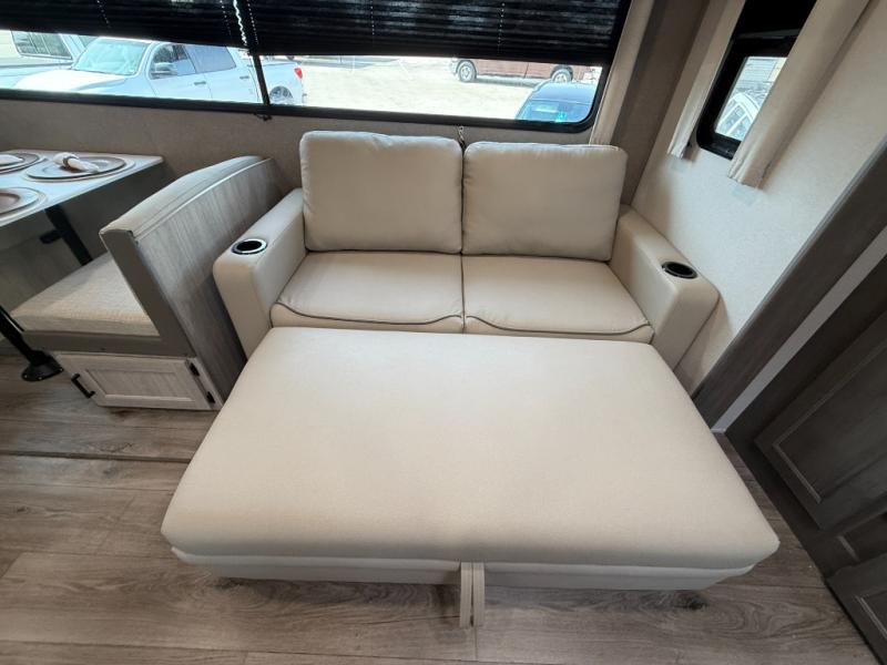 Enjoy relaxing under the 21' electric awning during the daytime for some protection from the sun, and at night with multicolor LED lights to set the mood for the evening. You can store beverages in the exterior mini fridge for convenience, and there is exterior storage for outdoor games and such. The interior is spacious with a large slide out booth dinette and trundle sofa with drink holders, yet you might like to choose the free-standing dinette option in place of the booth dinette. There is also a fireplace option under the entertainment center for a cozier feel. The two recliner lounges are sure to be a favorite spot, and the cook will love the rear kitchen including the U-shaped counter when preparing meals and drying the dishes. The front bedroom features a queen bed slide, a large closet and a dresser, plus second closet with washer and dryer prep.