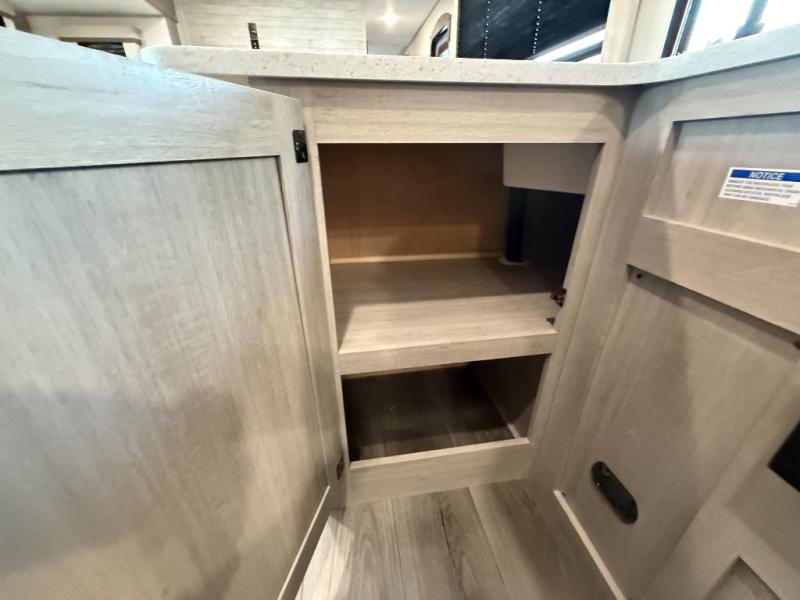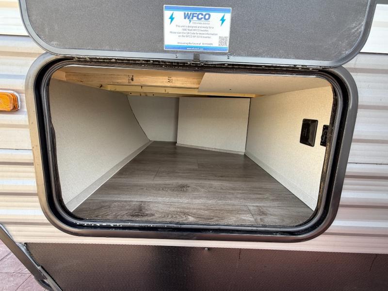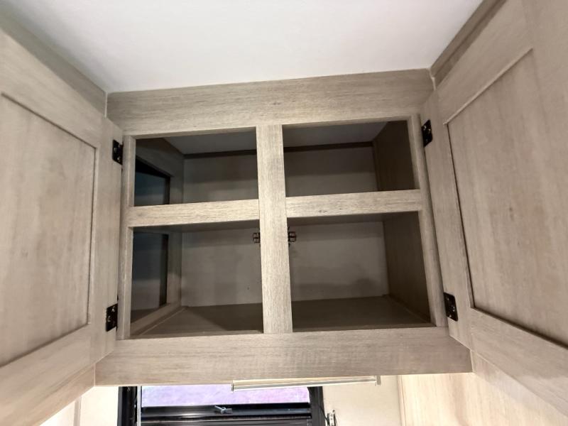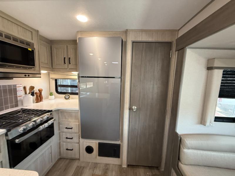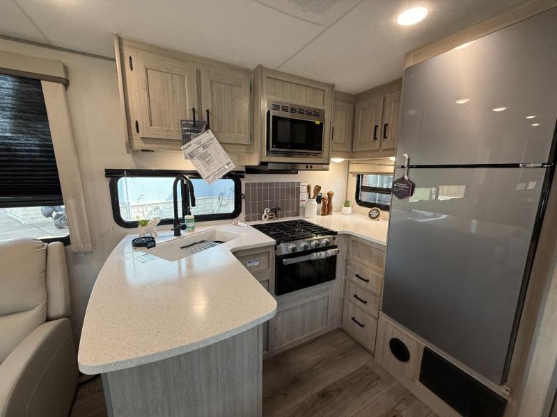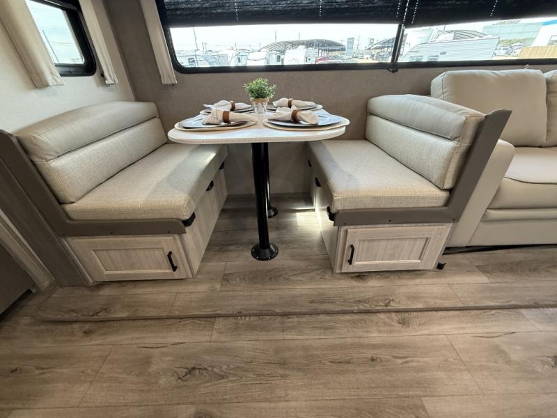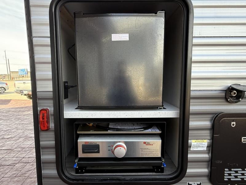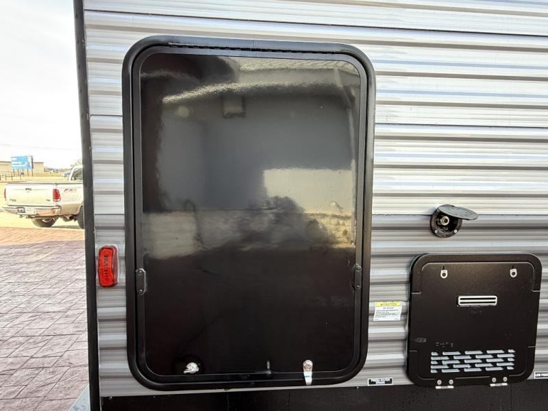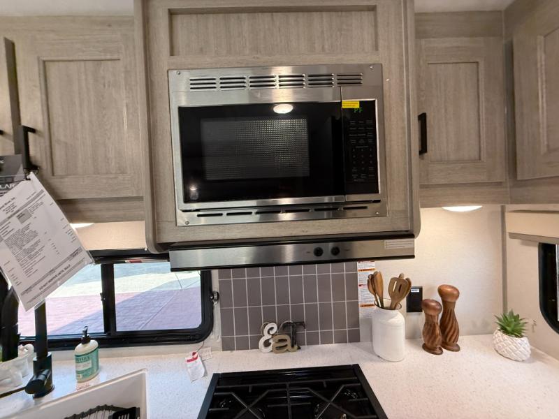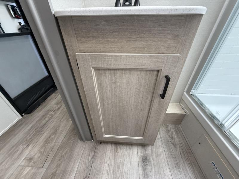 Enjoy relaxing under the 21' electric awning during the daytime for some protection from the sun, and at night with multicolor LED lights to set the mood for the evening. You can store beverages in the exterior mini fridge for convenience, and there is exterior storage for outdoor games and such. The interior is spacious with a large slide out booth dinette and trundle sofa with drink holders, yet you might like to choose the free-standing dinette option in place of the booth dinette. There is also a fireplace option under the entertainment center for a cozier feel. The two recliner lounges are sure to be a favorite spot, and the cook will love the rear kitchen including the U-shaped counter when preparing meals and drying the dishes. The front bedroom features a queen bed slide, a large closet and a dresser, plus second closet with washer and dryer prep.