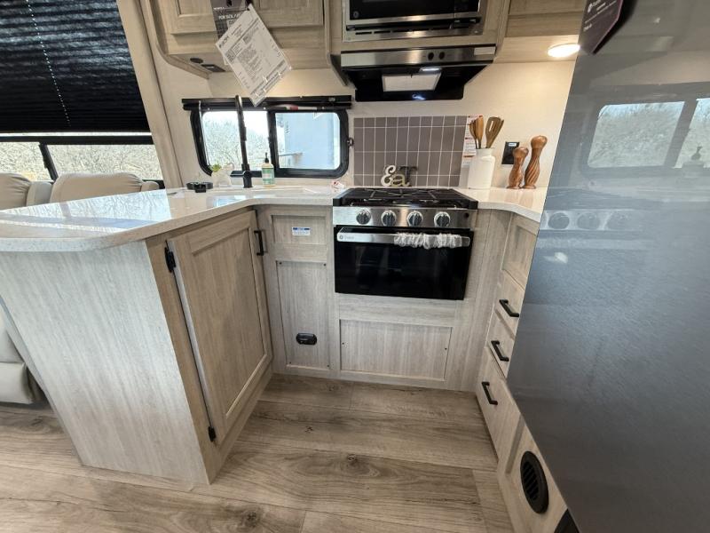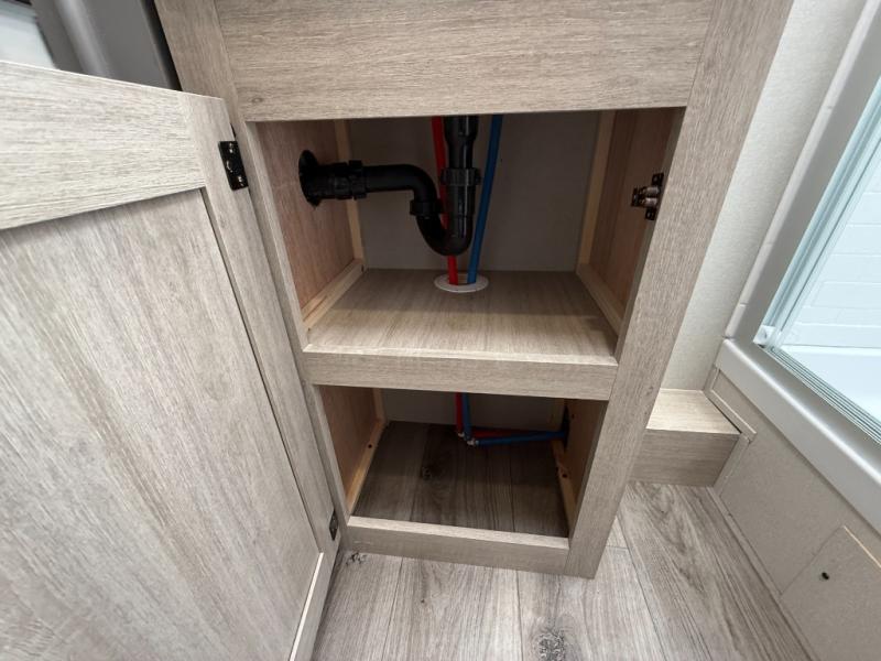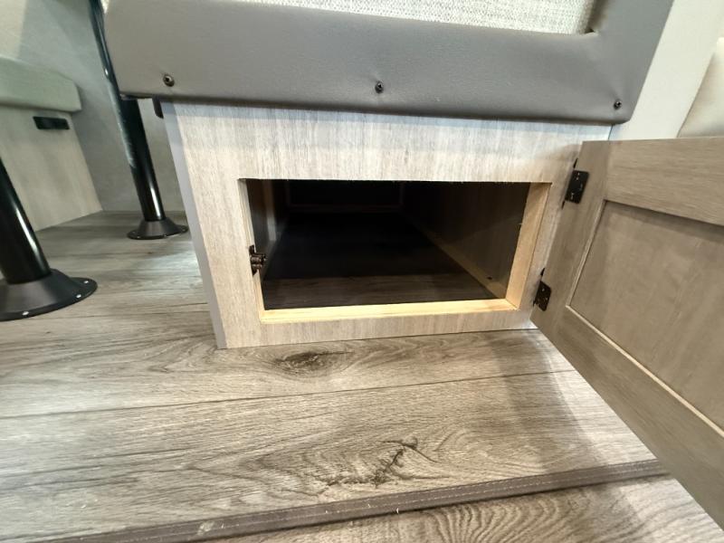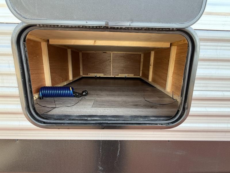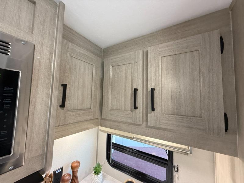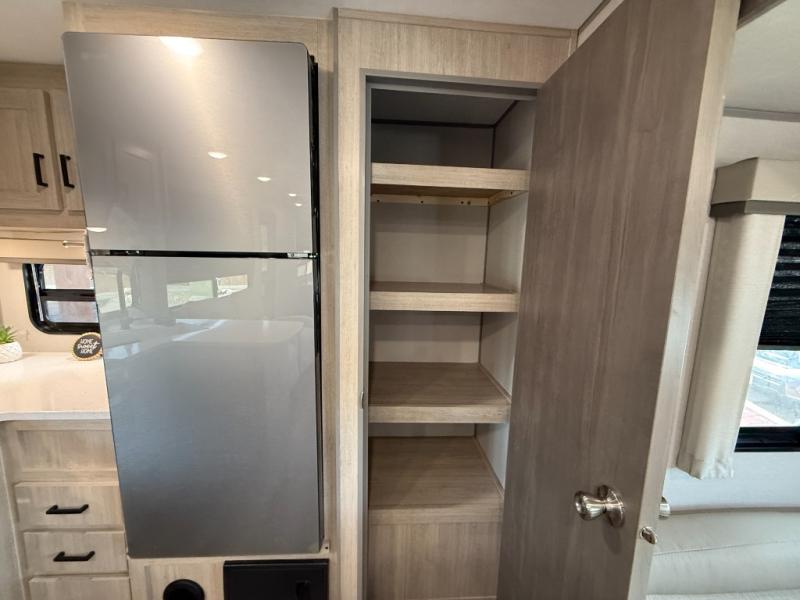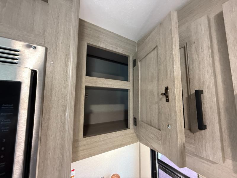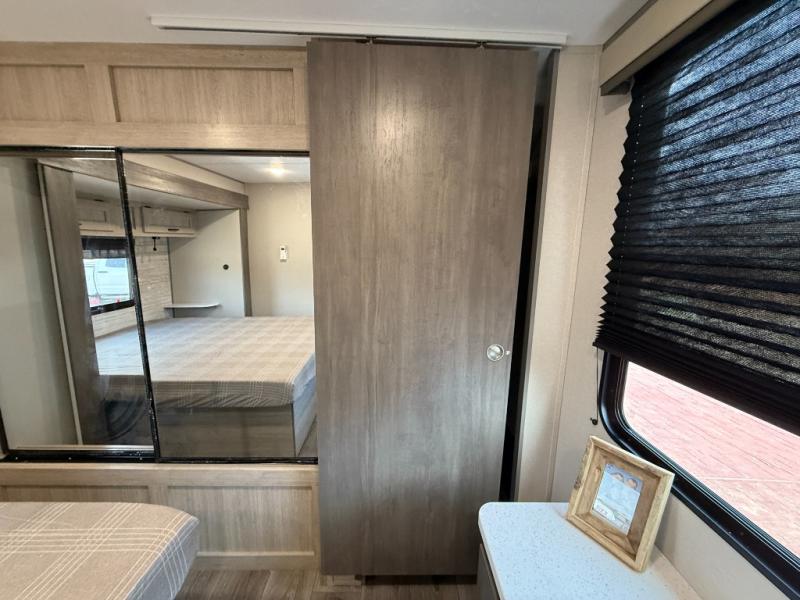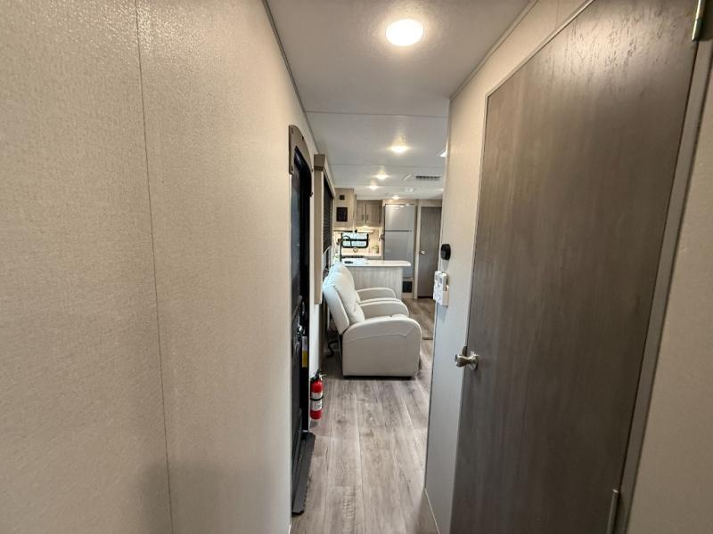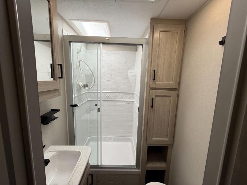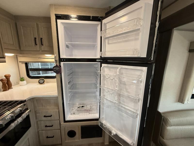 Enjoy relaxing under the 21' electric awning during the daytime for some protection from the sun, and at night with multicolor LED lights to set the mood for the evening. You can store beverages in the exterior mini fridge for convenience, and there is exterior storage for outdoor games and such. The interior is spacious with a large slide out booth dinette and trundle sofa with drink holders, yet you might like to choose the free-standing dinette option in place of the booth dinette. There is also a fireplace option under the entertainment center for a cozier feel. The two recliner lounges are sure to be a favorite spot, and the cook will love the rear kitchen including the U-shaped counter when preparing meals and drying the dishes. The front bedroom features a queen bed slide, a large closet and a dresser, plus second closet with washer and dryer prep.