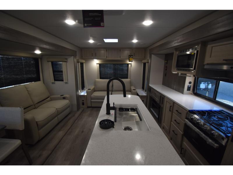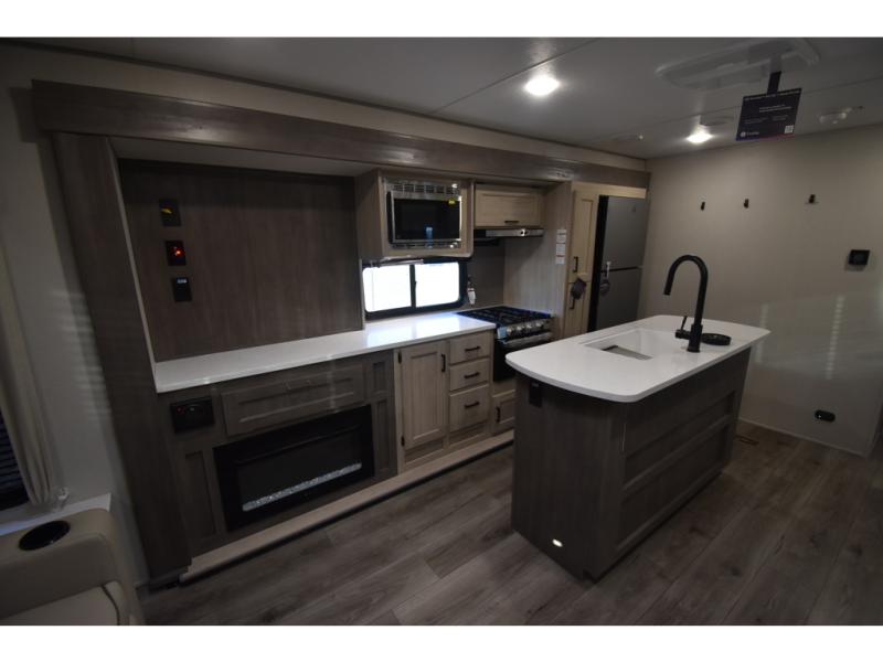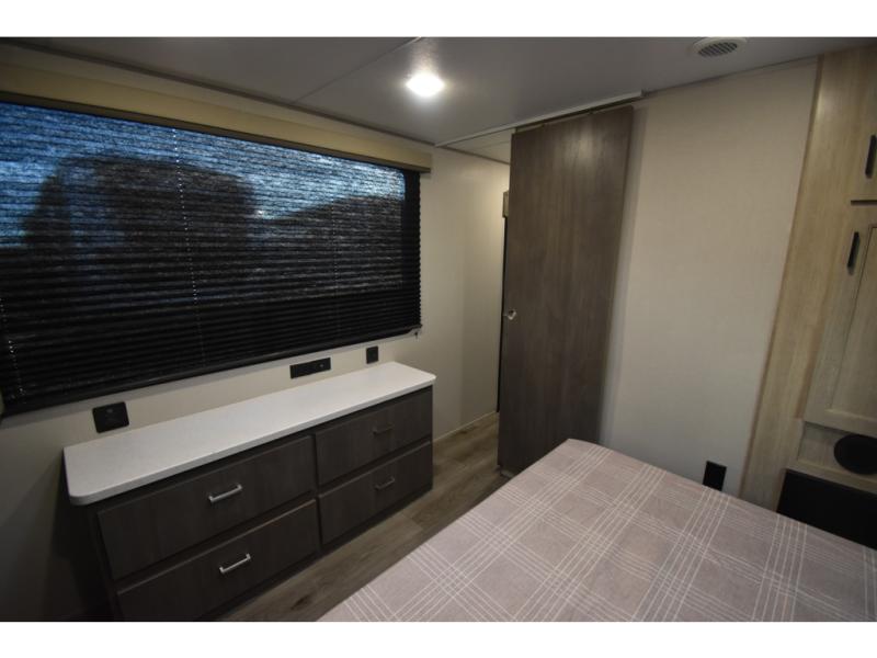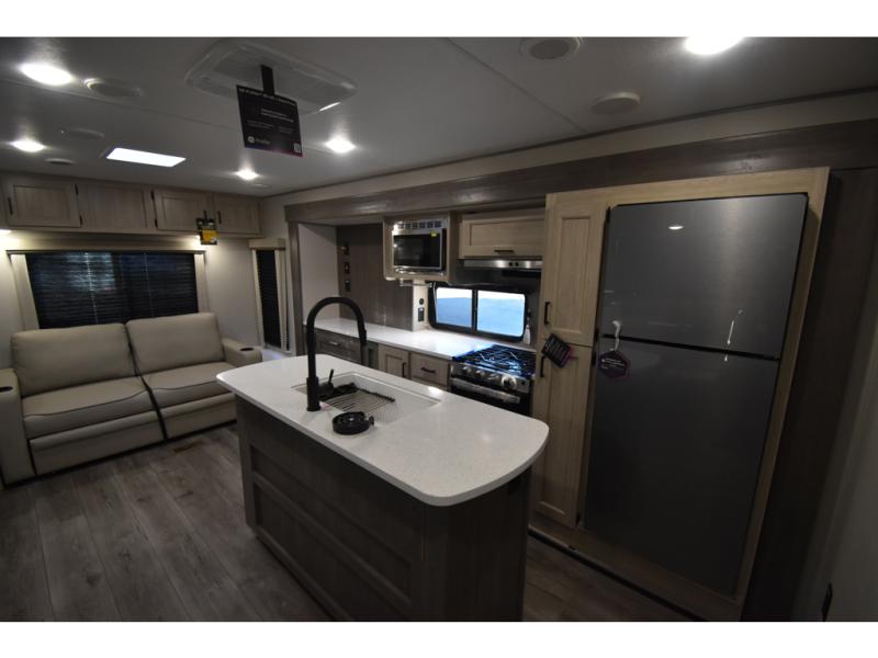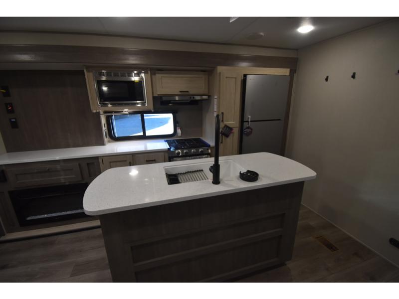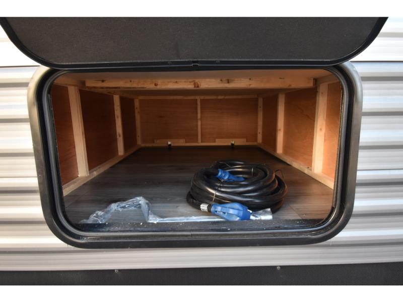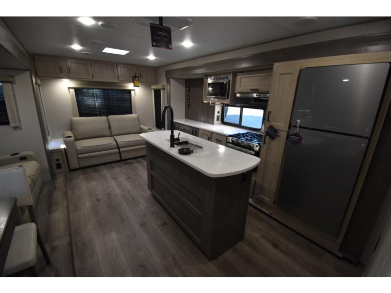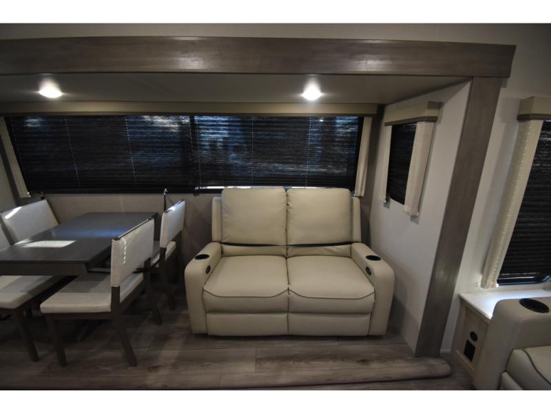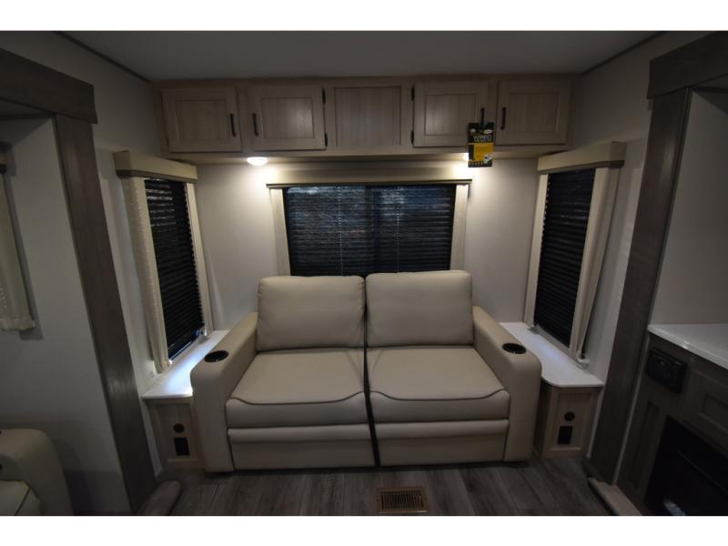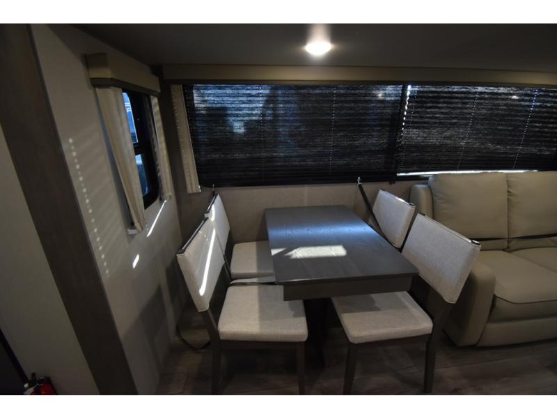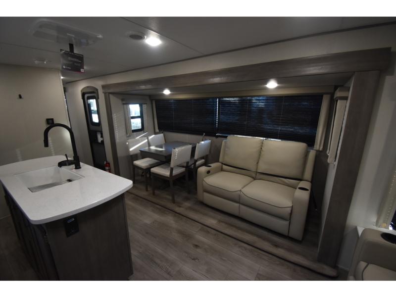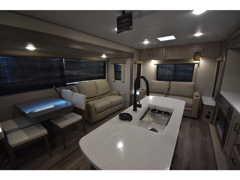 It's not hard to find comfort in this travel trailer with its triple slides, theater seating, and spacious full bath. Once your crew is settled and unpacked, head outdoors to relax under the two power awnings with multicolored LED lights, or grab the fishing poles from the exterior storage and head to the water. If you'd rather spend your day inside you'll find all the comforts of home; theater seating, a sofa and booth dinette, plus a fully equipped kitchen, complete with a kitchen island! You will love having your own space in the front bedroom that includes a queen bed slide out, a dresser, plus two closets. There is even washer and dryer prep if you plan to go full-time!
