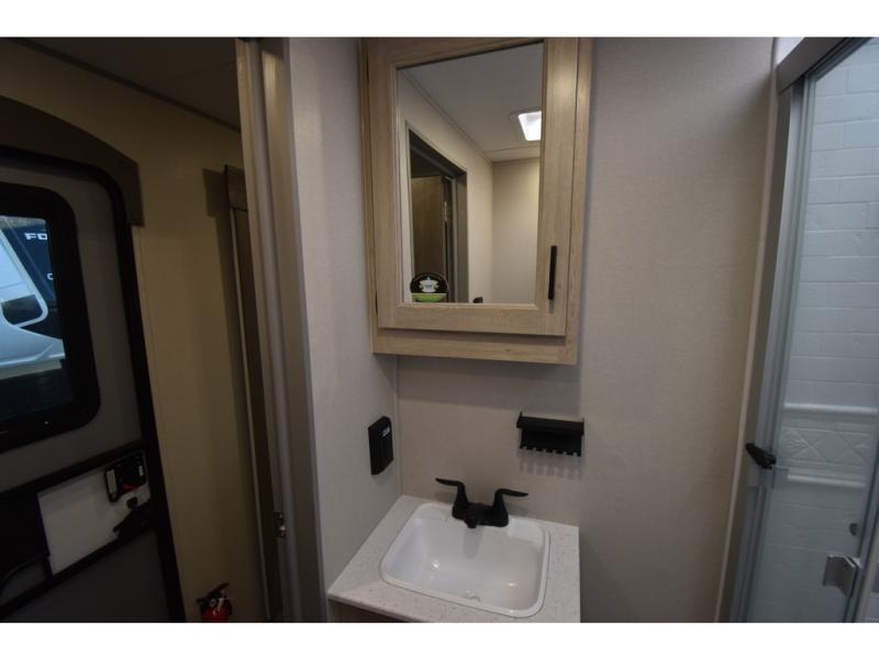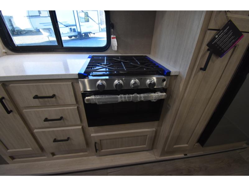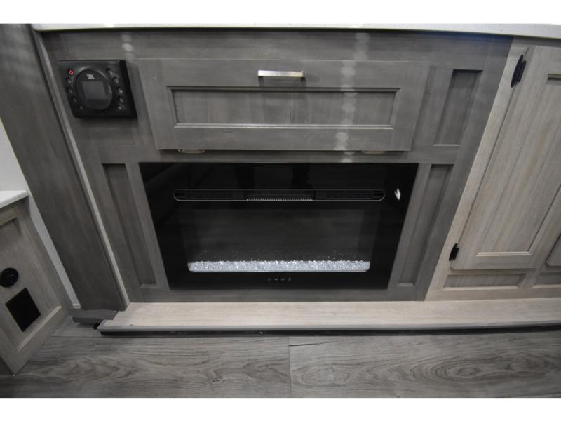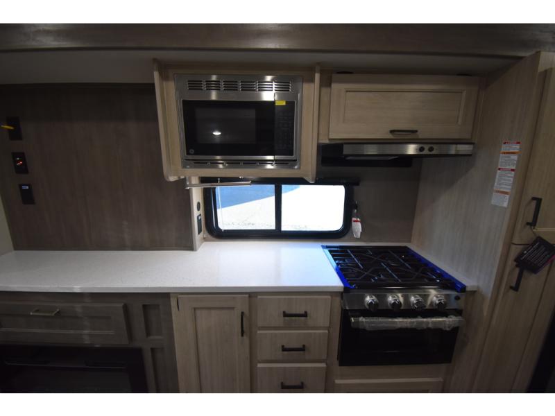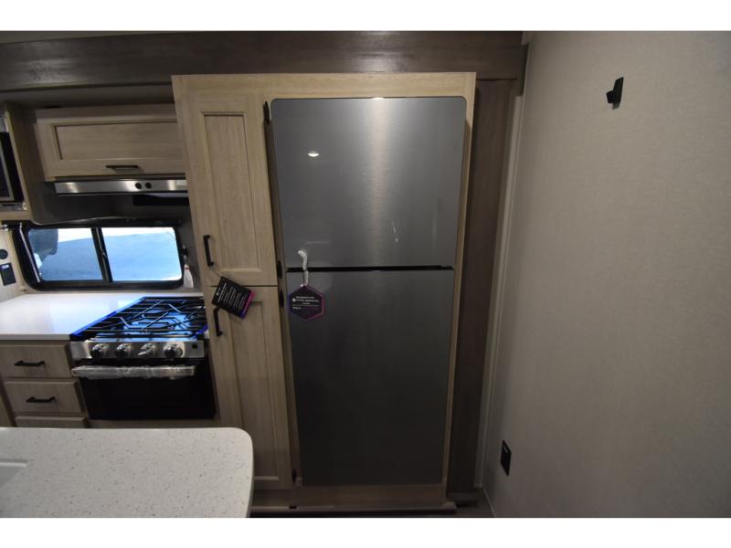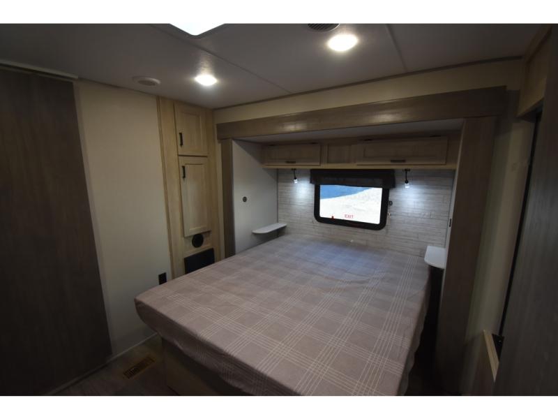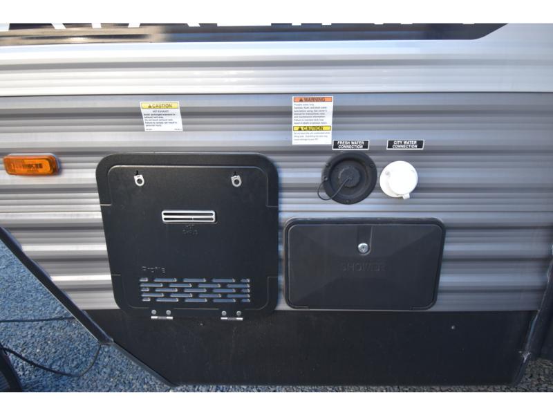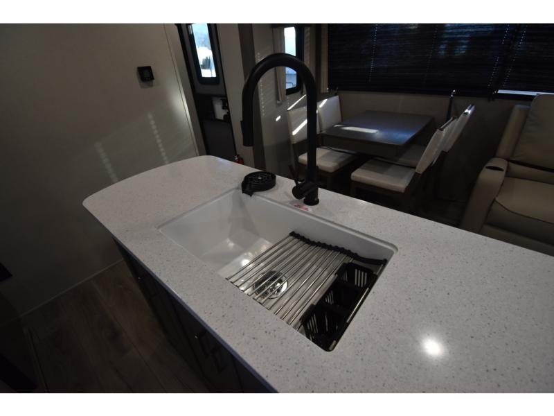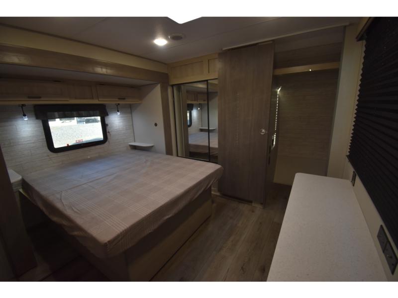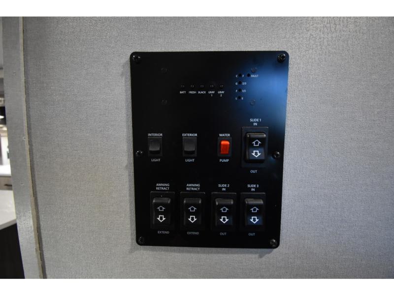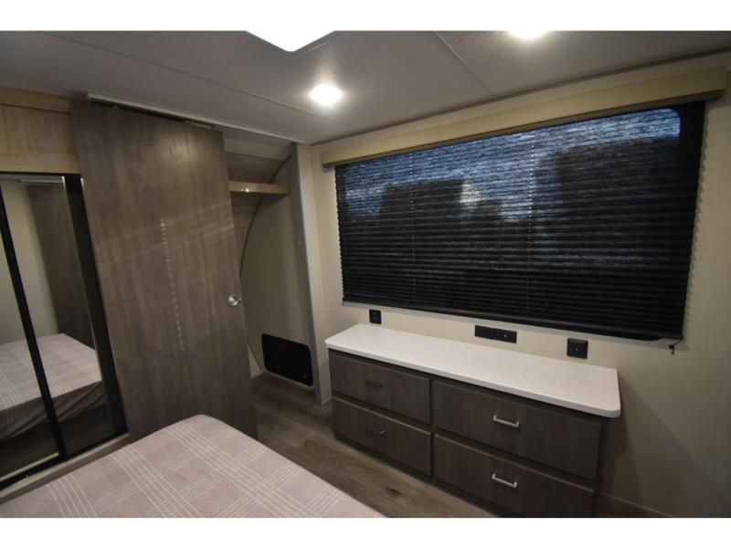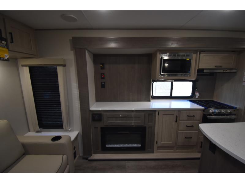 It's not hard to find comfort in this travel trailer with its triple slides, theater seating, and spacious full bath. Once your crew is settled and unpacked, head outdoors to relax under the two power awnings with multicolored LED lights, or grab the fishing poles from the exterior storage and head to the water. If you'd rather spend your day inside you'll find all the comforts of home; theater seating, a sofa and booth dinette, plus a fully equipped kitchen, complete with a kitchen island! You will love having your own space in the front bedroom that includes a queen bed slide out, a dresser, plus two closets. There is even washer and dryer prep if you plan to go full-time!