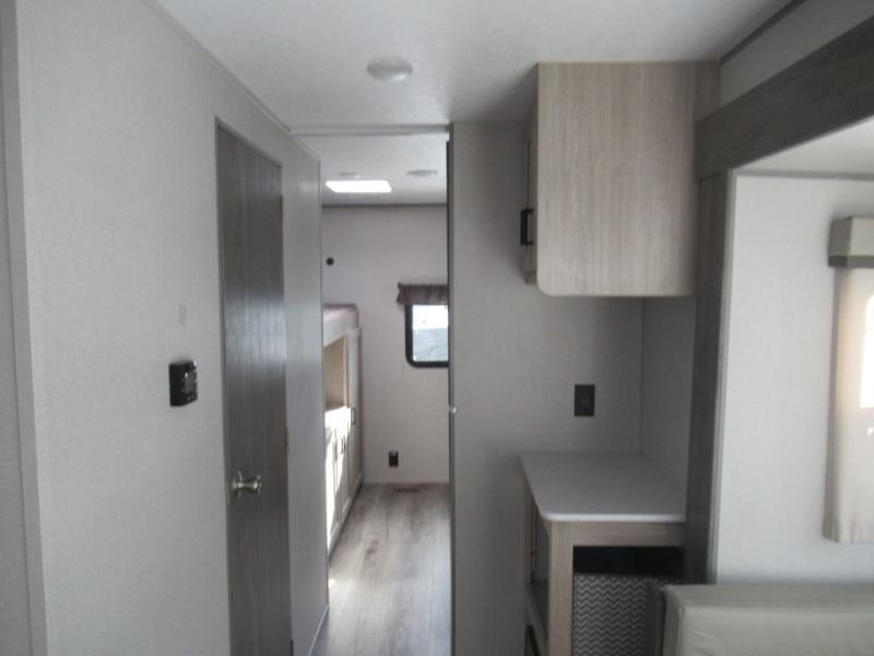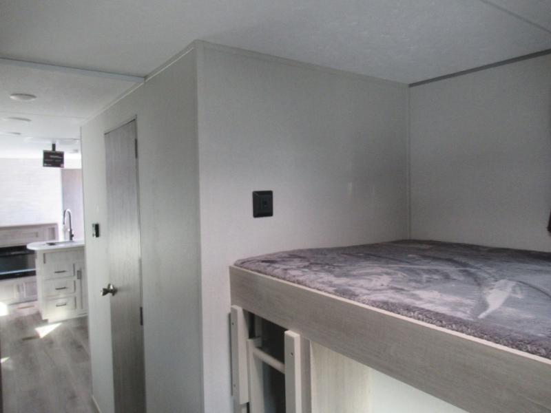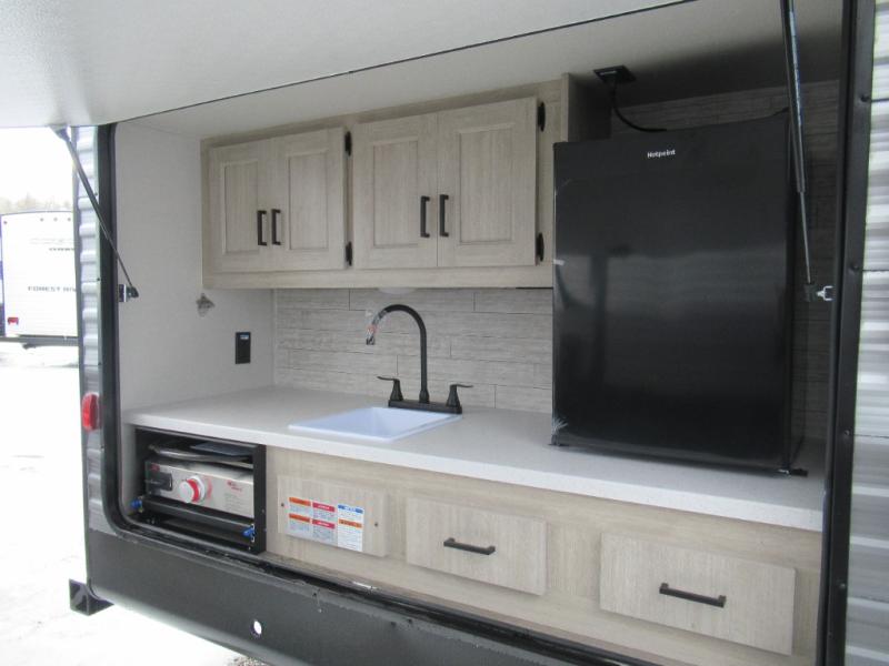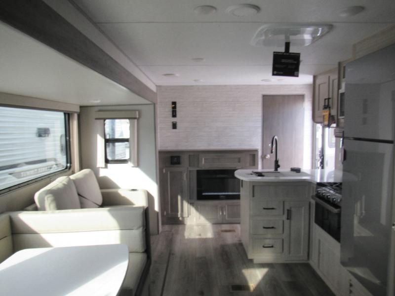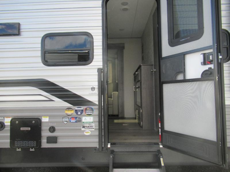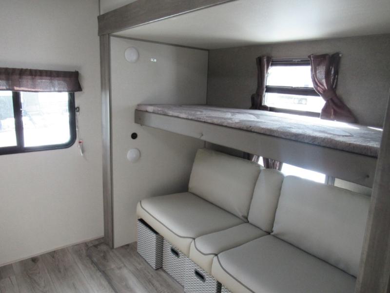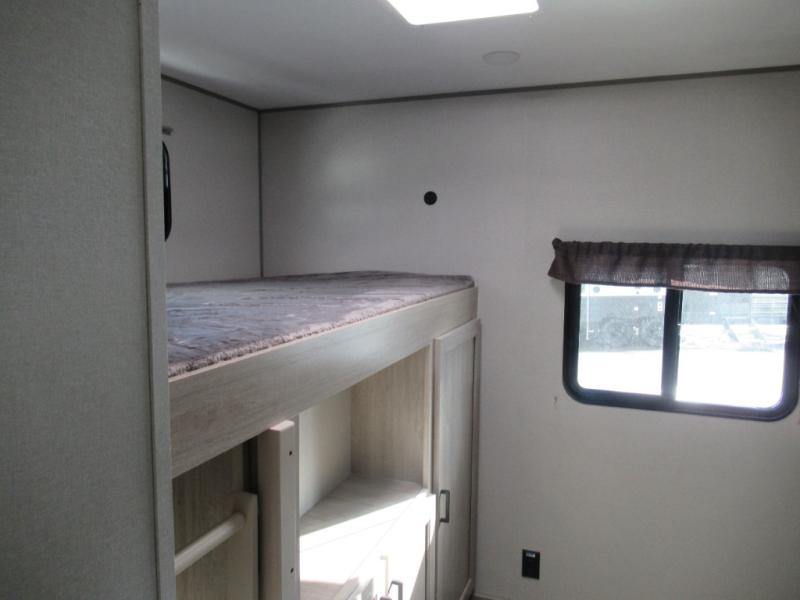 If you enjoy hiking, biking, and fishing, and waking up to beautiful scenery from your own comforts, then start camping with this trailer at the campsite! You will be able to sleep like a queen on the walk-around bed with dual wardrobes and overhead storage for more items in the front private bedroom while your family or friends have their own privacy in the bunkhouse complete with two bunks, a jack knife sofa with storage totes below and a TV/wardrobe cabinet for even more storage. The full bathroom includes the second entry/exit door for convenience when outside under the 21' electric awning with multicolor LED lights, or while cooking using the full-size camper kitchen along the exterior. There are full kitchen amenities inside including a 10.7 cu. ft. refrigerator and a pantry.
