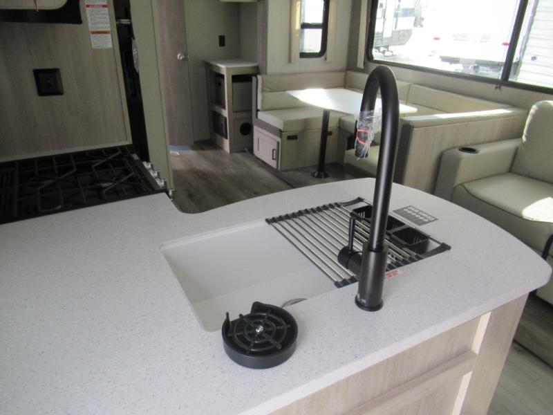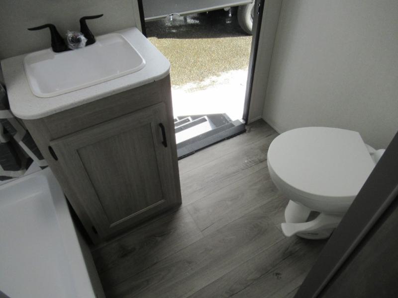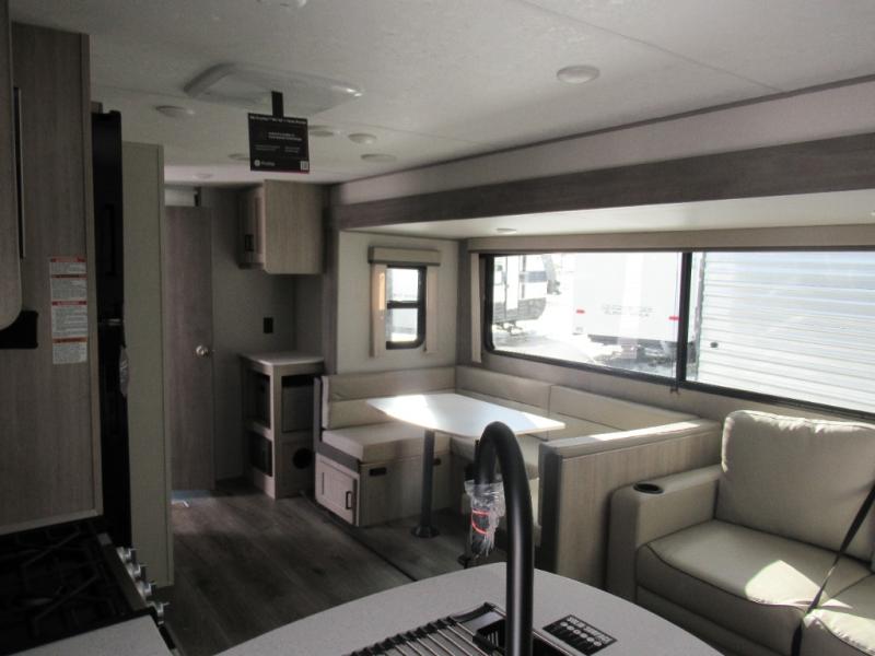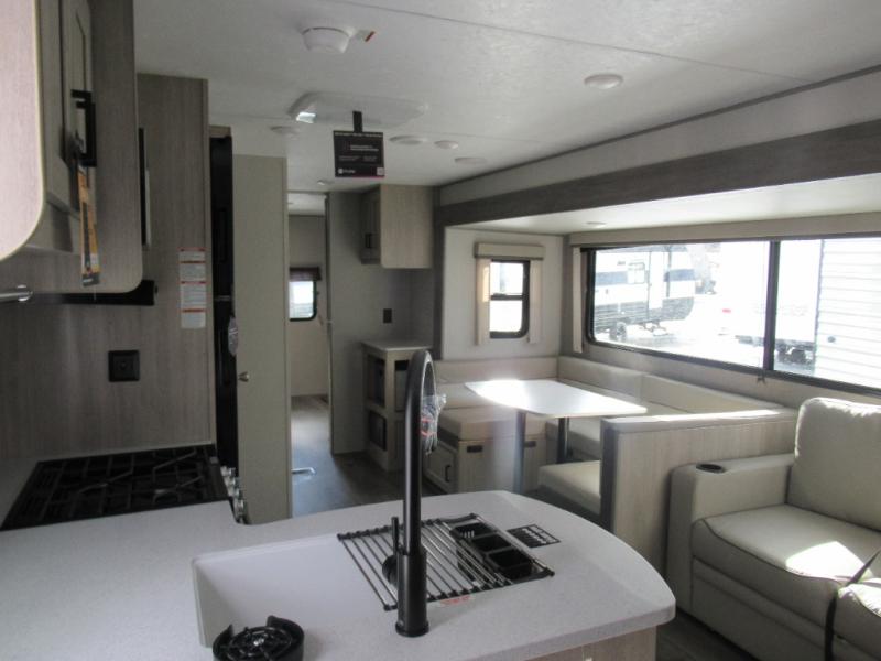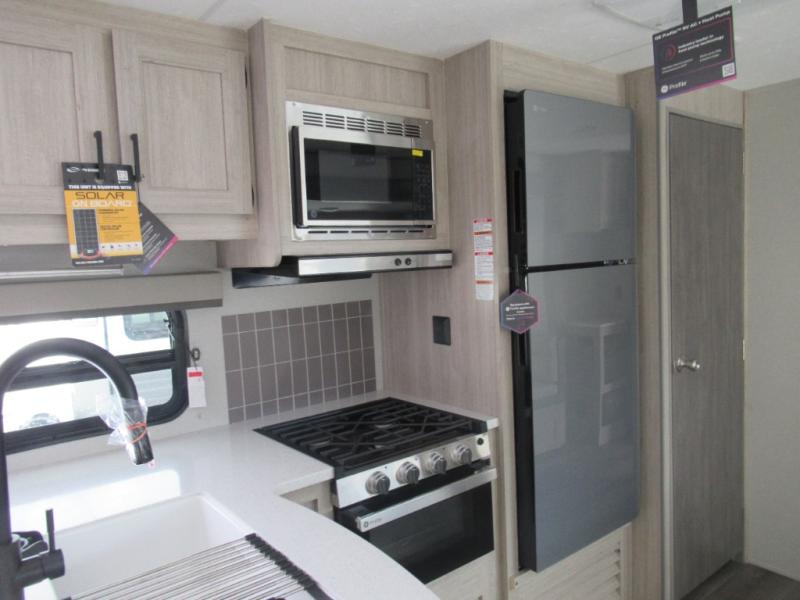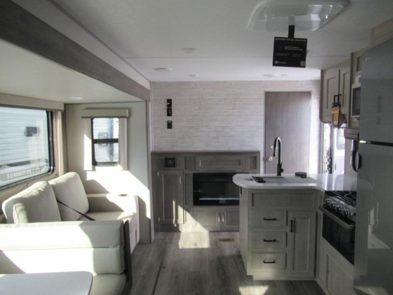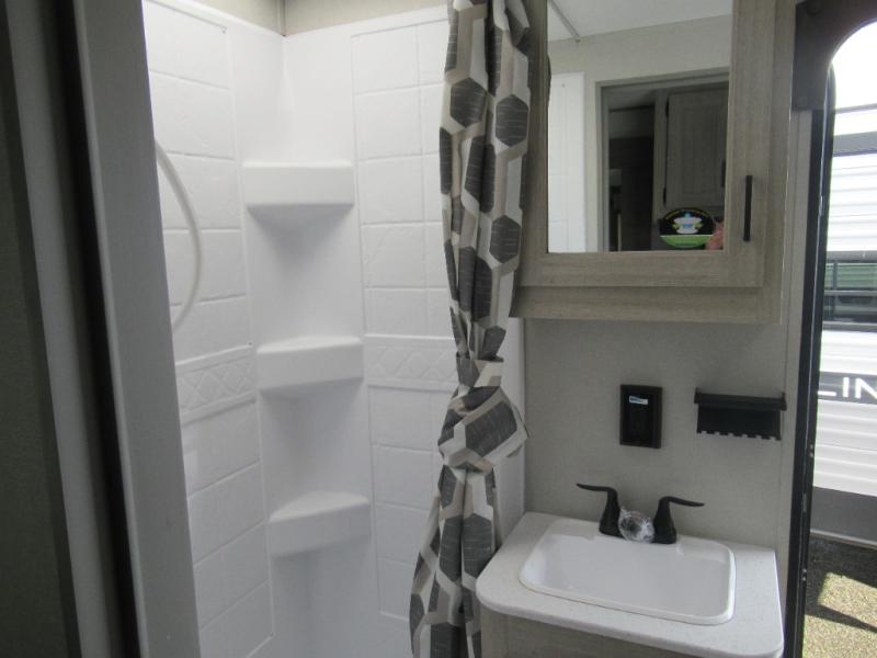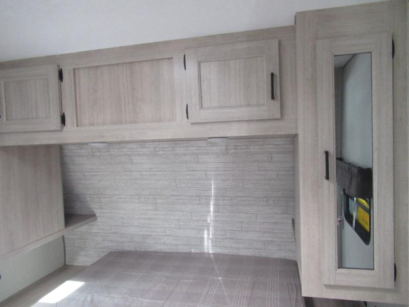 If you enjoy hiking, biking, and fishing, and waking up to beautiful scenery from your own comforts, then start camping with this trailer at the campsite! You will be able to sleep like a queen on the walk-around bed with dual wardrobes and overhead storage for more items in the front private bedroom while your family or friends have their own privacy in the bunkhouse complete with two bunks, a jack knife sofa with storage totes below and a TV/wardrobe cabinet for even more storage. The full bathroom includes the second entry/exit door for convenience when outside under the 21' electric awning with multicolor LED lights, or while cooking using the full-size camper kitchen along the exterior. There are full kitchen amenities inside including a 10.7 cu. ft. refrigerator and a pantry.