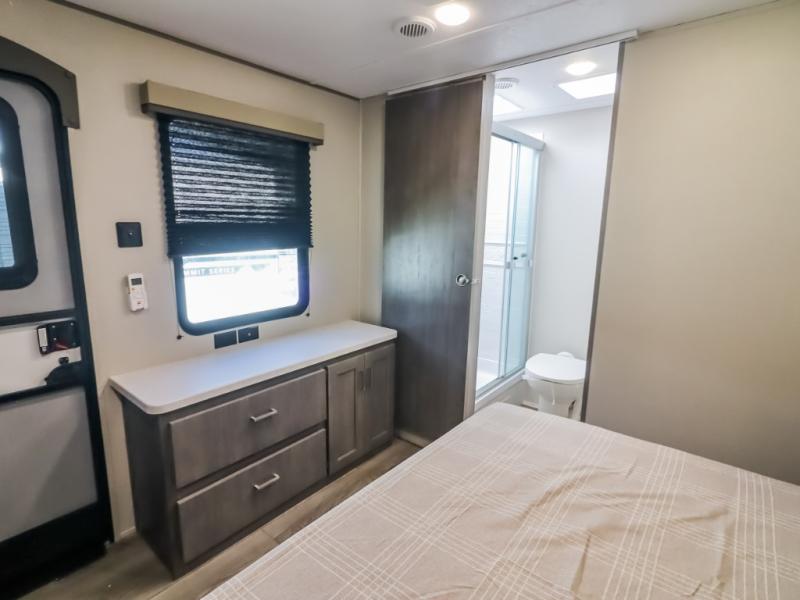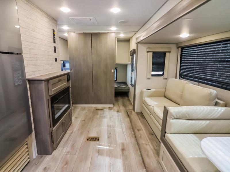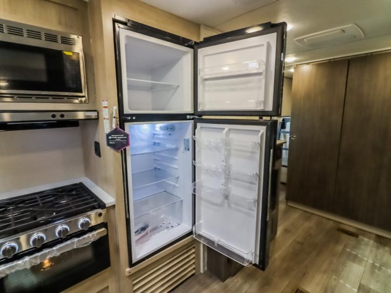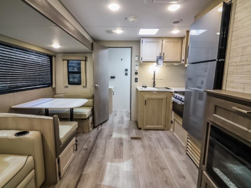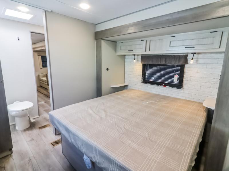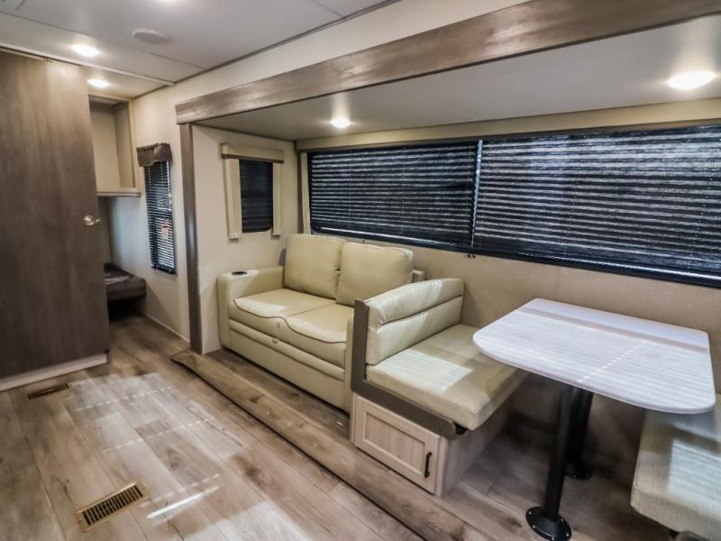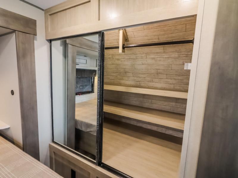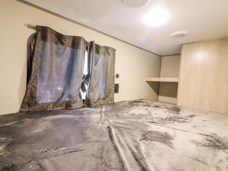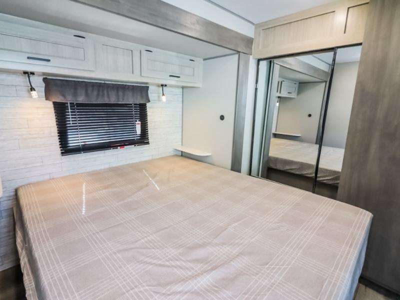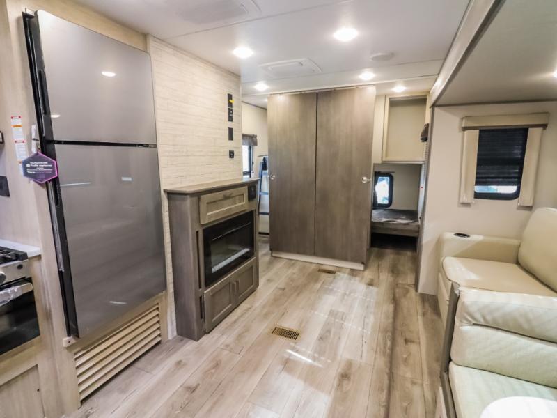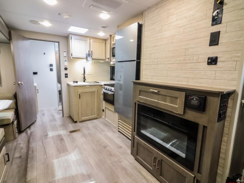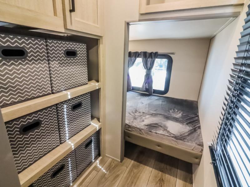 The bunk beds are perfect for the crew: kids, friends, or family, everyone’s comfy. The trundle sofa is a great spot for extra chill time or accommodating guests. The dinette is ideal for meals, homework, or game nights. And with the entertainment center, movie nights are a breeze. The walk-in closet/pantry gives you plenty of space to stash snacks, drinks, and more. The kitchen’s equipped with a refrigerator, microwave, and sink, perfect for easy meals and quick bites. Further, the walk-through bathroom is super handy, so you can refresh and get ready without fuss. In addition, the queen bed is perfect for having comfy nights ahead, and the overhead cabinets, dresser, and closet are ideal for keeping things tidy and organized.