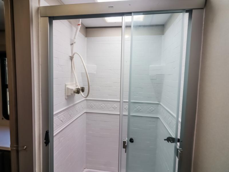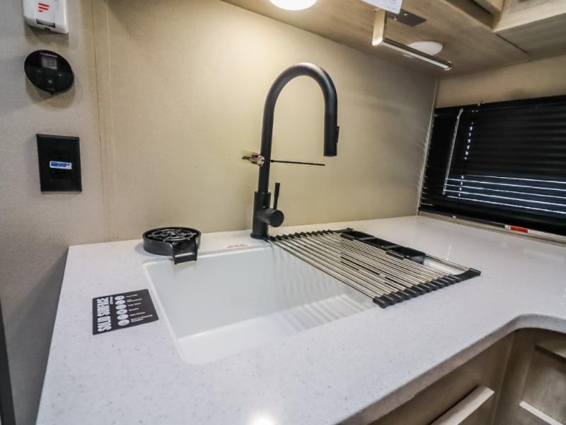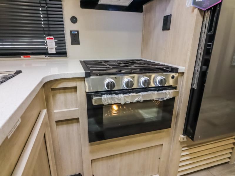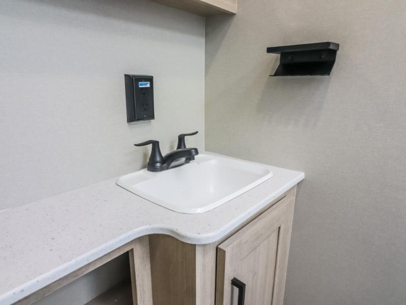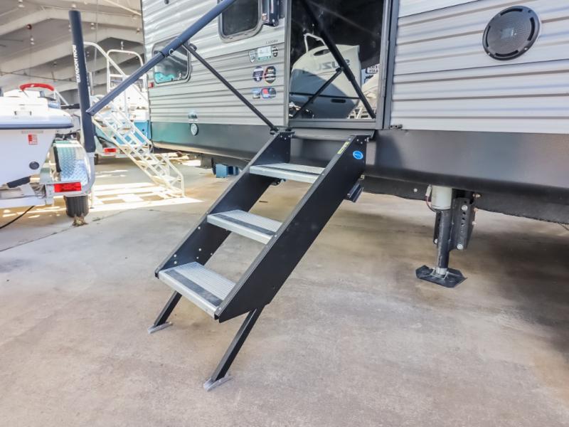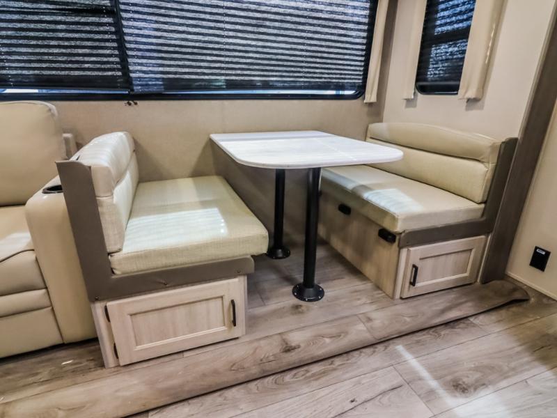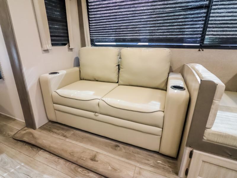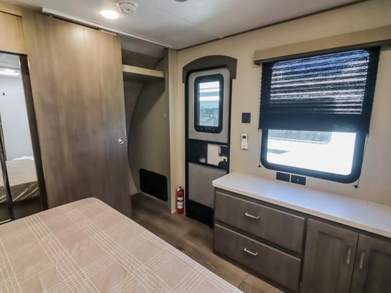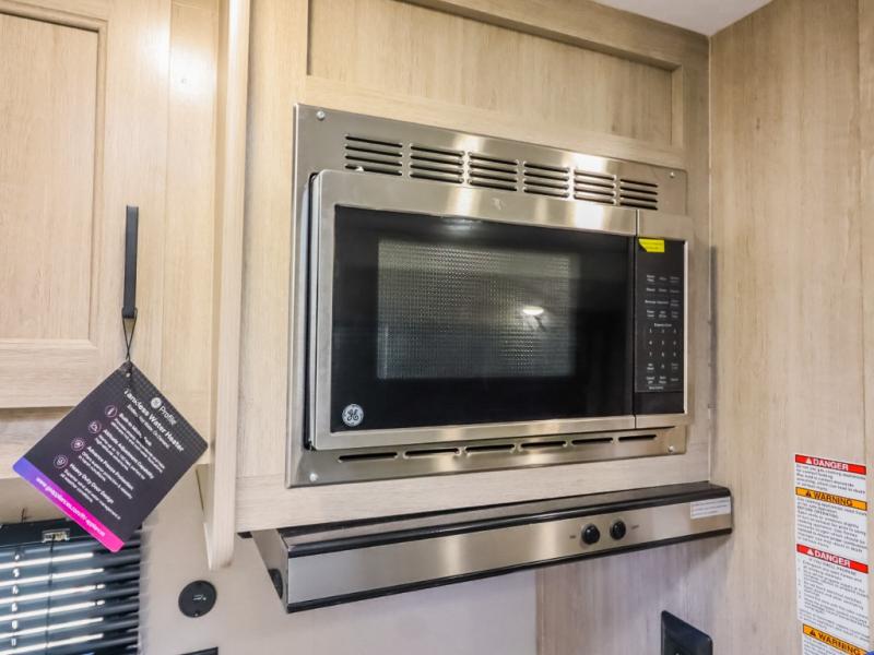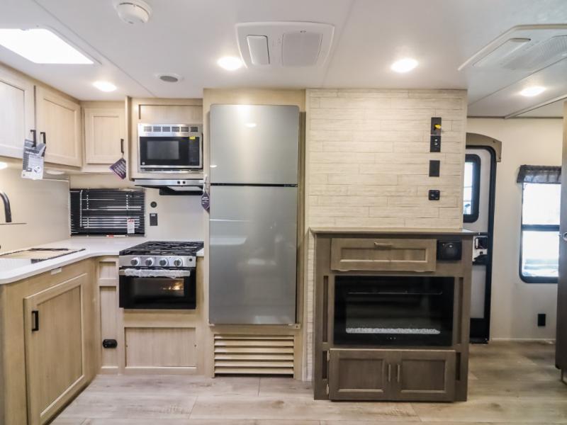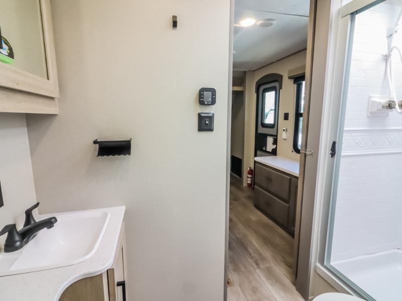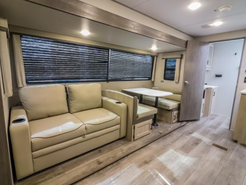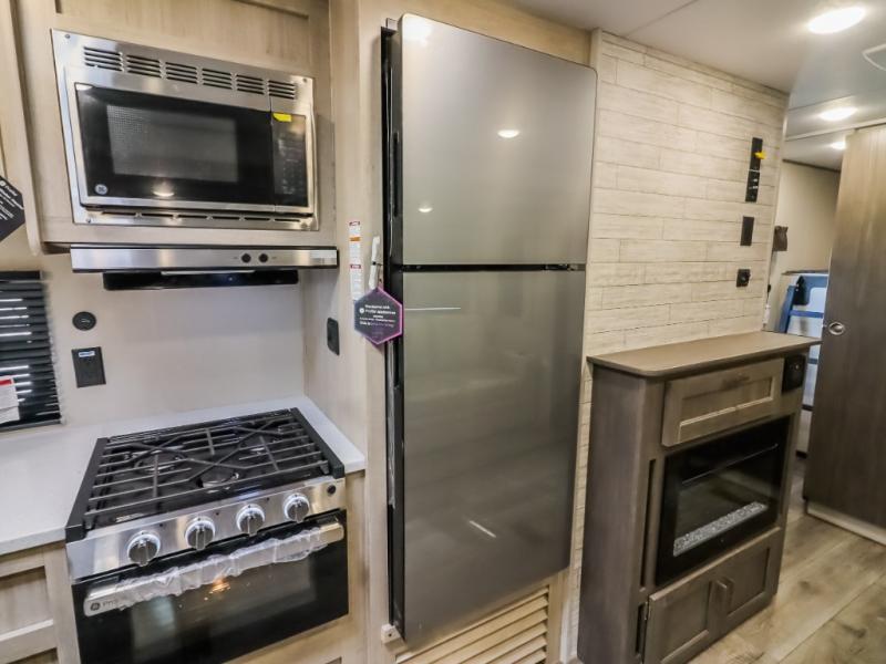 The bunk beds are perfect for the crew: kids, friends, or family, everyone’s comfy. The trundle sofa is a great spot for extra chill time or accommodating guests. The dinette is ideal for meals, homework, or game nights. And with the entertainment center, movie nights are a breeze. The walk-in closet/pantry gives you plenty of space to stash snacks, drinks, and more. The kitchen’s equipped with a refrigerator, microwave, and sink, perfect for easy meals and quick bites. Further, the walk-through bathroom is super handy, so you can refresh and get ready without fuss. In addition, the queen bed is perfect for having comfy nights ahead, and the overhead cabinets, dresser, and closet are ideal for keeping things tidy and organized.
