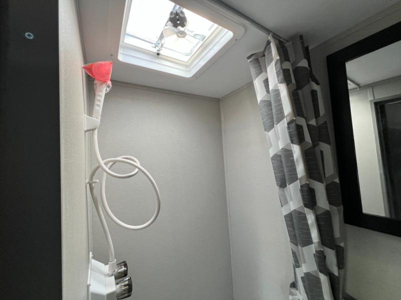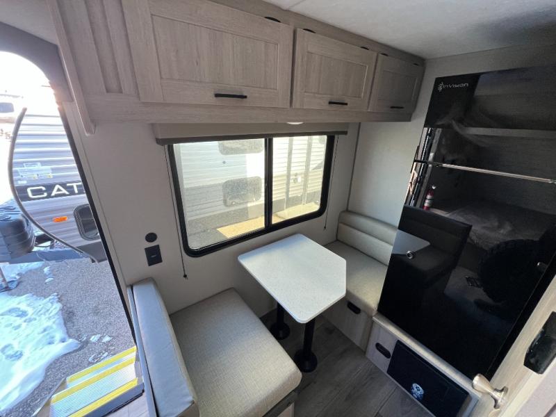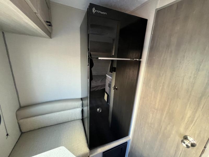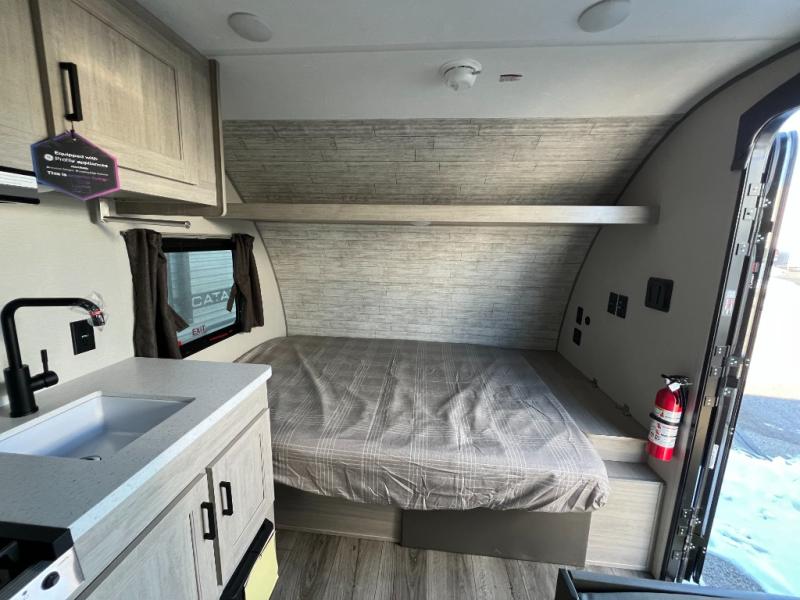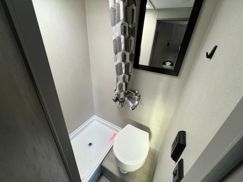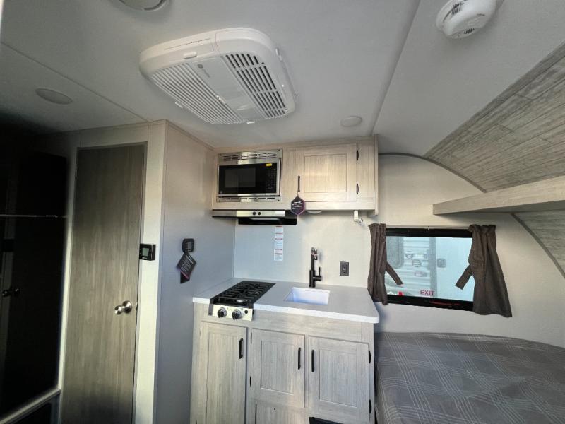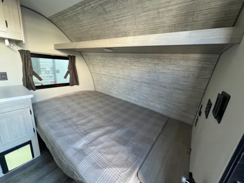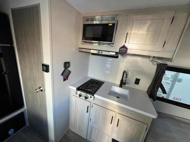 Lightweight camping is easier than you think with this travel trailer in tow! The front 54" x 74" bed will provide a great night's rest each night, while your overnight guest takes the booth dinette. There is a handy shelf above the front bed for your belongings plus additional bedroom storage. A private bath includes a 24" x 32" shower and a toilet with a mirror behind it so you can freshen up each day. You'll also find a two burner cooktop and microwave oven to make meals each day plus a 3.3 cu. ft. 12V refrigerator for food storage!