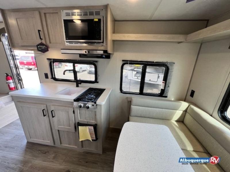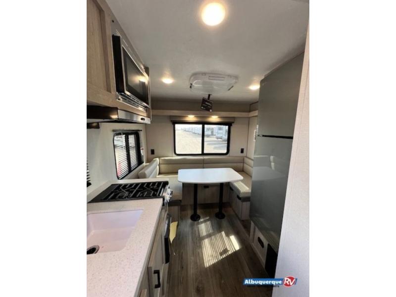 The perfect unit for a cozy weekend retreat for two or three! There is a queen bed up front with overhead storage and more at the foot of the bed to keep your things tidy. The rear of the unit offers a U-shaped dinette that is great for watching TV or playing cards and games, plus it has an end table and a handy overhead shelf. A mid-coach bath includes a 36" x 30" shower and toilet with foot flush, and a mirror. This model also includes a GE two burner cooktop, a GE stainless microwave oven, plus a 3.3 cu. ft. 12V refrigerator to keep food fresh!