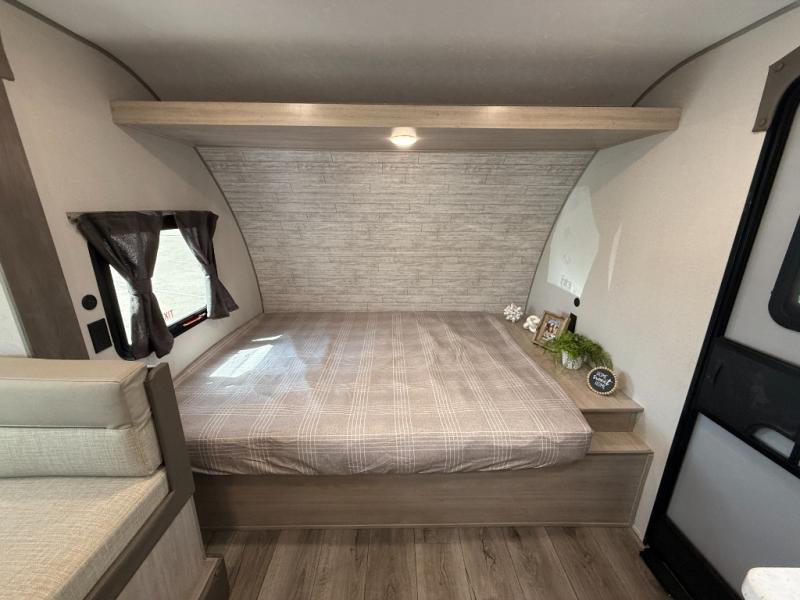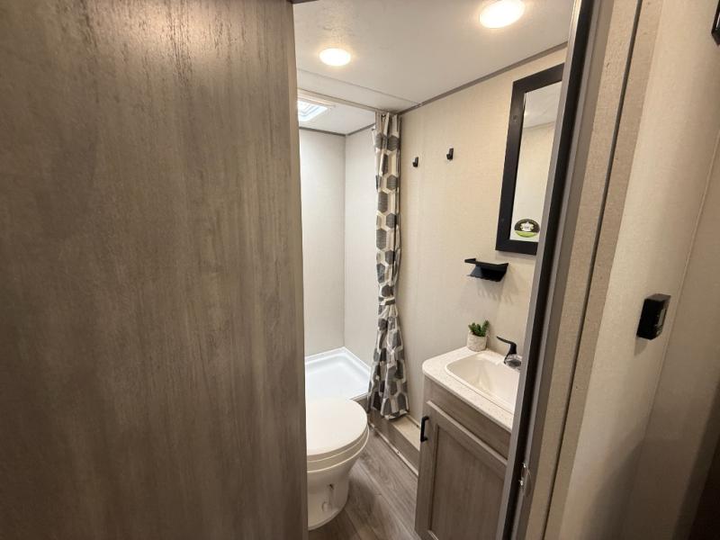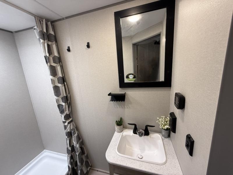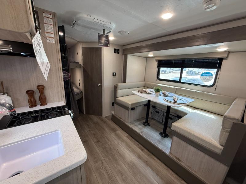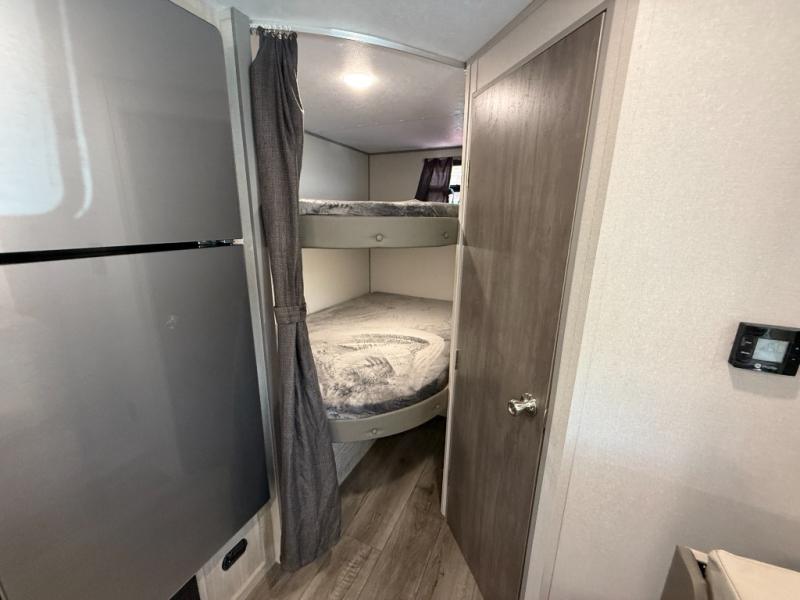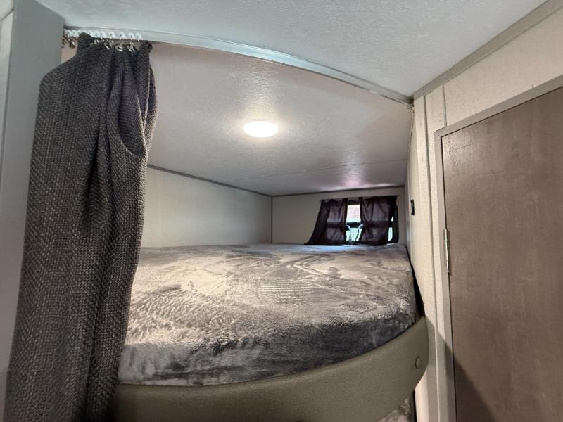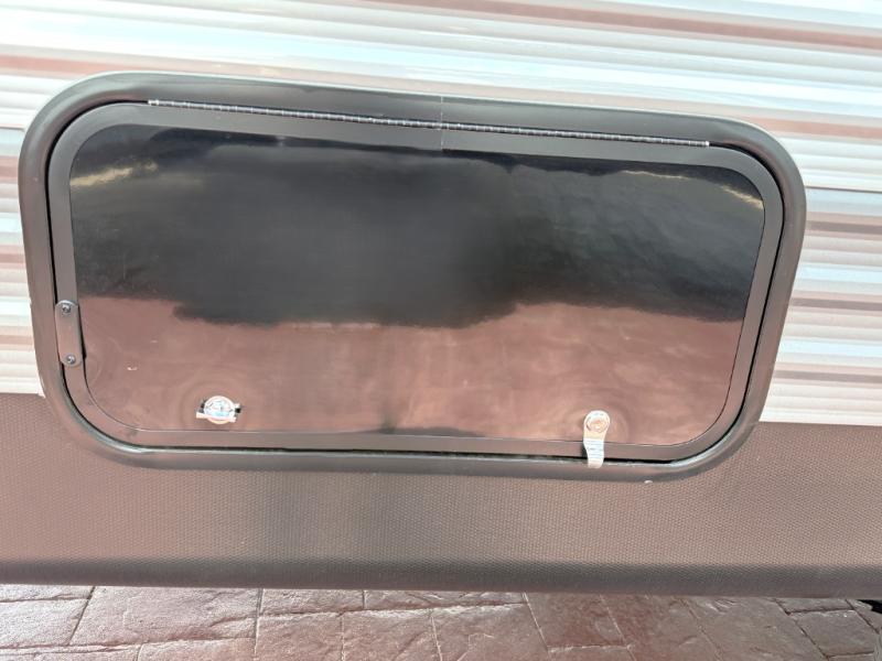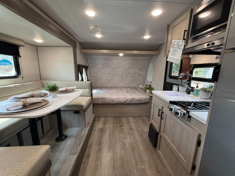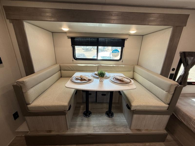 This spacious travel trailer can sleep eight campers each night thanks to the double-size bunks in the back, the U-shaped dinette within the slide out, and the queen bed up front! You can easily make meals for your crew with the two burner cooktop and microwave oven, and leftovers can go in the 10.7 cu. ft. 12V refrigerator! After you've cleaned up in the full bath, head outdoors to relax under the 15' power awning with multicolor LED lights and a remote!