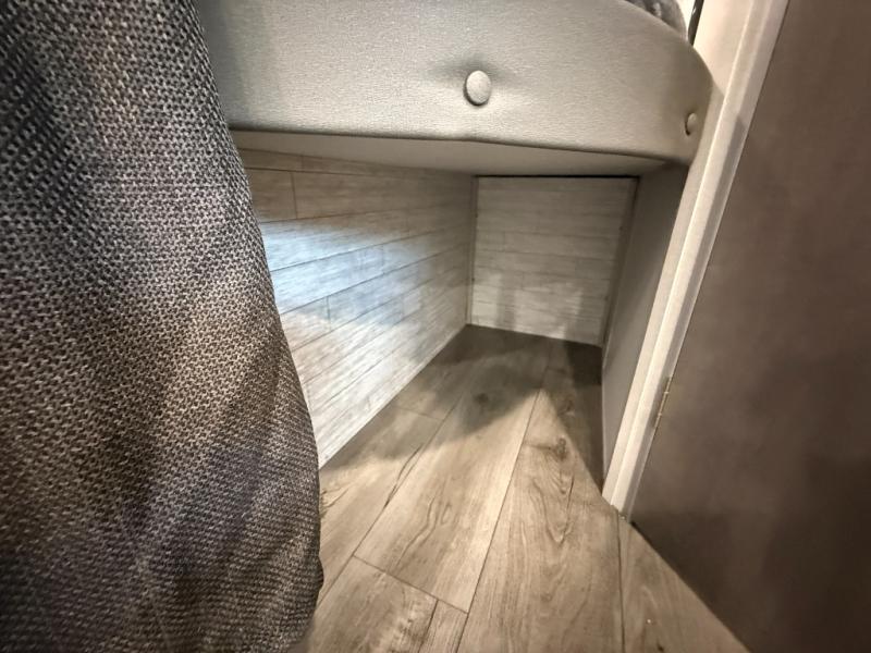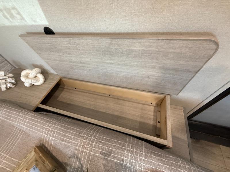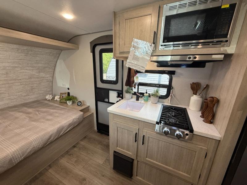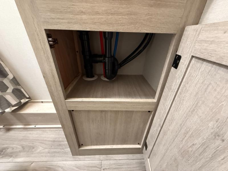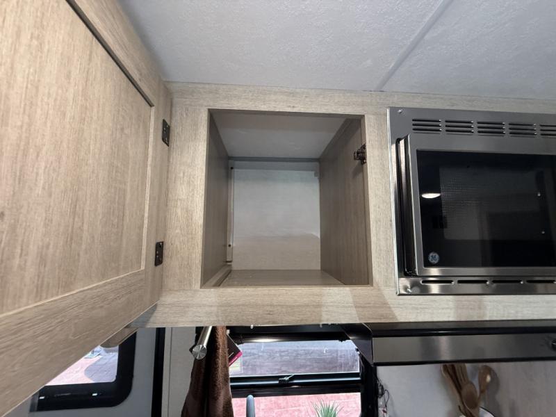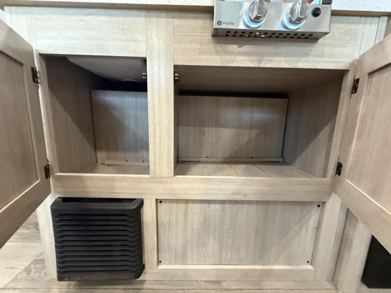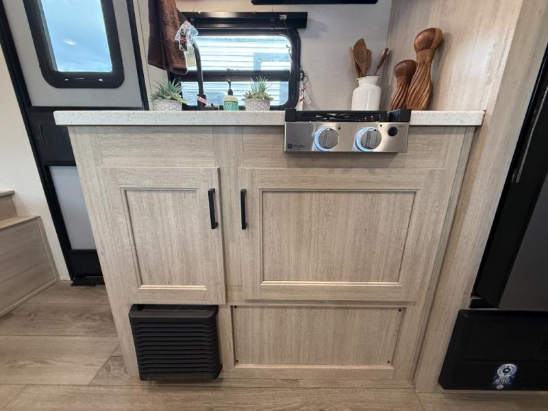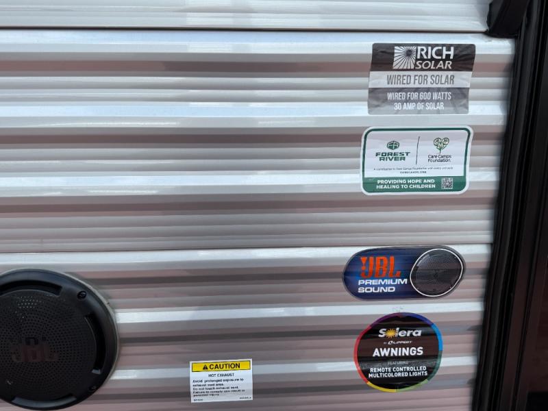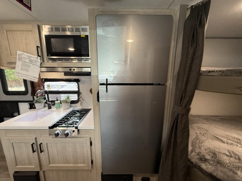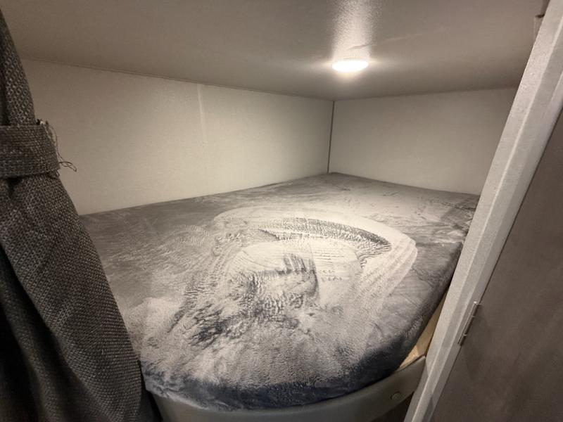 This spacious travel trailer can sleep eight campers each night thanks to the double-size bunks in the back, the U-shaped dinette within the slide out, and the queen bed up front! You can easily make meals for your crew with the two burner cooktop and microwave oven, and leftovers can go in the 10.7 cu. ft. 12V refrigerator! After you've cleaned up in the full bath, head outdoors to relax under the 15' power awning with multicolor LED lights and a remote!