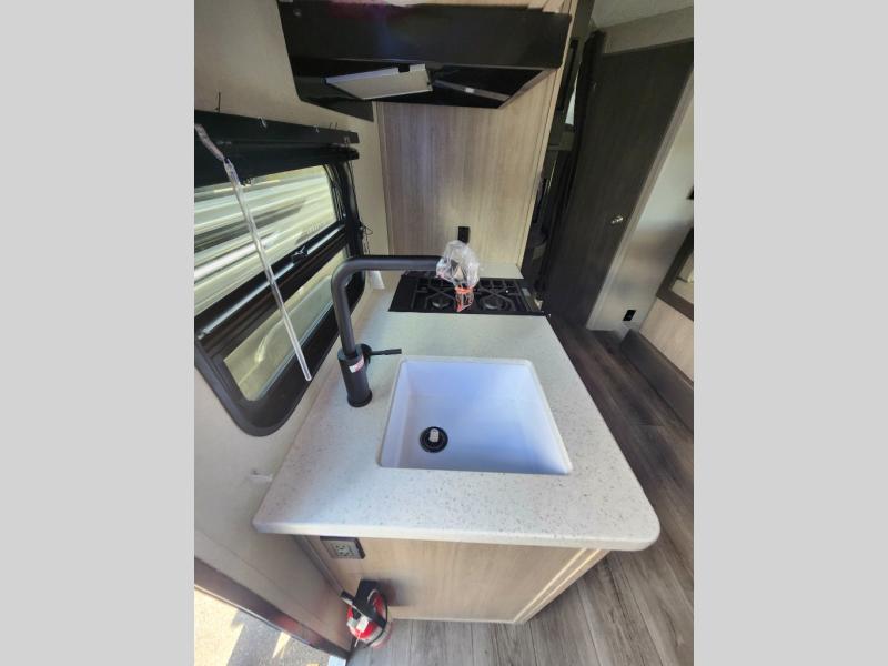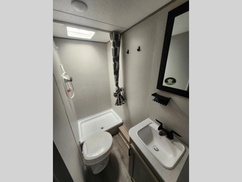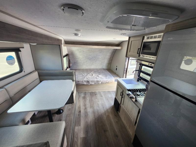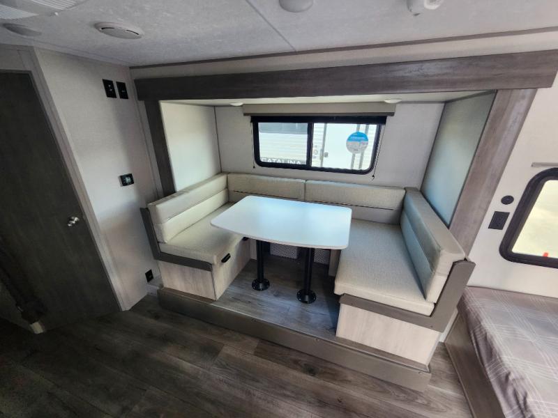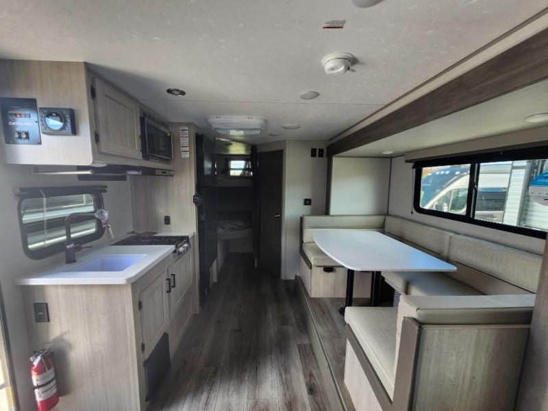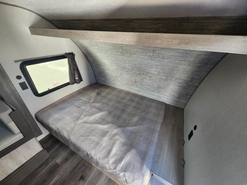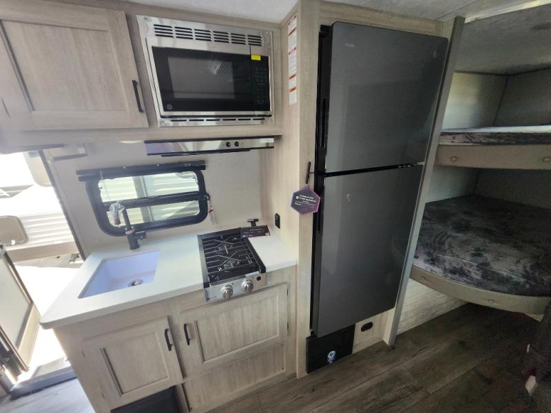 This spacious travel trailer can sleep eight campers each night thanks to the double-size bunks in the back, the U-shaped dinette within the slide out, and the queen bed up front! You can easily make meals for your crew with the two burner cooktop and microwave oven, and leftovers can go in the 10.7 cu. ft. 12V refrigerator! After you've cleaned up in the full bath, head outdoors to relax under the 15' power awning with multicolor LED lights and a remote!