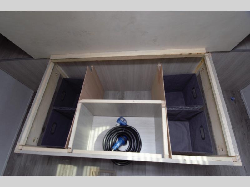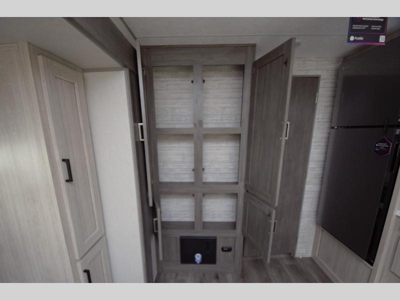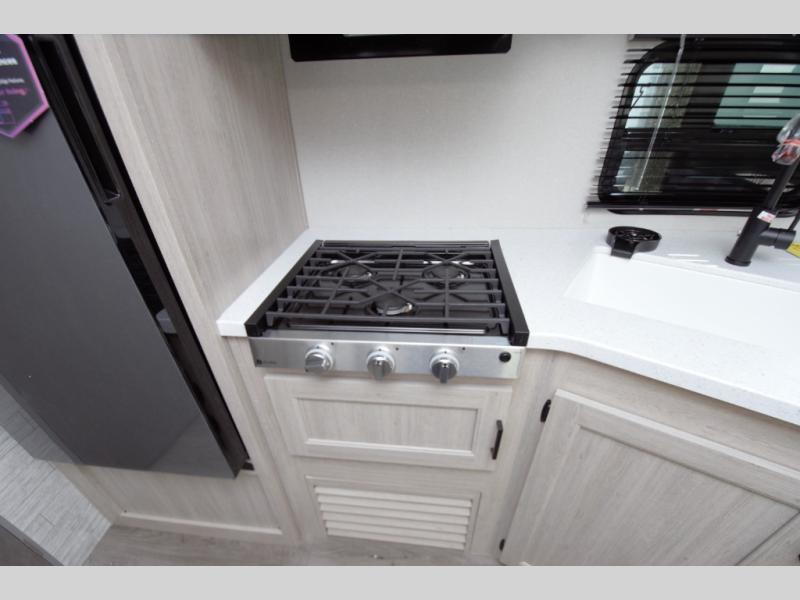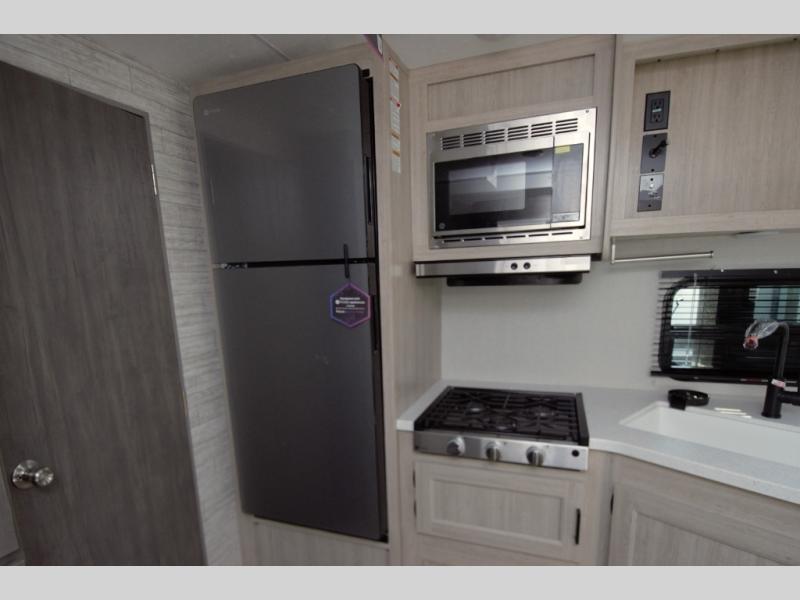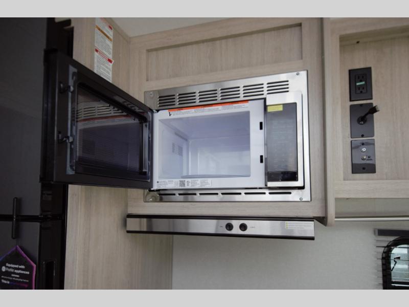 Cook with ease using the GE stainless three burner cooktop, microwave, and large 12 volt refrigerator. The galley style kitchen gives you the space you need to prepare meals without taking up unnecessary room.