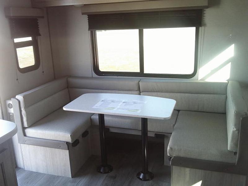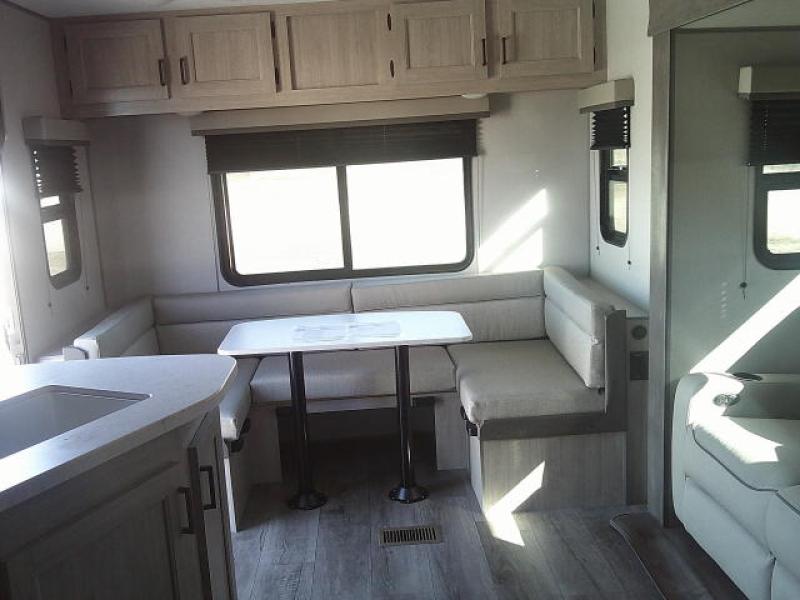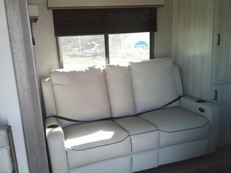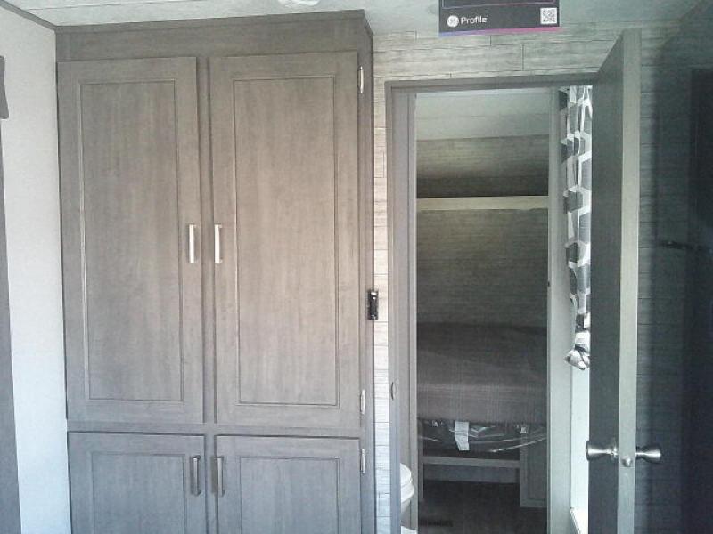 You and your partner will love the layout of this trailer with a walk-through bathroom which is convenient for you when you are in the front bedroom, and handy for your guests when they stay overnight on the U-shaped dinette. The rear U-shaped dinette includes dual end tables to set your drink on, and the theater seating within the slide out will let you relax each evening. The galley kitchen offers all the appliances needed to make all your meals, such as a GE stainless three burner cooktop, a GE stainless microwave, plus a GE stainless 10.7 cu. ft. 12V refrigerator. You will have your own side of the walk-around queen bed and a wardrobe, as well as USB ports and outlets in the nightstands.