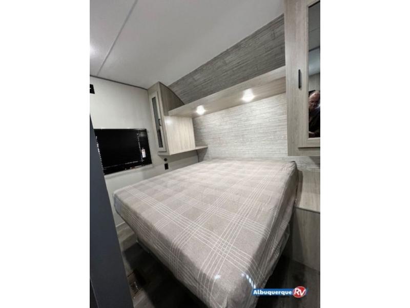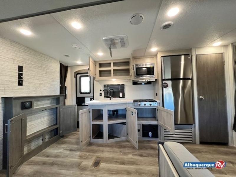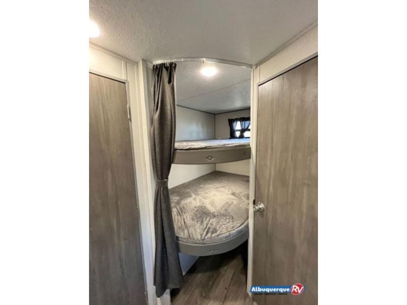 This is the perfect mid-size travel trailer for you and your family! The 46" x 74" double-size bunk beds with lower interior storage offer a comfortable sleeping space for the kids and you will have your own private sleeping space with the 60" x 74" queen bed in the front bedroom. Freshen up each morning in the rear corner bathroom with the tub/shower and a mirror to get ready each morning. You can prepare your best home cooked meals with the GE stainless three burner cooktop and GE stainless 10.7 cu. ft. 12V refrigerator, then enjoy them together at the booth dinette. The sofa is near the entertainment center for a relaxing movie night. Don't leave any of your outdoor gear behind either, thanks to the front pass-through storage area and the exterior outside storage area. You could even add the optional outside camper kitchen to grill the catch of the day on the pull out griddle!