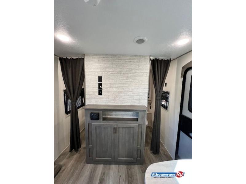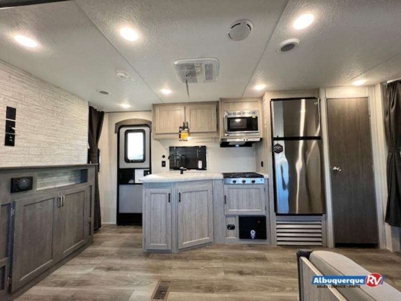 This is the perfect mid-size travel trailer for you and your family! The 46" x 74" double-size bunk beds with lower interior storage offer a comfortable sleeping space for the kids and you will have your own private sleeping space with the 60" x 74" queen bed in the front bedroom. Freshen up each morning in the rear corner bathroom with the tub/shower and a mirror to get ready each morning. You can prepare your best home cooked meals with the GE stainless three burner cooktop and GE stainless 10.7 cu. ft. 12V refrigerator, then enjoy them together at the booth dinette. The sofa is near the entertainment center for a relaxing movie night. Don't leave any of your outdoor gear behind either, thanks to the front pass-through storage area and the exterior outside storage area. You could even add the optional outside camper kitchen to grill the catch of the day on the pull out griddle!