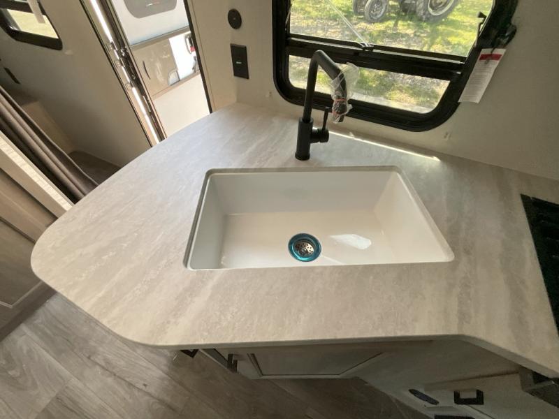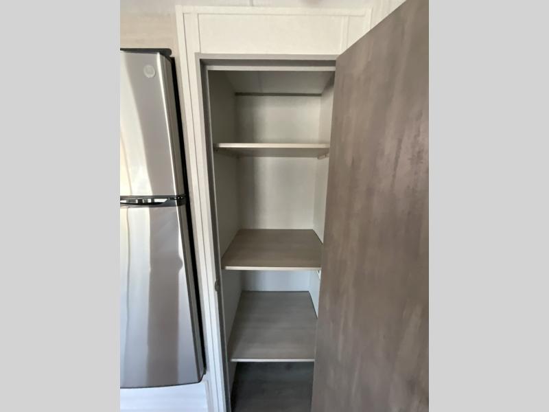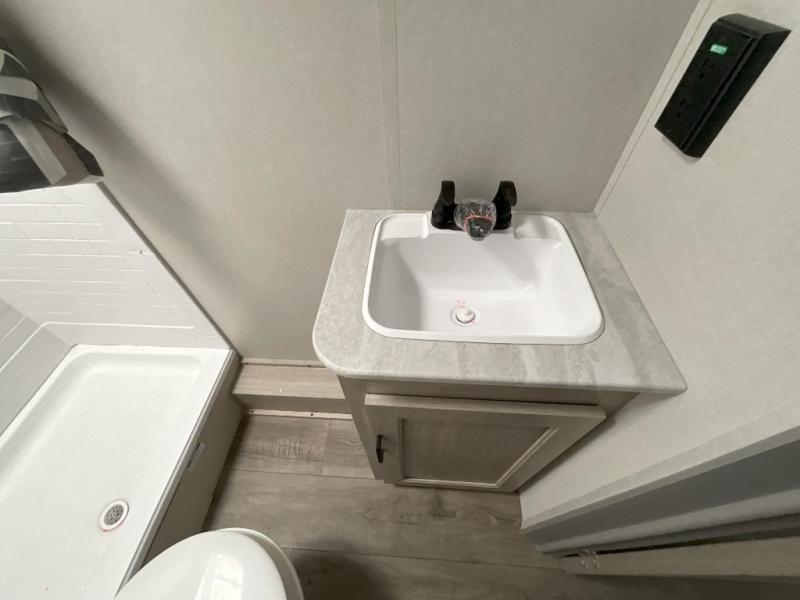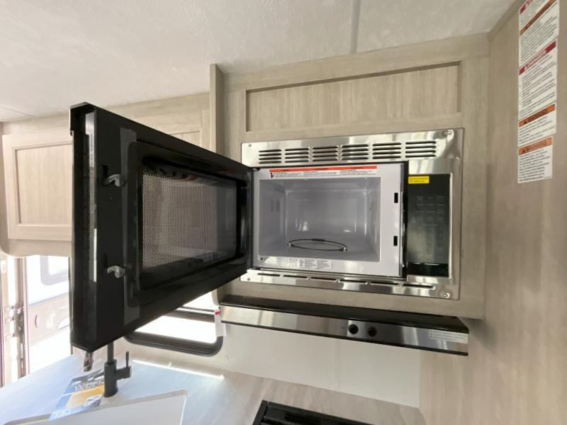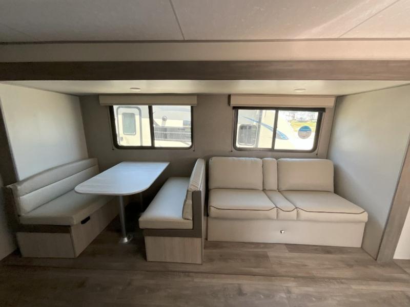 This is the perfect mid-size travel trailer for you and your family! The 46" x 74" double-size bunk beds with lower interior storage offer a comfortable sleeping space for the kids and you will have your own private sleeping space with the 60" x 74" queen bed in the front bedroom. Freshen up each morning in the rear corner bathroom with the tub/shower and a mirror to get ready each morning. You can prepare your best home cooked meals with the GE stainless three burner cooktop and GE stainless 10.7 cu. ft. 12V refrigerator, then enjoy them together at the booth dinette. The sofa is near the entertainment center for a relaxing movie night. Don't leave any of your outdoor gear behind either, thanks to the front pass-through storage area and the exterior outside storage area. You could even add the optional outside camper kitchen to grill the catch of the day on the pull out griddle!