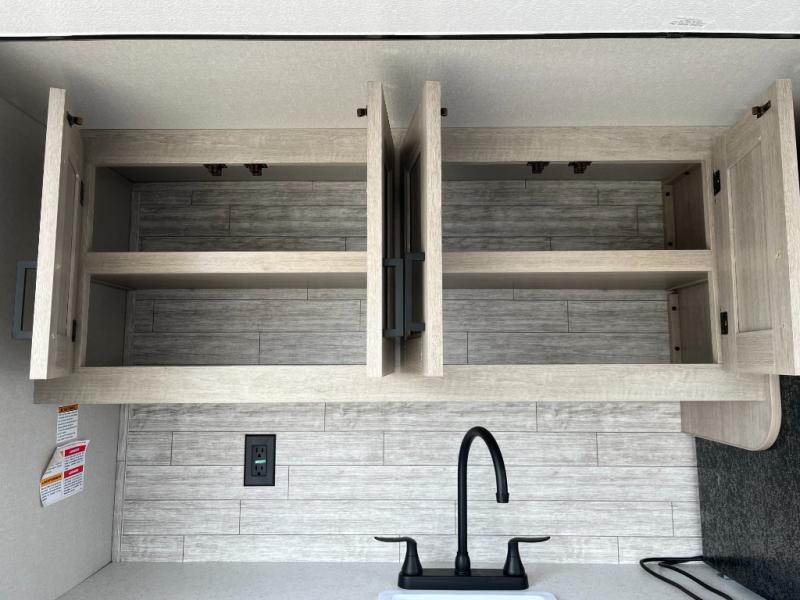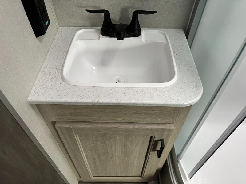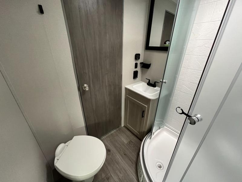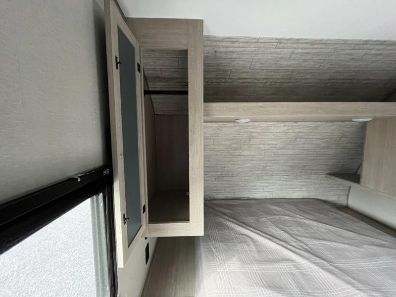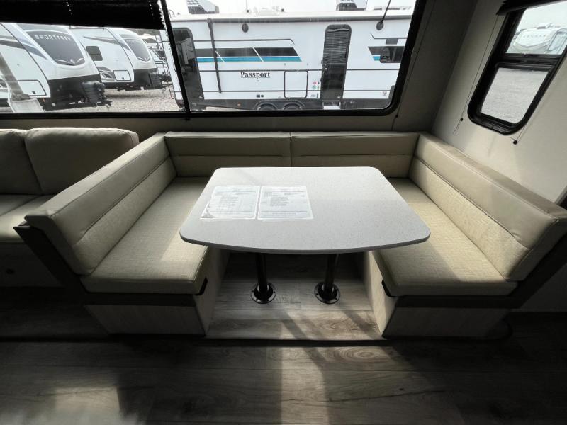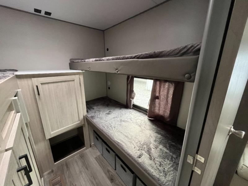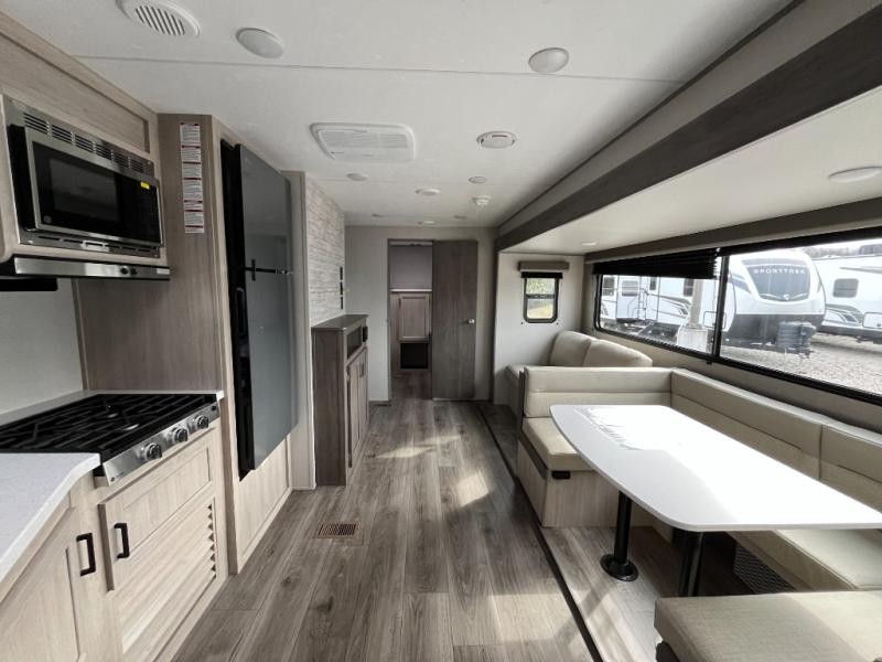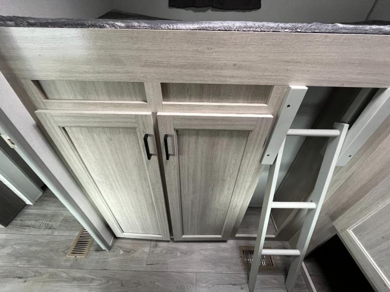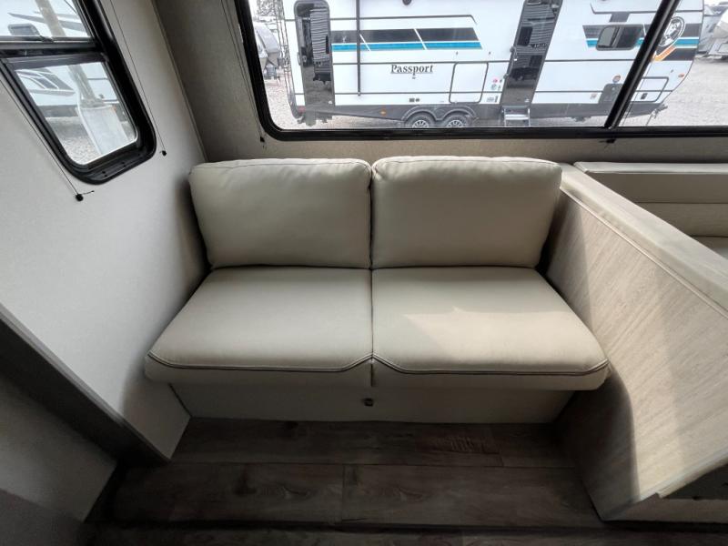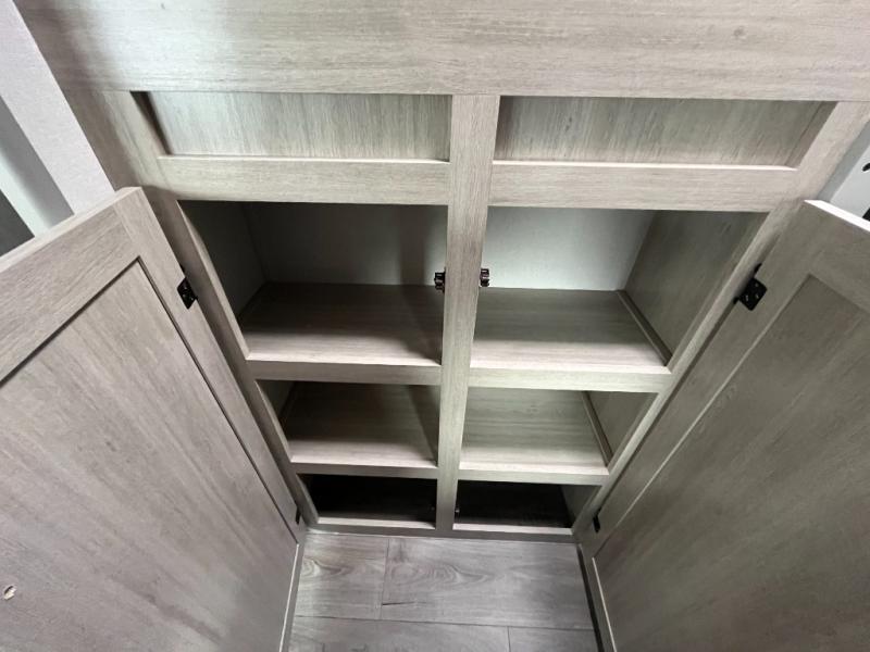 If you enjoy camping with family or a larger friend group, this trailer is sure to meet your needs! The rear private bunkhouse includes single-size bunks plus double-size bunks, allowing you to sleep up to six here alone! You'll have the 60" x 74" queen bed all to yourselves in the front master bedroom, and any additional guests can sleep on the U-shaped dinette and sofa within the large slide out. The chef of your group can use the GE stainless three burner cooktop or microwave oven to create meals each day, and an optional full-size exterior camp kitchen can be added if you enjoy cooking outdoors. A walk-in pantry includes washer and dryer prep if you choose to add these appliances, and everyone can stay clean all week thanks to the dual entry full bath!