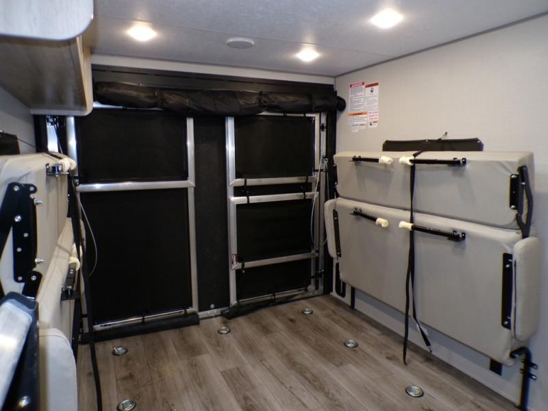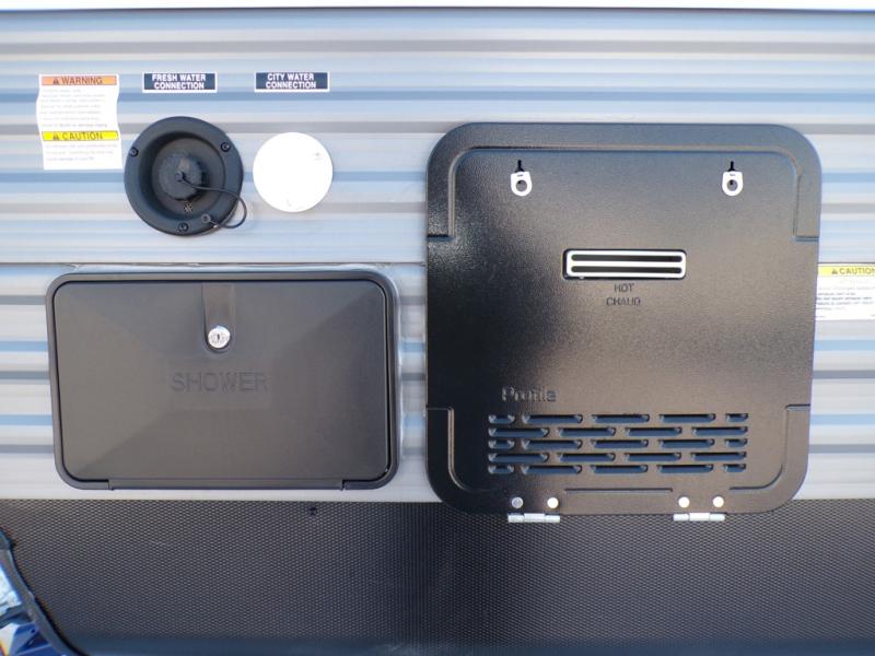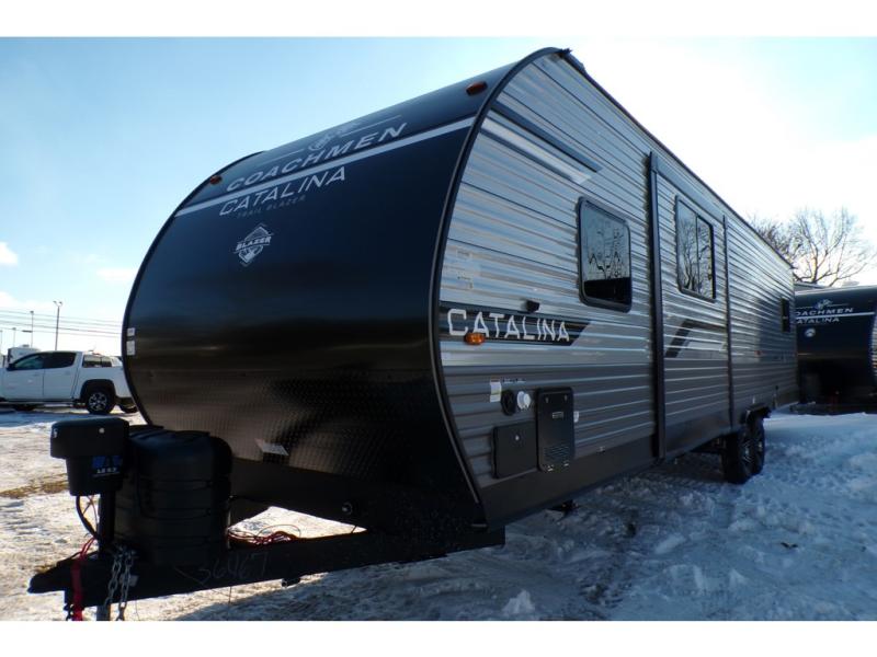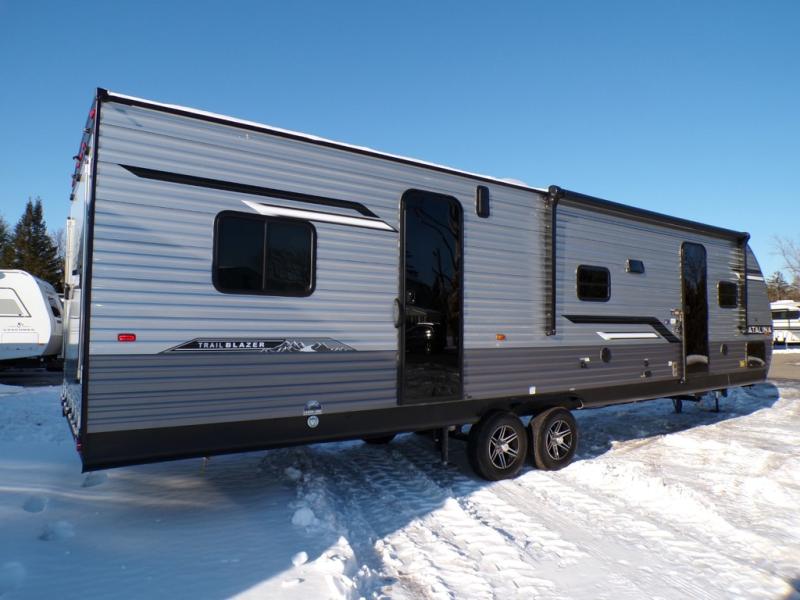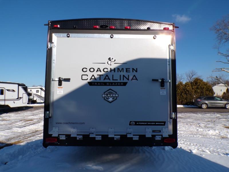 The best looking, most affordable toy hauler is found in the Catalina Trailer Blazer by Coachmen. Each one is constructed with a seamless alpha roof membrane, an enclosed and fully sealed underbelly, and a cambered structural steel I-beam frame for added support. There is a rear loading cargo door with a 3,000 lb. capacity, a black out screen wall with a zip walk-thru and windows, plus 500 lb. tie-downs to secure your toys. You'll love the interior with its Congoleum woodplank linoleum flooring and LED interior lighting. Head outside to find an electric awning with multicolored LED lights and a remote, a 15' Toy Loc cable, a "Leash Link" quick hookup D-ring for pets, and upgraded aluminum wheels. The Catalina Trail Blazer also comes with a JBL Aura Cube media center, plus premium JBL interior speakers for your pleasure!