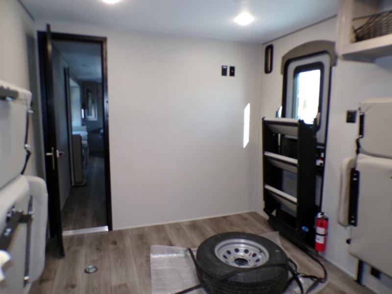You're going to love camping in this dual entry toy hauler! The 11' garage can be shut off from the rest of the unit if your guests want a little privacy, and you can choose the optional party deck to the ramp door for more living space. The full bath includes a tub/shower, a medicine cabinet, plus a shower skylight to let natural light in. Head to the main living area to dine around the U-shaped dinette slide, or call it a night in the front bedroom with a queen bed. And you'll find plenty of storage space for your belongings, including overhead cabinets, dual bedroom wardrobes, plus exterior storage!