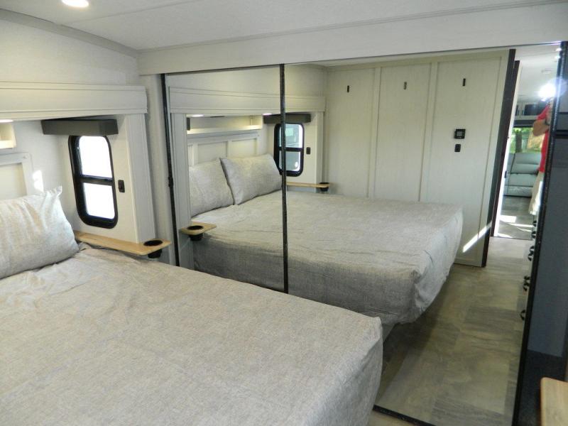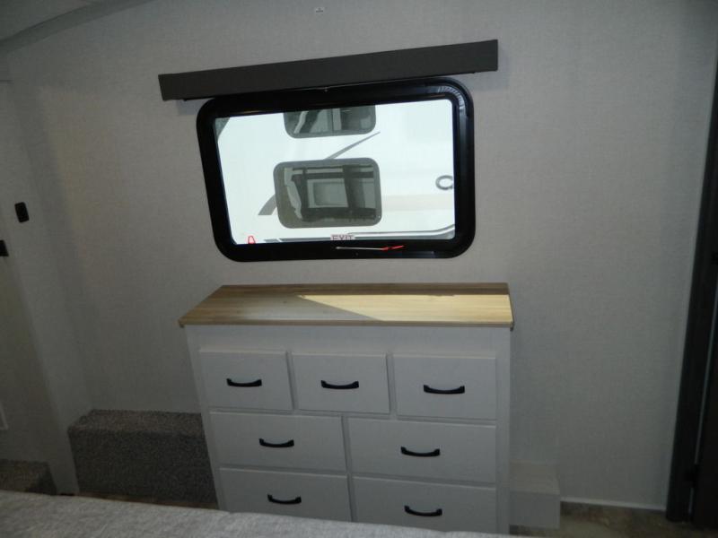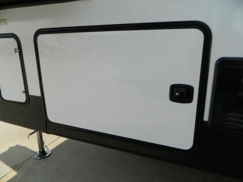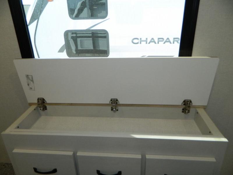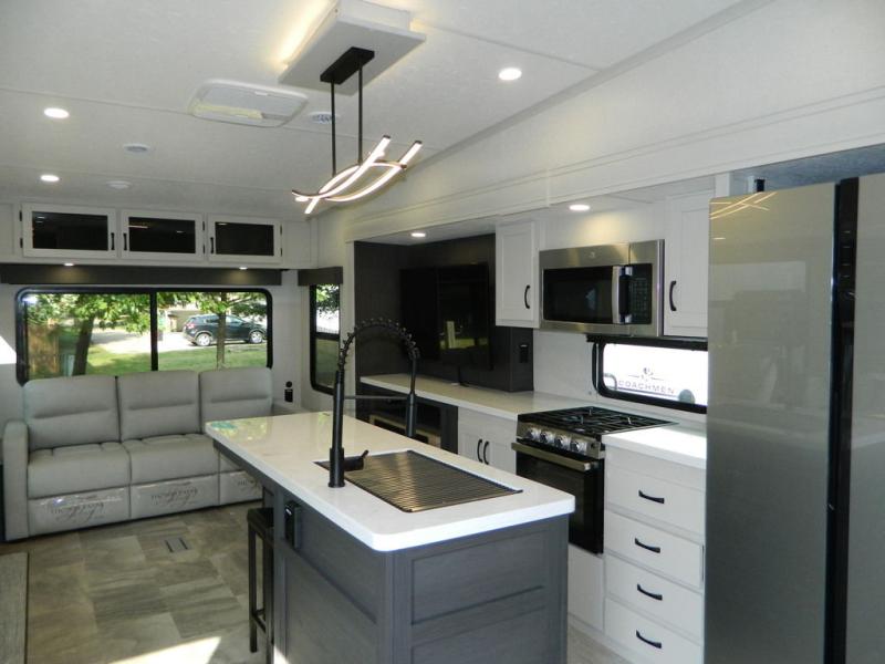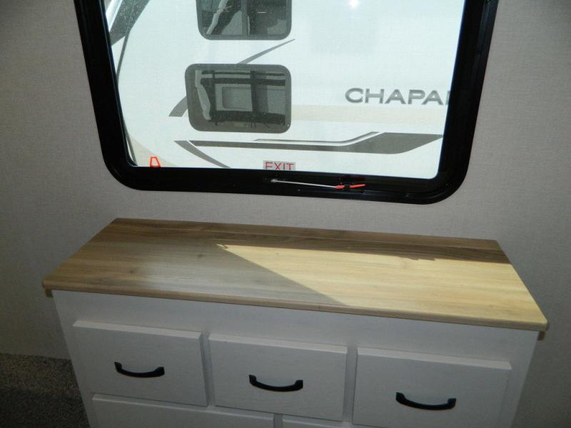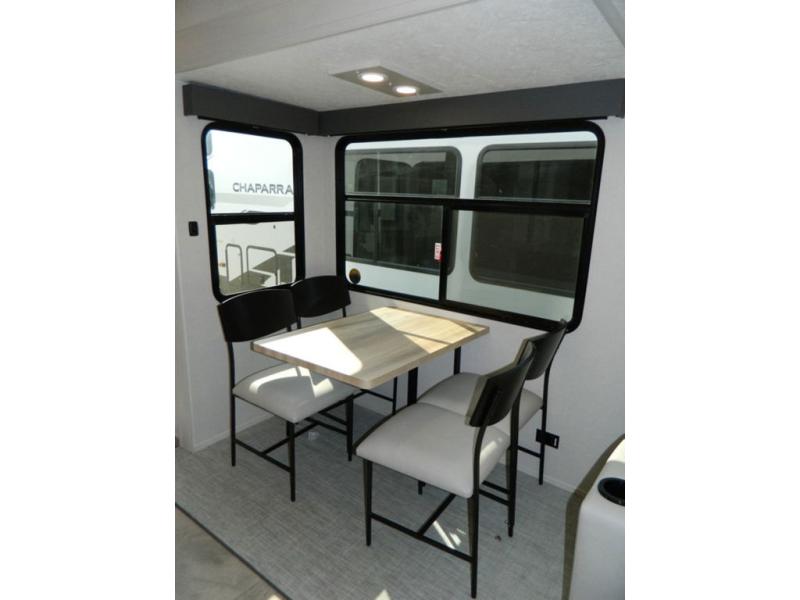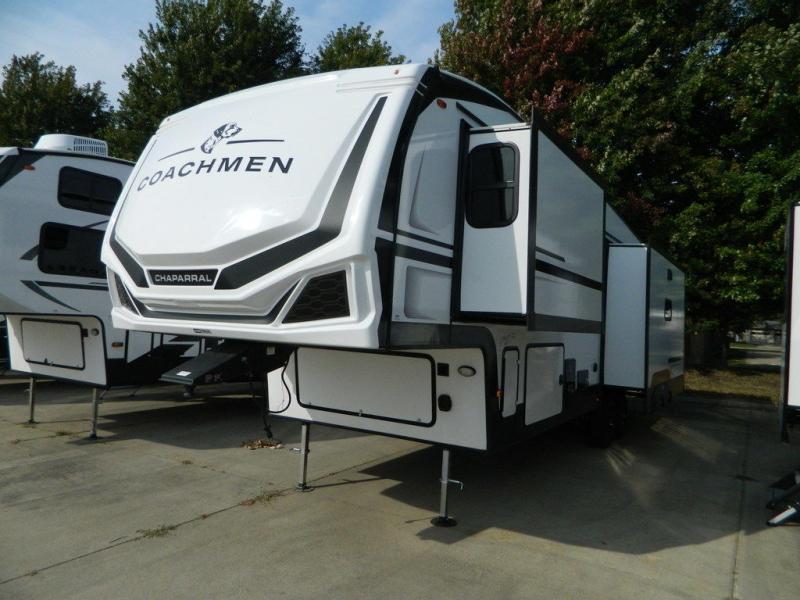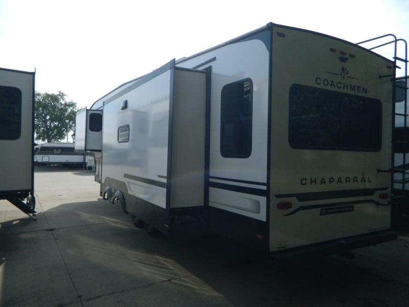 Each Chaparral mid-profile fifth wheel by Coachmen is designed with residential features, loads of storage space, and roomy bedroom suites to make you feel right at home. The durable construction means you can enjoy your RV for years to come. There's 6X double Azdel aluminum cage sidewall system, Weather Shield+ technology, and Tri-Tex powder coated frame technology that will help extend your camping season. Each model includes a Winegard Air 360+ HDTV/radio dome antenna to help keep you connected as you camp, slow rise blackout roller night shades, a new 16 cu. ft. side-by-side stainless glass 12V refrigerator, and a modern electric fireplace to make your space cozy. There is also a large transom window in the kitchen, a modern high-rise faucet, LED motion sensor lights in the bathroom, plus a full-size shower with glass doors and a seat. Now that's what I call luxury! Choose a Chaparral fifth wheel today!