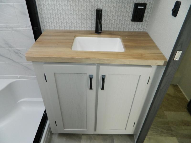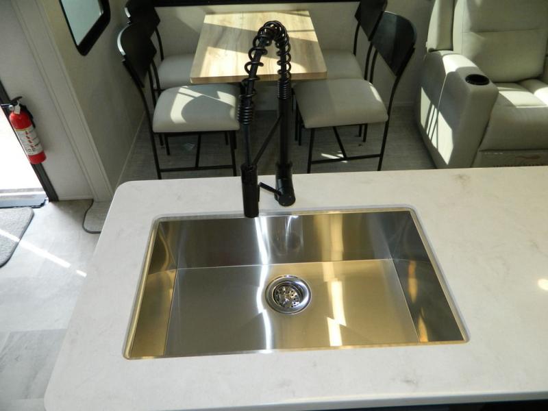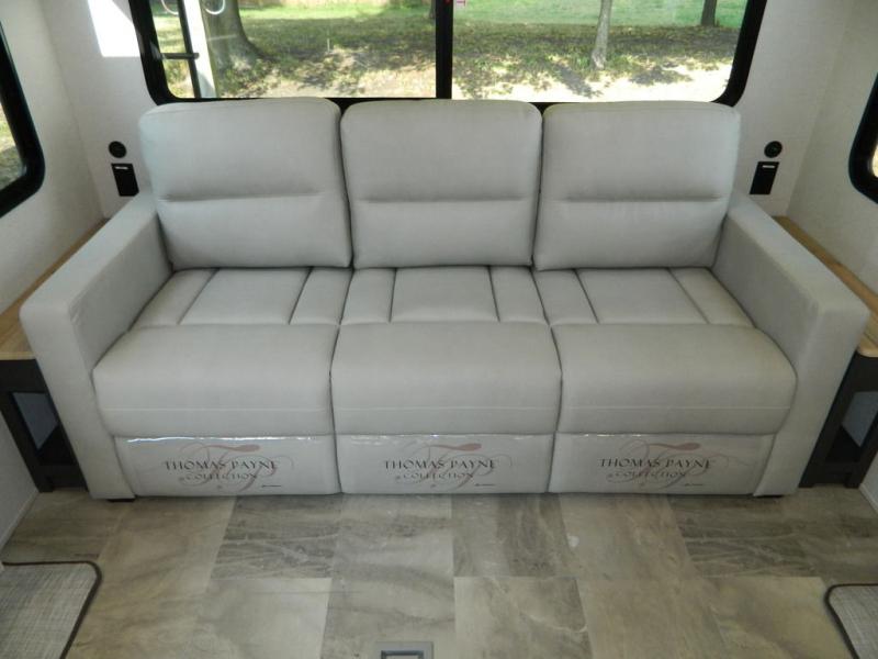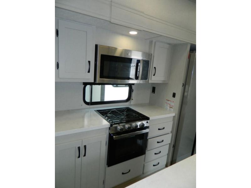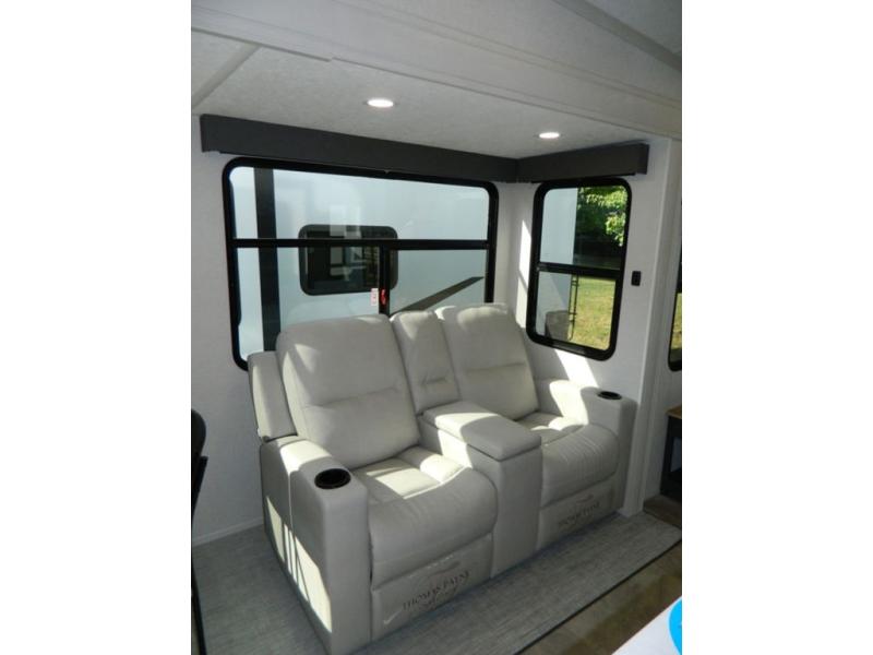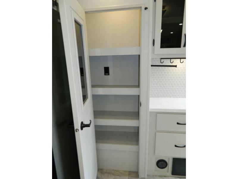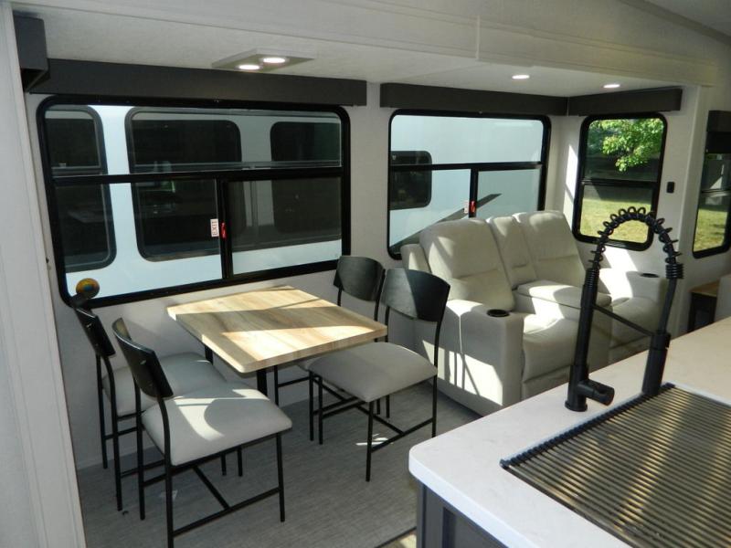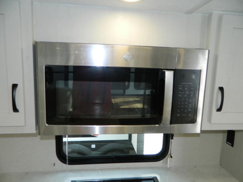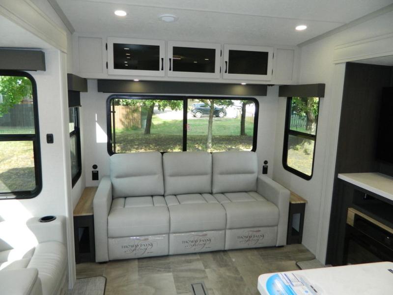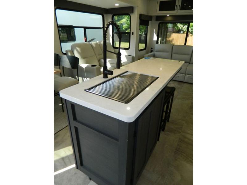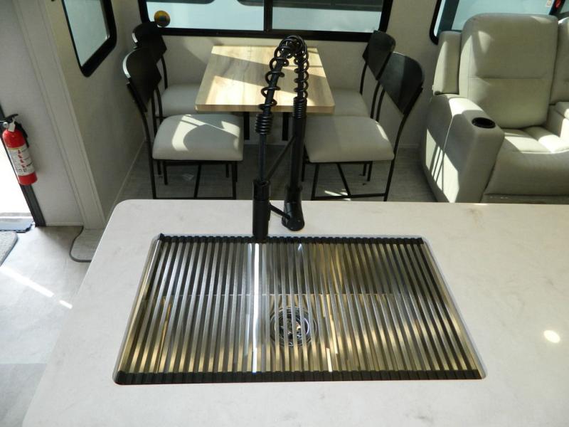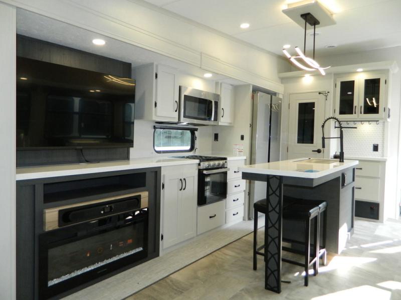 Are you wanting to trade out your busy work weeks for relaxing vacations? This fifth wheel can give you just that! Once you arrive at your destination, set up the 16' power awning with LED lights and enjoy some fresh air before you unpack your bags. The chef can start lunch on the GE Profile 21" oven with a residential cooktop, and there is an island with two barstools if the little ones want to color while they wait on their food. This model also includes a large pantry plus extra counter space with overhead storage for dishes. Everyone can take turns cleaning up in the full bath that includes a spacious shower with a seat and a linen closet to keep clean towels close by. When it's time to call it a night, you'll enjoy the king bed slide out in the front bedroom, while your guests take the rear tri-fold hide-a-bed sofa!